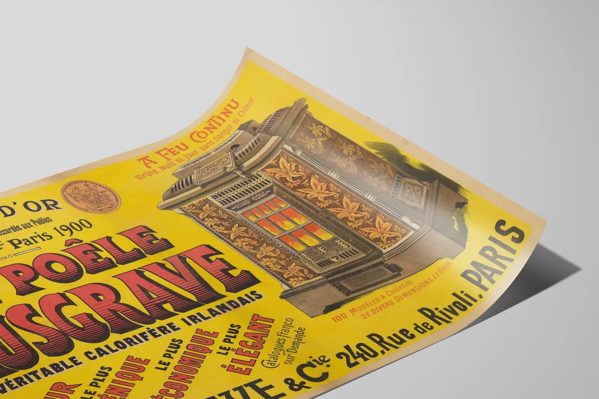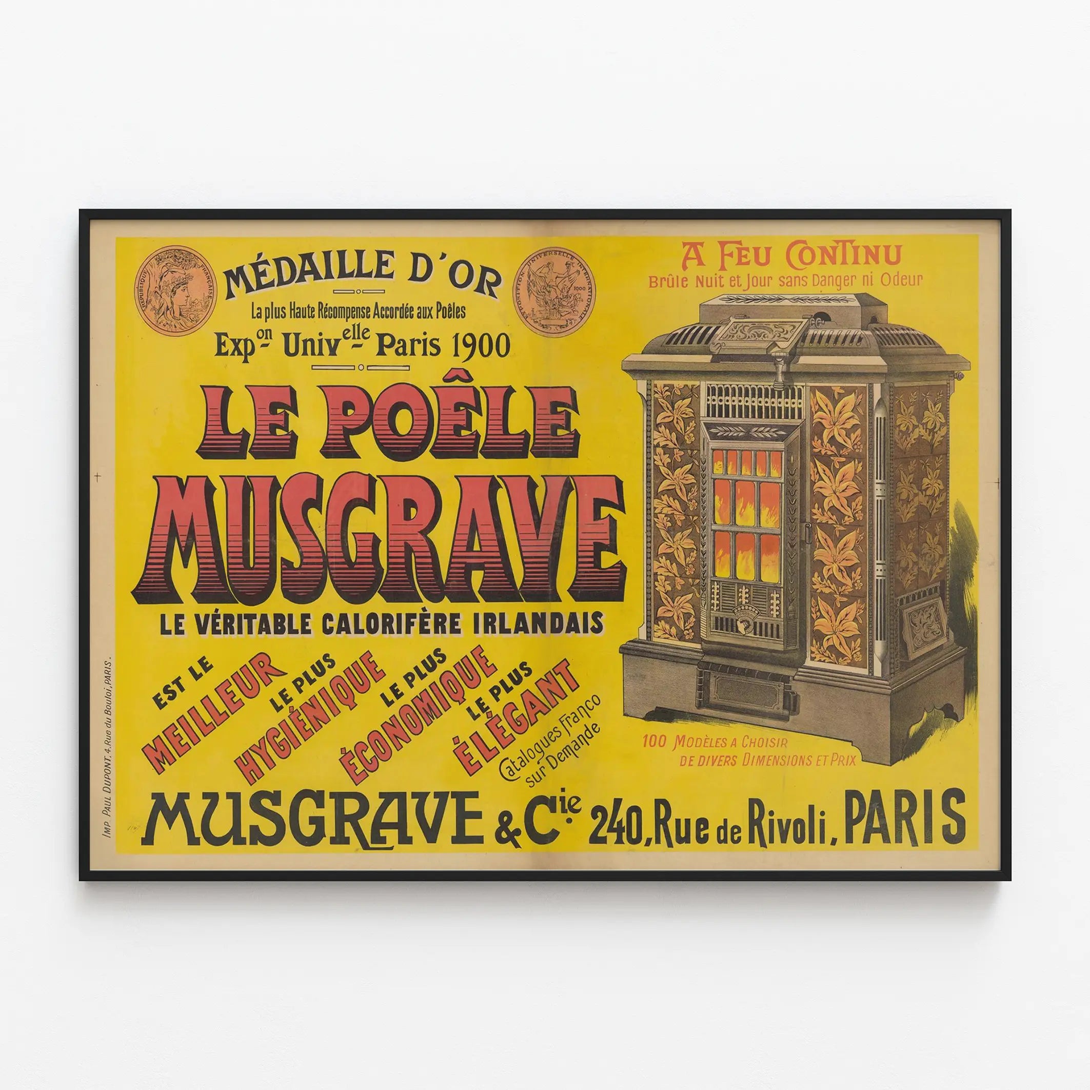 This vintage advertising poster highlights the Musgrave stove, an Irish heater renowned for its exceptional qualities. Intended for wall decoration, this poster adds a touch of authenticity and retro charm to any interior. Printed in an antique graphic style, it presents the stove in detail with its elegant floral patterns and visible fire, symbolizing warmth and comfort. The text emphasizes the advantages of this stove: it is described as the best, most hygienic, economical, and stylish, all awarded a gold medal at the Paris Universal Exposition in 1900. This poster can seamlessly fit into a living room, kitchen, or a space dedicated to vintage decor. It appeals to vintage object enthusiasts and wall art lovers seeking a unique poster full of character and history. With its vivid colors and remarkable typographic style, it also serves as a decorative focal point in a room. In summary, this vintage wall decoration offers a historical nod to a traditional household appliance, while highlighting artistic design and period advertising message, making it perfect for collectors and enthusiasts of authentic decor.