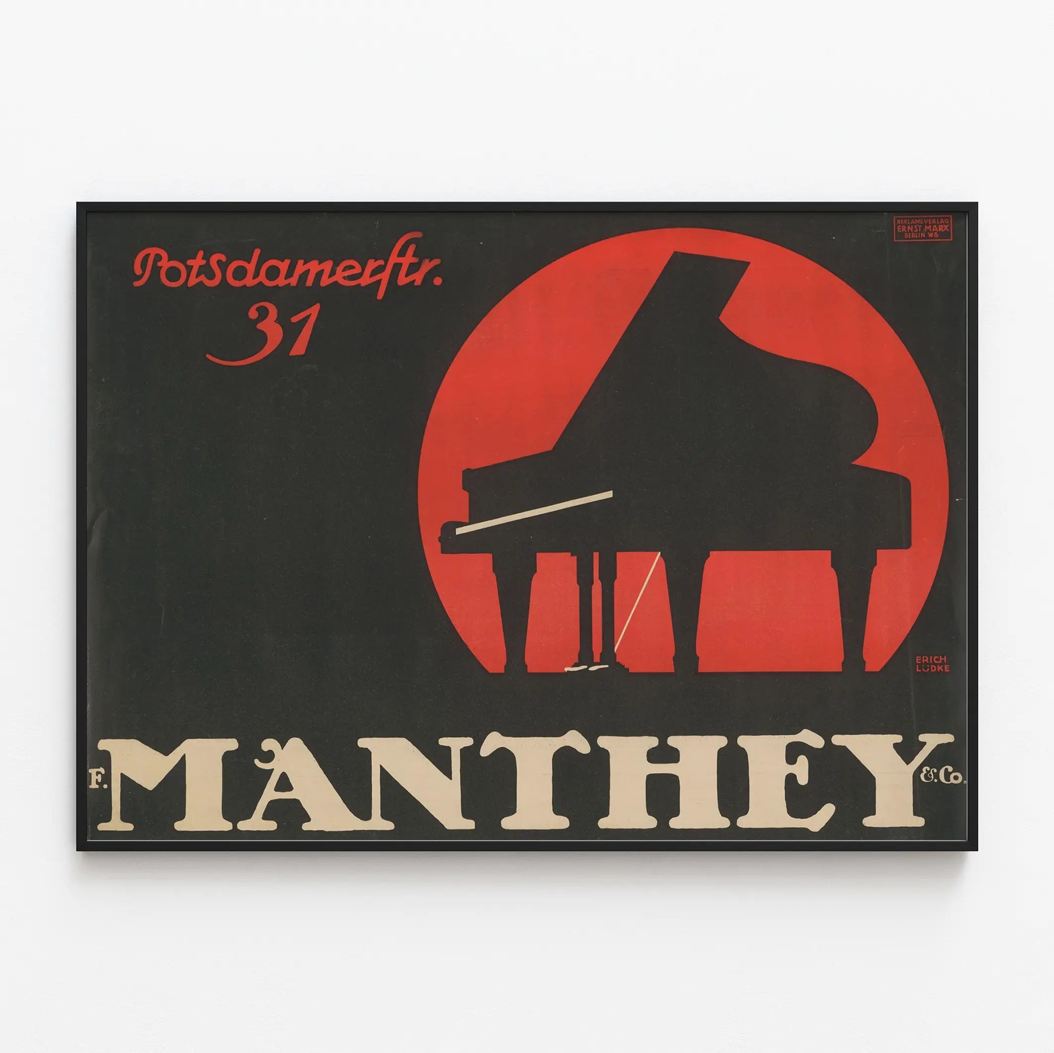 Discover this iconic vintage poster featuring the silhouette of a stylized black grand piano set against a circular red background. This antique advertising print displays the mention “Potsdamerstr. 31” at the top left, indicating an address likely associated with the F. Manthey & Co. business, whose name appears at the bottom in striking white letters on a black background. The graphic composition stands out through its strong contrast between the vivid red and deep black, evoking an elegant retro aesthetic, perfect for an original wall decoration. The simplicity of the shapes and the balanced layout add a touch of authenticity and vintage charm to any interior. An ideal wall poster for music and vintage design enthusiasts, this print seamlessly fits into a living room, office, or music room, offering a visual dialogue between art and musical culture. With its clean lines and old-style typographic design, this wall ornament is both an artistic and evocative decorative piece, perfect for enriching a wall with a touch of history and character. A wall picture that captures nostalgic memories of the past, creating a warm and sophisticated atmosphere through its color scheme and iconic graphics.