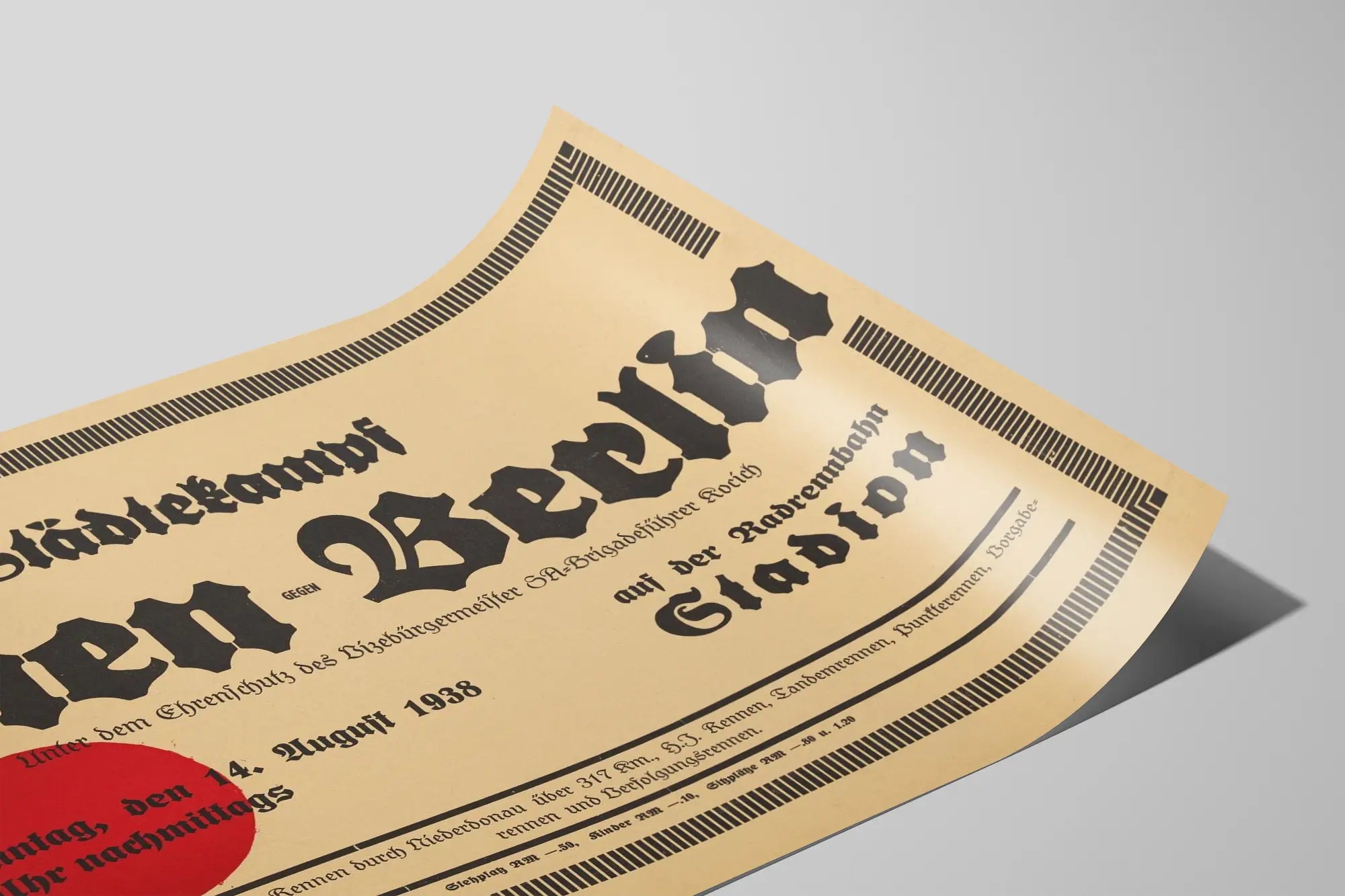 This vintage poster titled « Rad-Stadtekampf Vienna against Berlin » captures a historic sporting event, a cycling competition between the cities of Vienna and Berlin dating from August 14, 1938. This poster represents an original and iconic wall decoration for enthusiasts of history, sport, and graphic design from the early twentieth century. With its beige background and black Gothic typography, this typographic artwork adopts a distinctive retro style that is easily recognizable. This wall decoration highlights the names of the cities in large Gothic characters, with a strong contrast created by a simple red circle reminiscent of the graphic codes used at that time. The composition is framed by a black geometric pattern recalling Art Deco aesthetics, thus enhancing its appeal as a decorative wall element. The poster announces a track cycling race (« Radrennbahn Stadion ») including various types of races, such as American-style races, tandem races, and pursuit races, making it a valuable testimony to the cycling sporting events of that era. This poster is a unique piece that will naturally find its place in vintage wall decor, bringing a touch of authenticity and history. It appeals both to collectors of old posters and to lovers of wall decoration seeking a distinctive retro design and an original sporting theme. Whether for a contemporary interior or a space dedicated to cycling sports, this artwork with its clean, powerful lines will evoke an atmospheric period feel while captivating with its graphic simplicity. This historic poster is printed on sepia-toned paper, giving a warm aspect to your interior decoration. The balance between text and space, along with the choice of vintage fonts, makes it a true wall art piece designed to adorn a wall with character. It is a perfect decorative object for an office, a gym, a vintage-themed café, or a living room, adding a touch of European history to the decor. Treat yourself to this rare and authentic poster to enrich your collection of unique and meaningful wall decorations. Perfect for cycling enthusiasts, lovers of vintage graphic art, and European heritage, this wall image combines aesthetic appeal with historical memory with elegance.