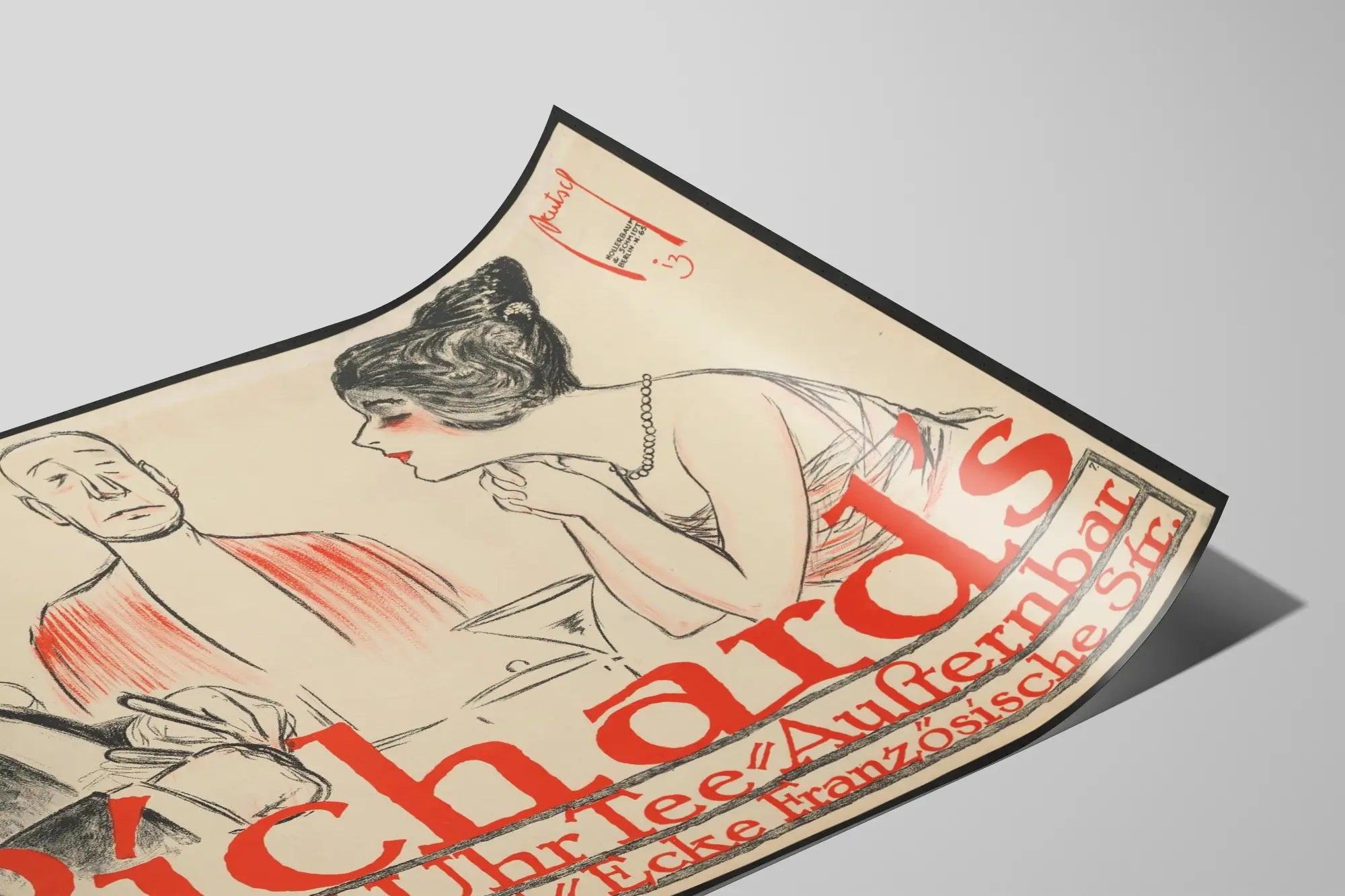 This vintage poster titled "Richards Grill Drei Gäste am Tisch" depicts an elegant and charming scene, perfect for wall decor with a retro and sophisticated style. Three characters are gathered around a table, paying homage to the unique atmosphere of an old-fashioned restaurant or bar. The drawing, both simple and expressive, is primarily rendered in shades of black and white with touches of red, highlighting the features of the characters and the text. The figure on the left, stout, has a serious expression while holding cutlery; the one in the center appears contemplative; and the woman on the right, elegantly coiffed and wearing a pearl necklace, gazes at her companions with a knowing look. In the background, a simple-designed carafe and a cocktail glass add a touch of conviviality to the composition. A handwritten inscription frames the drawing, with the name "Richards" in bold red letters, followed by details about the establishment "Grill '5 Uhr Tee' Oyster Bar" and its address. This poster is ideal for enriching an interior with an artistic touch reminiscent of the charm of old bistros or historic cafés. Whether in a living room, dining area, office, or commercial space, this vintage print will become a focal point of wall decoration, captivating the eye with its graphic style and warm atmosphere. Its size and neutral colors allow for easy integration into various decor styles, combining elegance with a hint of nostalgia. For wall decoration enthusiasts, this printed artwork can be adapted to multiple formats and finishes, whether as posters printed on museum-quality paper or framed works for a more refined presentation. This graphic classic, though understated, tells a timeless visual story that perfectly suits environments that celebrate art and conviviality in everyday life.