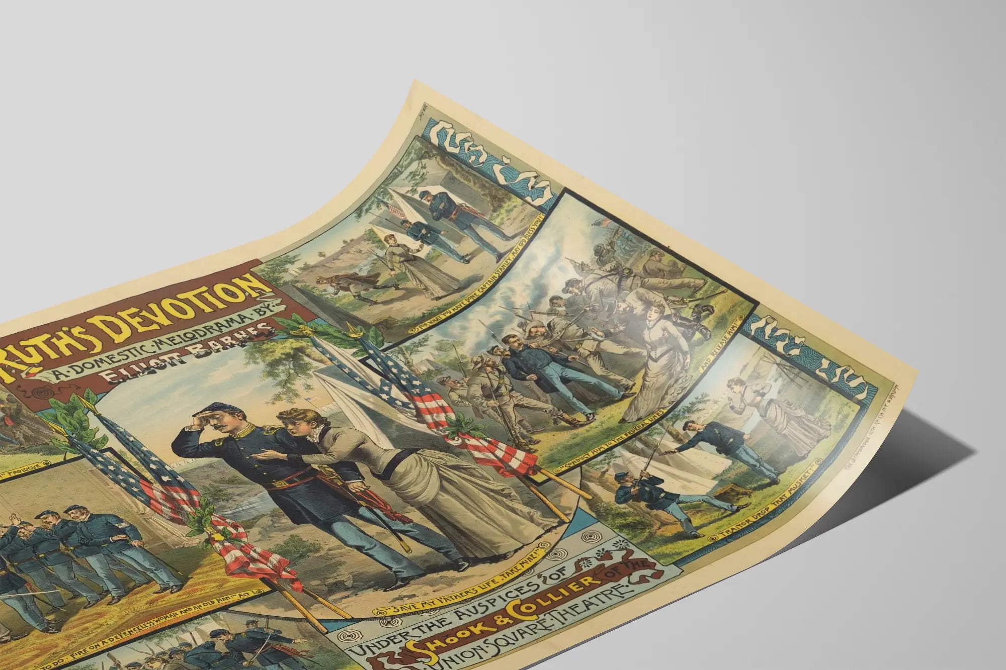 This vintage poster titled "Ruth's Devotion" is a captivating decorative piece depicting a domestic melodrama written by Elliott Barnes. Perfect for original wall decor, this poster features a series of dramatic and historical scenes illustrated with a classic narrative style. At the center, a military couple stands surrounded by two American flags, a strong symbol of dedication and sacrifice, a major theme of the melodrama. Around this central image, six vignettes frame the main scene, each illustrating a key moment in the story with characters in military uniforms, armed bands, and emotional interactions between civilians and soldiers. The inscriptions beneath each vignette complete the reading of the poster, with phrases such as "Save my father's life, take mine!" or "Don't kill me, Massa, I'm innocent!" which help immerse the viewer in the dramatic intensity of the play. The typical colors of the period, soft and slightly faded, give an authentic retro charm that will delight enthusiasts of historical or vintage wall decoration. This poster is ideal for adorning a wall in a living room, office, or library, adding a unique artistic and narrative touch. Available in poster format, it is a fine tribute to the performing arts and theater, while offering an evocative aesthetic of domestic tensions and dedications related to the military context. Enhance your interior with this wall decoration, rich in history and visual emotion.