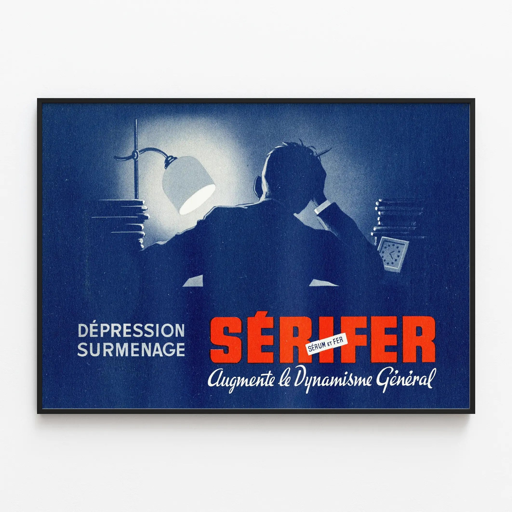 Discover this vintage poster full of character, perfect for an original wall decoration. This antique advertising print features the image of a man from behind, sitting at a desk illuminated by a lamp, suggesting fatigue and overwork. The choice of deep blue and bright red colors creates a striking contrast that immediately captures the eye. This poster highlights the product called "Sérifer" – a blend of serum and iron, praised here for “enhancing overall vitality.” The retro graphic style and dark ambiance of this poster add a touch of elegance and nostalgia to any space. As wall decor, this vintage picture is ideally suited for an office, living room, or workspace, reinforcing a professional and inspiring atmosphere. The eye-catching phrase "Overwork Depression" recalls issues related to energy and vitality, offering a remarkable nod in interior decoration. This sleekly designed poster with a refined aesthetic will make a unique addition to your wall decor collection or serve as a centerpiece in a retro or industrial style. Perfect for those who appreciate decorative objects with a story or a strong visual identity, it combines art and a powerful message. This vintage wall picture is an excellent choice to revitalize your walls while adding a touch of authenticity and character to your interior.
