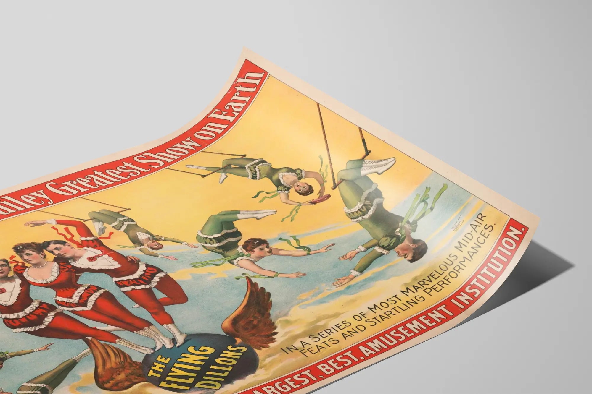 Discover this captivating vintage poster featuring the Flying Dillons, trapeze acrobats in a spectacular show presented by the renowned Barnum & Bailey, 'The Greatest Show on Earth'. This colorful print depicts an impressive aerial performance with multiple artists dressed in traditional costumes from past eras, suspended in the air and demonstrating remarkable acrobatic feats. The design emphasizes the importance and grandeur of the spectacle, regarded as the world's greatest entertainment institution. Perfect for themed wall decor, this poster adds a touch of circus history and traveling showmanship to your interior, ideal for infusing a vintage and lively atmosphere into your space. Whether for a personal collection, artistic decoration, or retro ambiance, this visual artwork poster captures the bold spirit and magic of old-school circus entertainment. An excellent choice for all wall decor enthusiasts seeking to combine vintage charm with festive energy in their home or workspace.