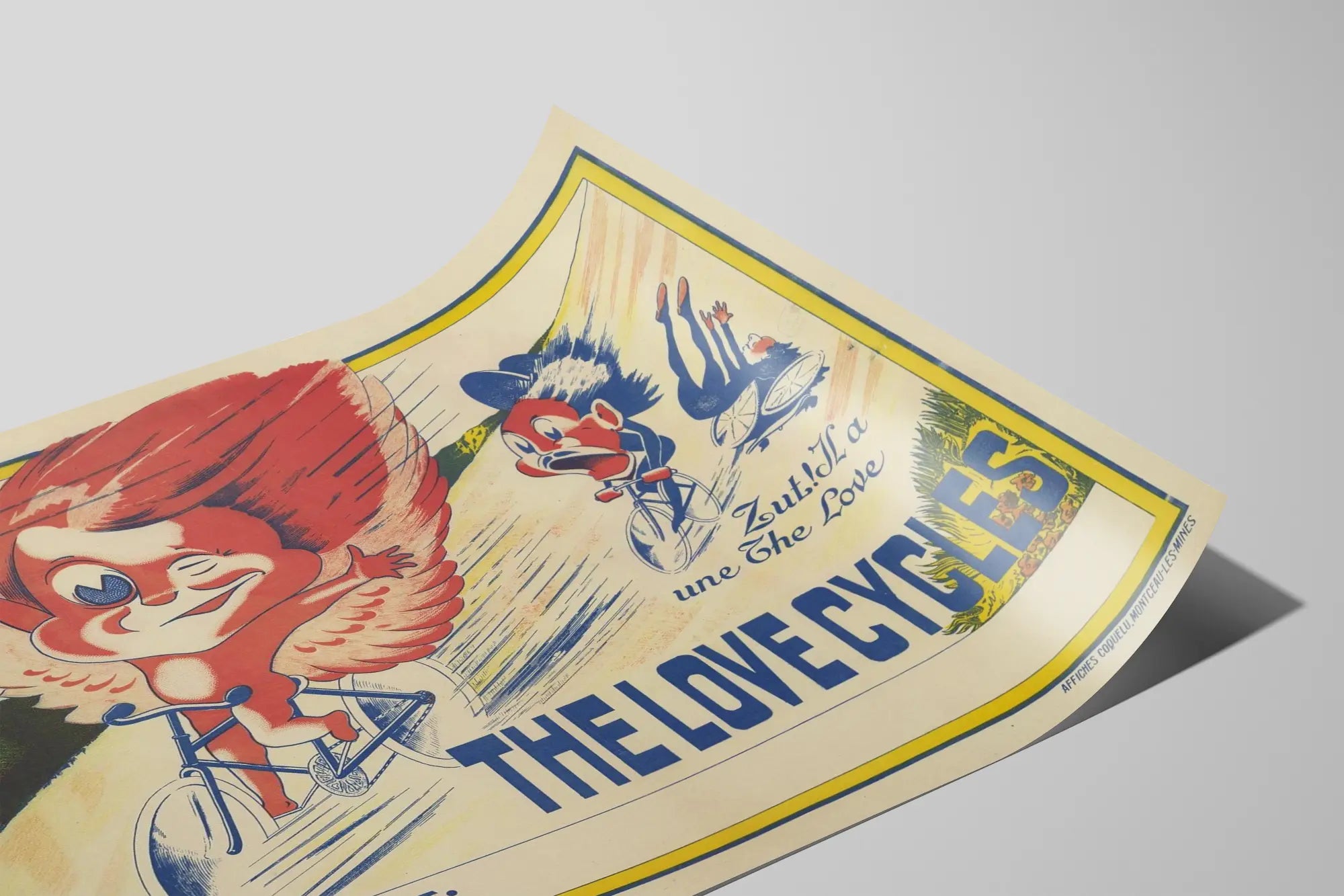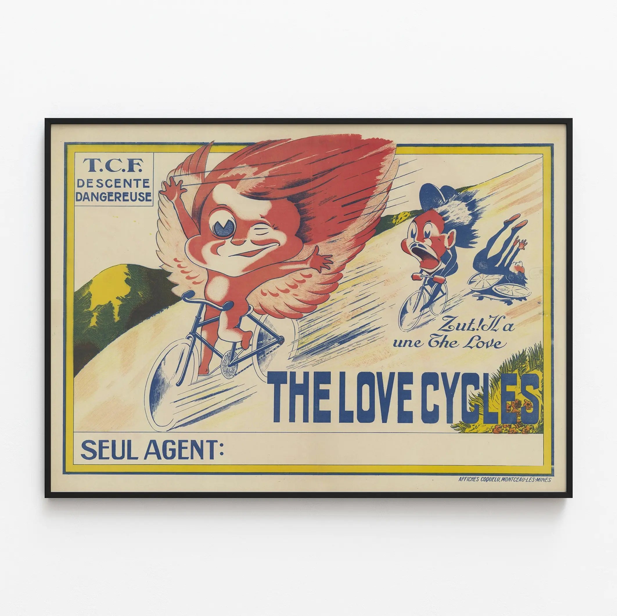 This vintage color poster humorously and dynamically depicts a cycling race scene characterized by a dangerous downhill. In the foreground, there is a caricatured figure with exaggerated features, large eyes, and red wings, riding a bicycle with a mischievous expression and a wink. In the background, another character appears to lose control of their bicycle, illustrating the risks of this rapid descent. The uppercase text "THE LOVE CYCLES" emphasizes the central theme of the scene, while other inscriptions like "T.C.F. DANGEROUS DESCENT" warn about the perilous nature of the race. The yellow frame surrounds the entire composition, giving it a framed and finished appearance. This poster plays on the illustration of speed and adventure on a bicycle, with a touch of humor and caricature that makes it a unique element for wall decoration. Perfect for vintage cycling enthusiasts, retro poster lovers, or those seeking an unusual artwork to brighten up an interior with a lively, dynamic scene. This visual invites you to dive into the quirky universe of cycling races of yesteryear. Its graphic style captures the eye and will be a focal point in a living room, office, or gym, bringing color and movement to wall decor. The poster also offers a balanced design between text and image, combining informative content with expressive drawings. Its printed format on poster paper is ideal for themed exhibitions or to decorate a personal or commercial space related to sport, cycling, or leisure activities. In sum, this wall decoration is an original choice for vintage poster enthusiasts and quirky illustrations who wish to add a touch of originality and nostalgia to their interior decor.