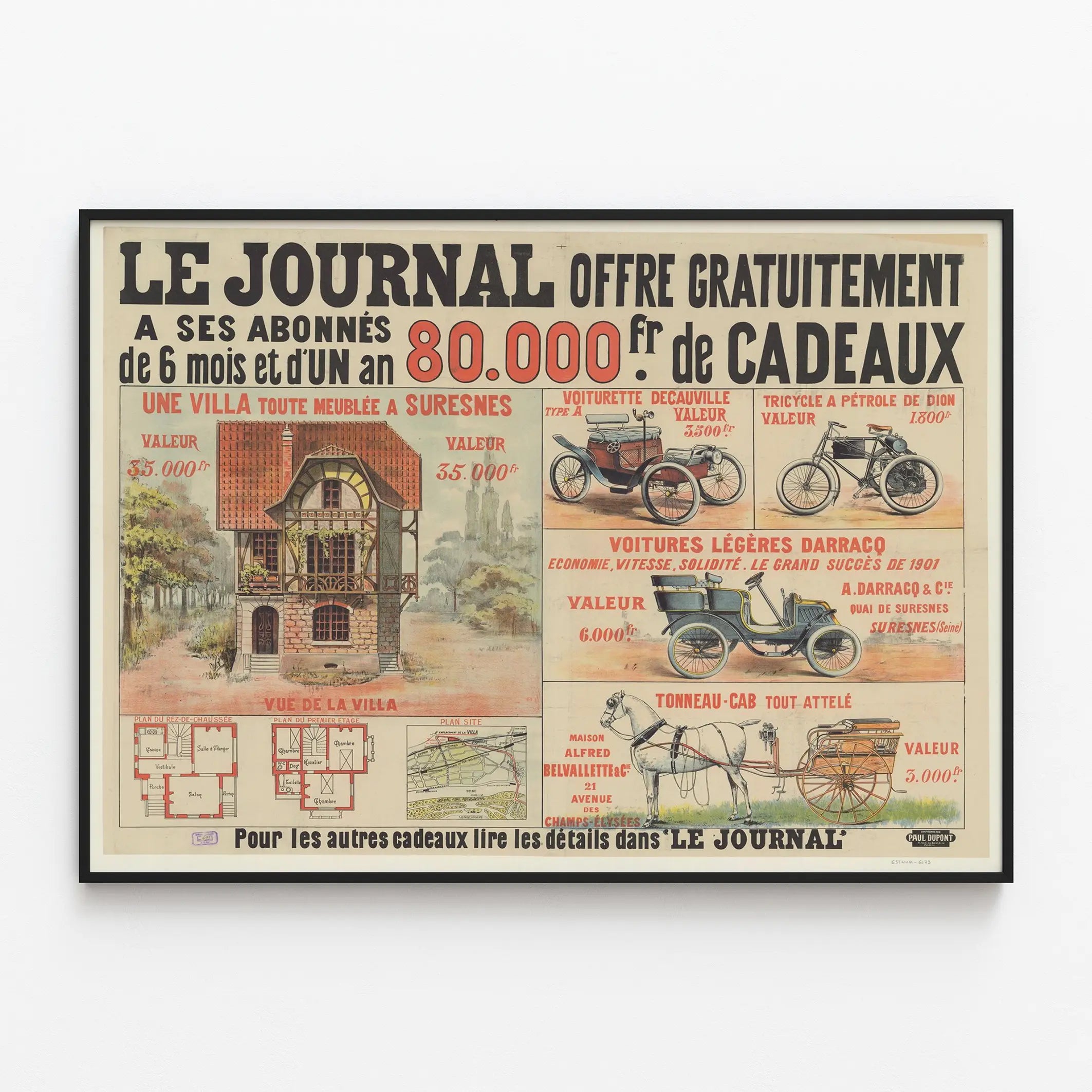 The main visual displays a fully furnished villa in Suresnes, carefully illustrated and accompanied by detailed floor plans of the ground floor, the first floor, and a location map, perfect for enthusiasts of antique architecture. This wall chart also highlights several iconic luxury objects of the era, such as the Decauville small car, Dion’s oil-powered tricycle, the Darraco light cars, and a fully harnessed barrel-cart, each clearly showing its value in francs.
