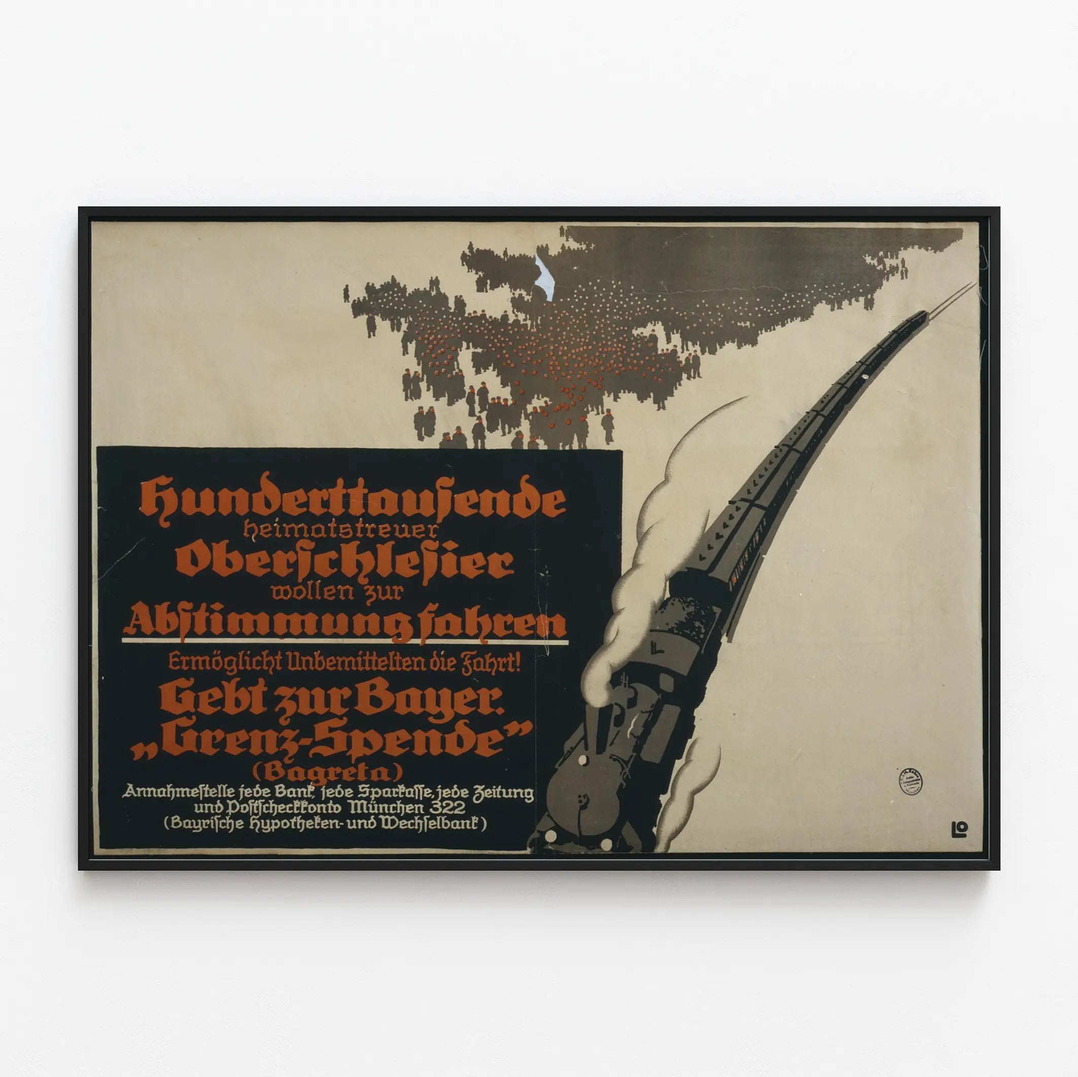 This vintage poster depicts a stylized steam train rushing to the right, accompanied by a dense crowd of dark human silhouettes on a light background, symbolizing the residents of Upper Silesia (Oberschlesien) ready to go to the polls. The visual evokes a call to support voters' transportation through a collection aimed at facilitating their travel, conveyed by a message in red and white Gothic typography on a black background. This graphic composition blends elements of historical propaganda with a contrasting design characterized by a play of clean shapes and a limited palette of black, red, and beige. This poster, ideal for vintage and historical wall decoration, will perfectly suit enthusiasts of political posters and period design, adding a touch of authenticity and reflecting an old civic commitment in a modern interior.