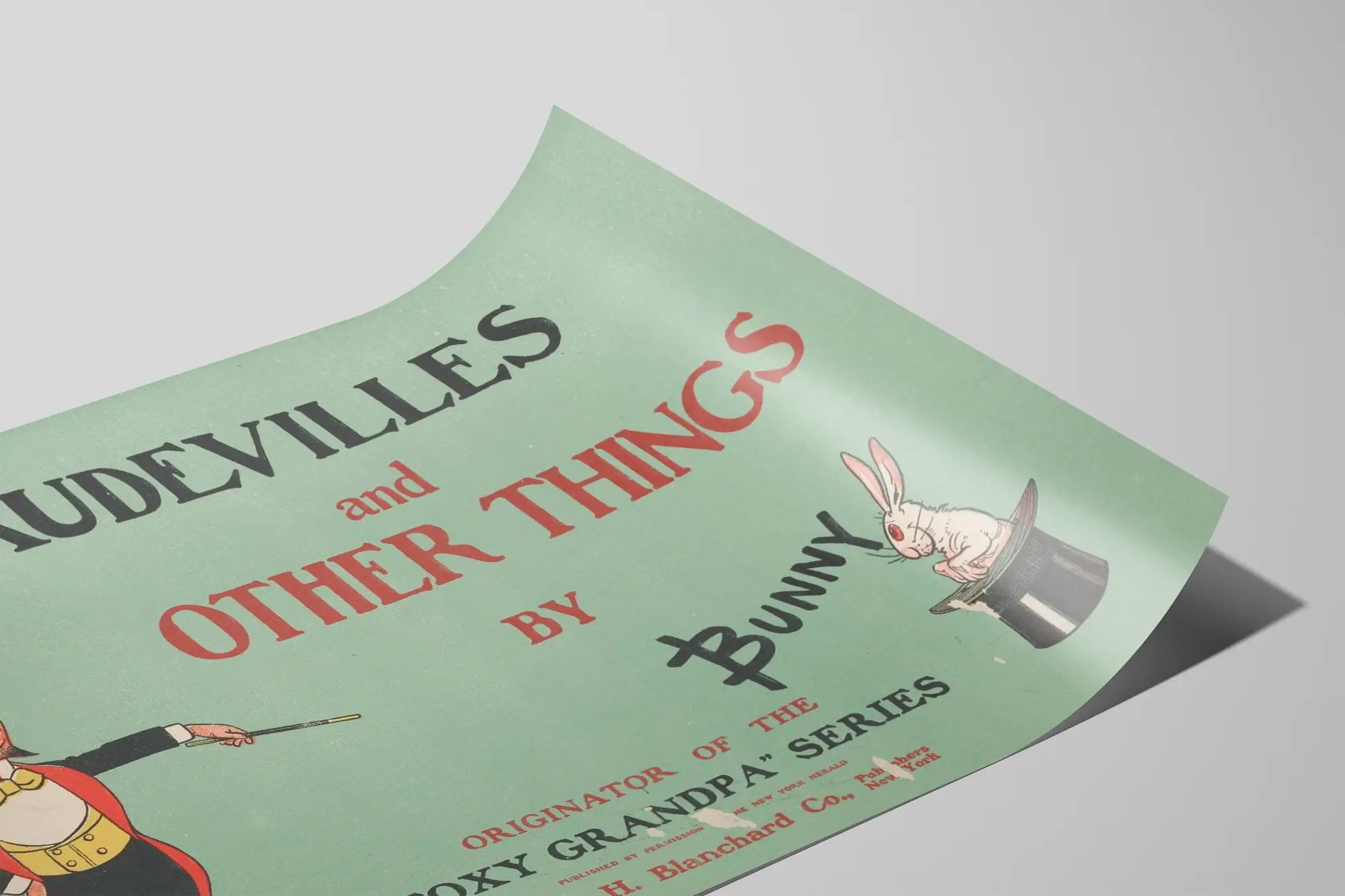 This vintage poster titled "Vaudevilles and Other Things by Bunny" adds a touch of nostalgic charm to your wall decor. On a soft green background, the visual features an elegant character dressed in a black and red suit with a yellow bow tie, illustrating the theatrical atmosphere of vaudeville performances. To the right, a small white rabbit named Bunny sits inside a top hat, bringing a playful and artistic note to the overall composition. The text is presented in classic typography, with the words "Vaudevilles" in black and "Other Things" in red, enhancing the vintage and authentic style of this unique piece. This poster is ideal for lovers of graphic art and retro wall decoration, seeking to adorn a living room, office, or entertainment space with an artwork that is both aesthetic and evocative of a bygone era. The combination of illustration and typography makes this poster a distinctive decorative element, perfectly suited for vintage or eclectic interiors. Whether as a focal point or decorative accent, this wall ornament will attract attention with its originality and gentle tonal palette, while evoking the festive and humorous ambiance of vaudeville. Perfect for adding character and nostalgia to your spaces, this piece stands out for its authenticity and distinctive graphic style.