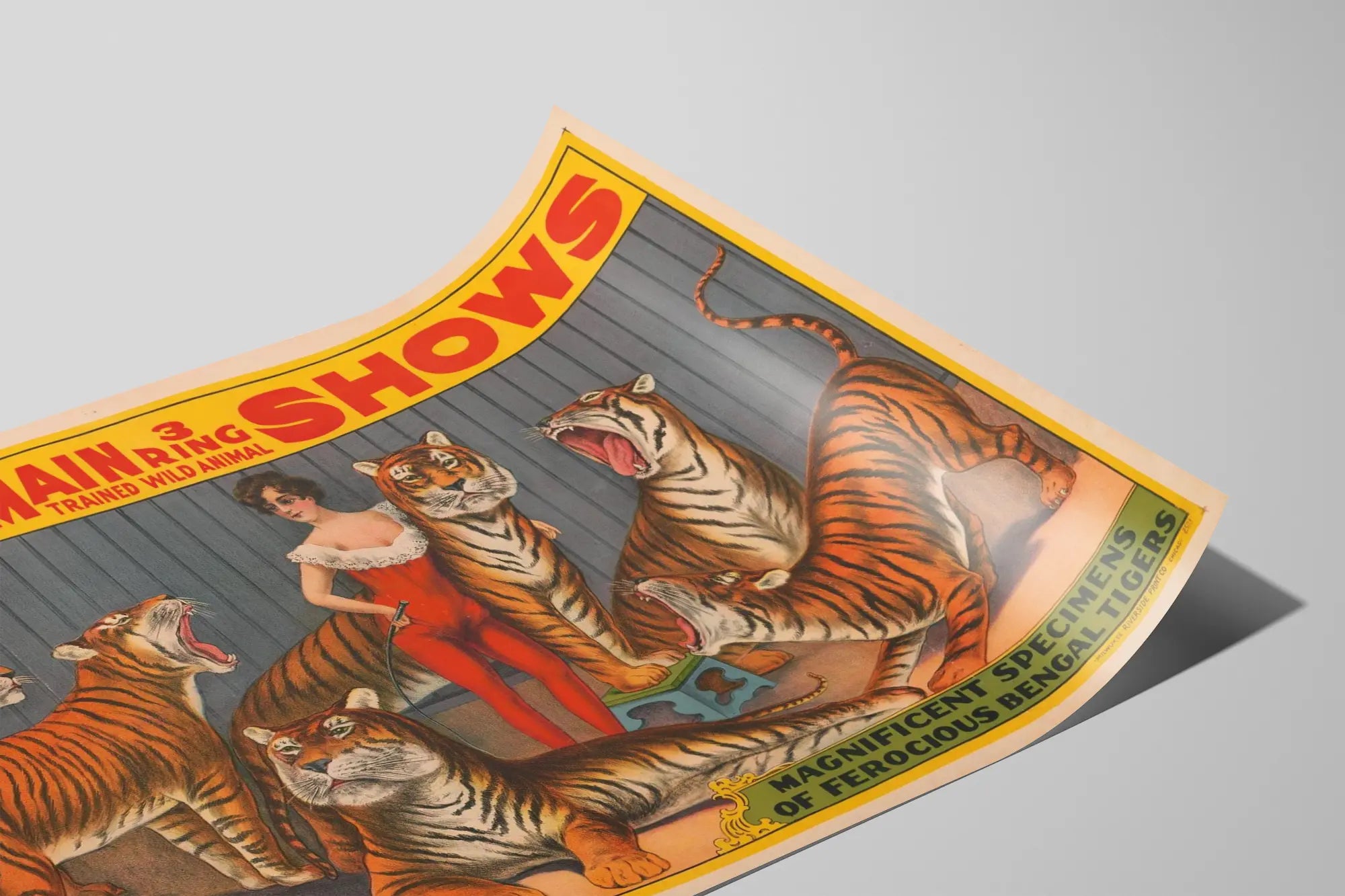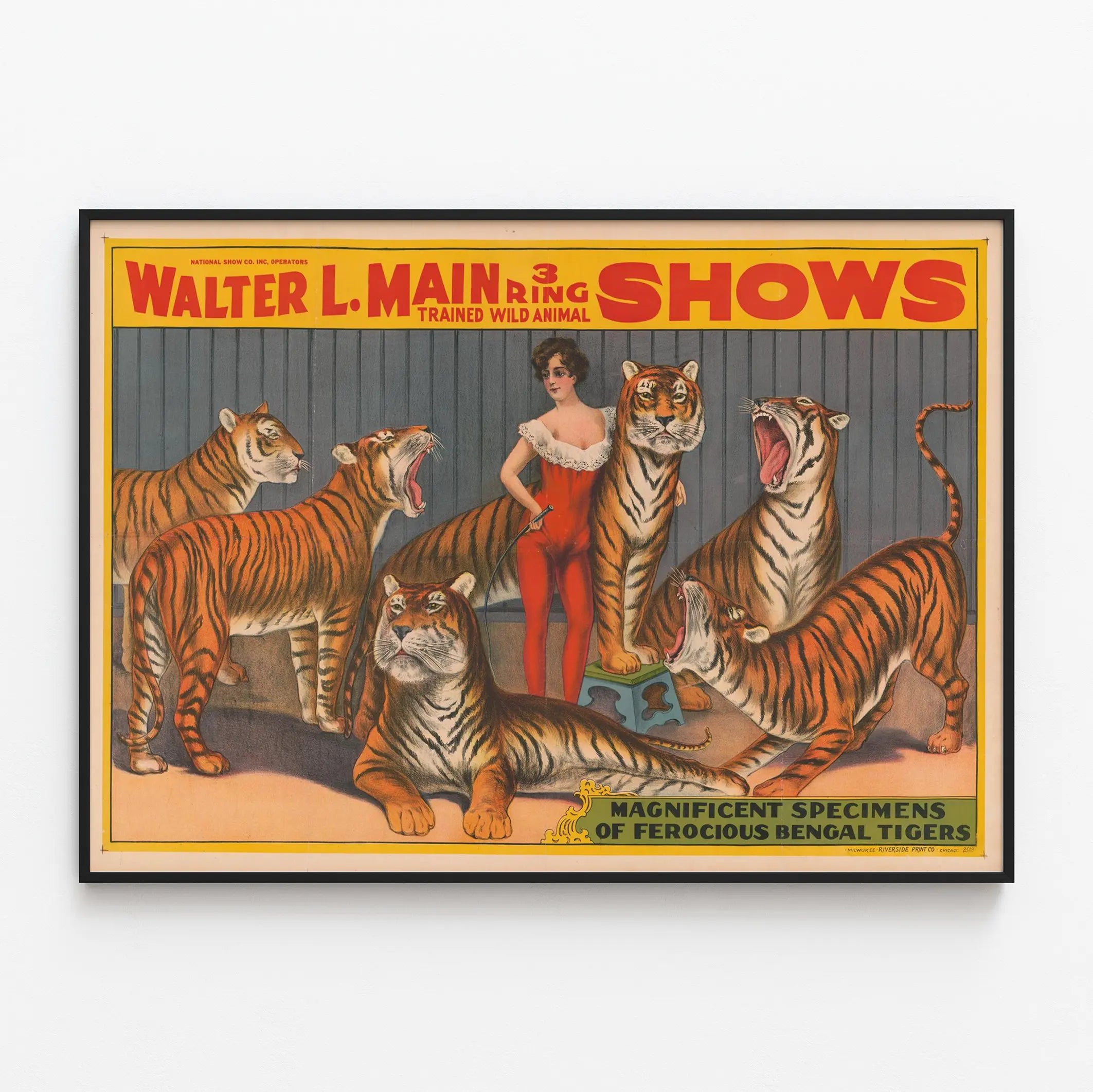 Add a vintage and wild touch to your wall decor with this vintage poster "Walter L. Main 3 Ring Trained Wild Animal Shows". This stunning illustration features a tiger trainer dressed in a red leotard, surrounded by six Bengal tigers with varied expressions, ranging from calm to an impressive roar. The background of the poster, in neutral tones, highlights the warm and vibrant colors of the tigers and the trainer's costume, creating a striking contrast that immediately captures attention. This wall decoration poster is perfect for animal motif enthusiasts and those wishing to infuse a vintage atmosphere into their interior. It perfectly illustrates the spectacular world of animal shows of yesteryear, emphasizing the relationship between humans and trained wild animals. The texts at the top and bottom of the poster, in bright red and yellow letters, add a period typographic charm and highlight the troupe's name as well as the description of the tigers, referred to as "magnificent specimens". This poster is ideal for an original wall decoration in a living room, office, or game room, bringing a touch of exoticism and adventure. Its detailed and colorful graphic style adapts well to both modern environments and spaces decorated in a vintage or industrial spirit. With its generous dimensions, this poster can become a focal point in your interior, enhancing a wall often left bare. Whether you are a collector or simply passionate about art and vintage animal shows, this wall decoration will appeal with its historical charm and carefully crafted artistic representation. Give your walls an invitation to spectacle and wonder with this printed wall poster depicting the exoticism and majestic power of Bengal tigers, symbols of an era when circuses and animal shows fascinated audiences. This wall decor piece is also a tribute to the art of animal staging, balancing mastery and wildness.