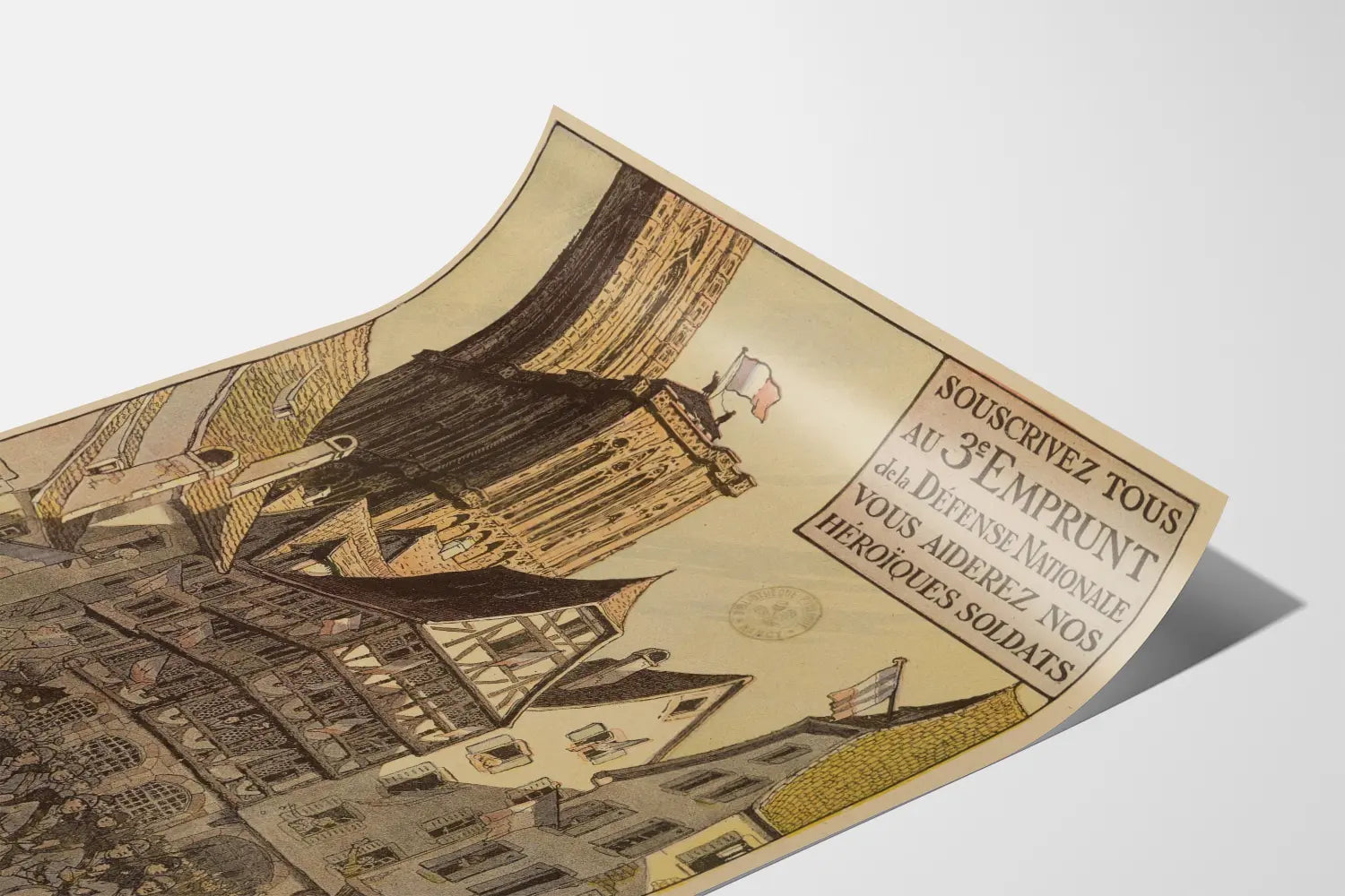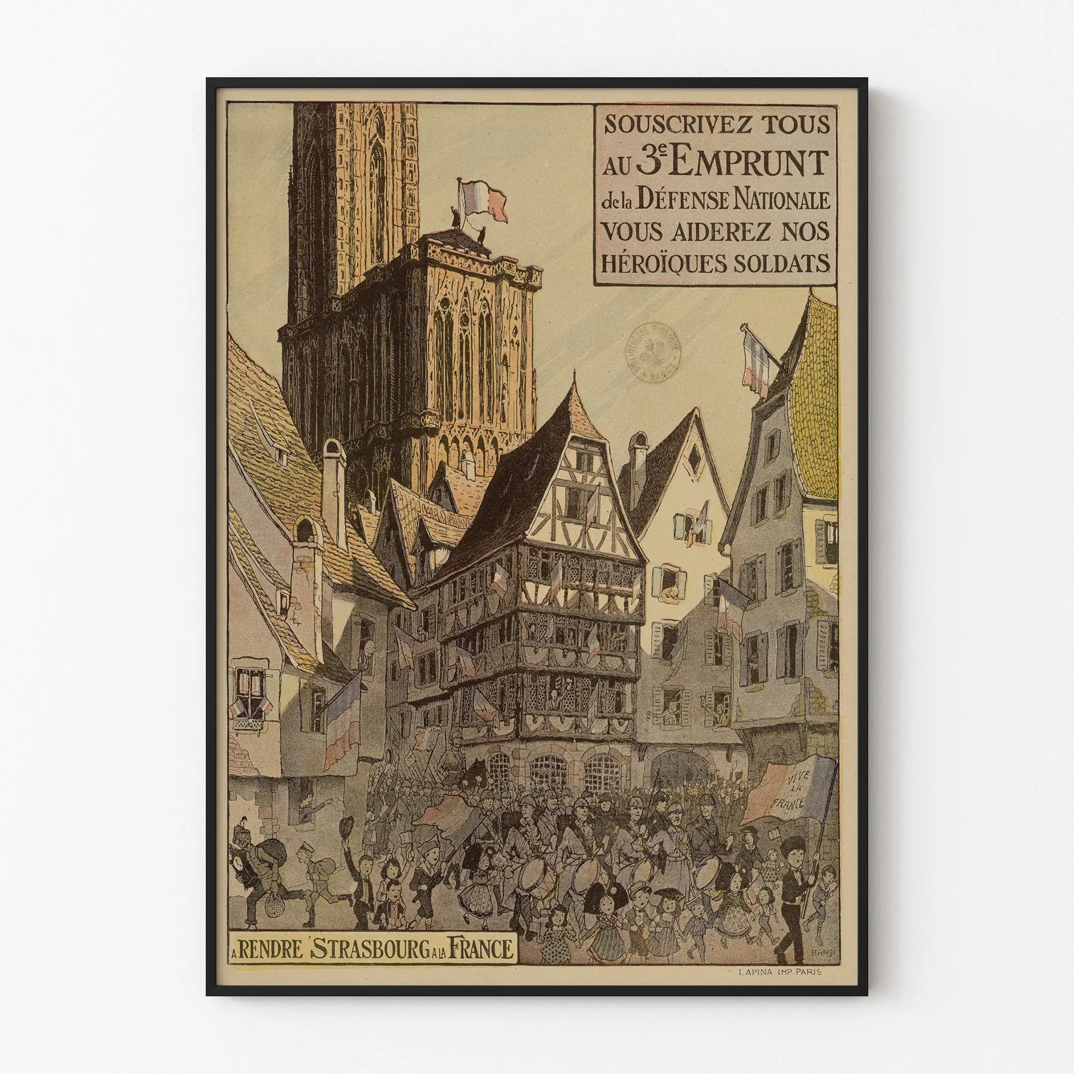 This vintage wall decoration poster depicts a patriotic call to subscribe to the third loan of National Defense. The composition features a lively street in a traditional town with half-timbered houses, most likely Strasbourg, with its residents, children, and soldiers in procession. They all carry French flags, emphasizing a strong nationalist sentiment and the desire to return Strasbourg to France. The text in the top right corner directly encourages the patriotic act of subscribing to support heroic soldiers. Architectural details, notably the large Gothic cathedral in the background, reinforce the historical and regional character of this propaganda poster. This poster, classified as vintage wall decor, can serve as a print or painting in a space with a historical, patriotic, or vintage graphic art theme. It captures attention with its precise lines and period atmosphere, making it ideal for history enthusiasts and engaged wall decoration. Perfect for creating an authentic ambiance that blends traditional elements with historical memories, this vintage poster evokes a time marked by national mobilization.