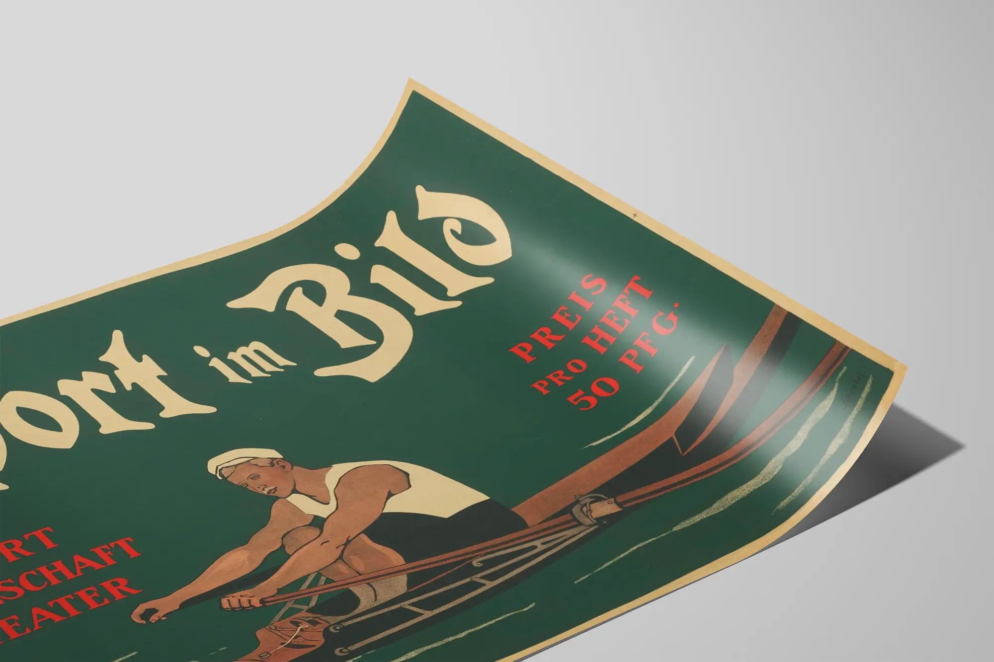 This vintage poster titled "Sport im Bild" is a unique wall decoration piece depicting a rower in full action. With a dark green background and inscriptions in old white and red lettering, this poster evokes a subtle blend of sport, society, and theater. The central subject of this wall art is a man dressed in traditional rowing attire, illustrated in a graphic style reminiscent of posters from the early twentieth century. The subdued yet contrasting colors enhance the retro and elegant feel, making it a perfect poster for those wishing to add a sporty and artistic touch to their interior. Ideal for sports enthusiasts and vintage lovers, this poster fits just as well in a gym, living room, or office. Its old typography and simple motifs make it a captivating decorative art object rich in history. Whether for a collection of sports posters or to decorate a space dedicated to movement and performance, this vintage rowing poster is a unique and timeless decorative element.