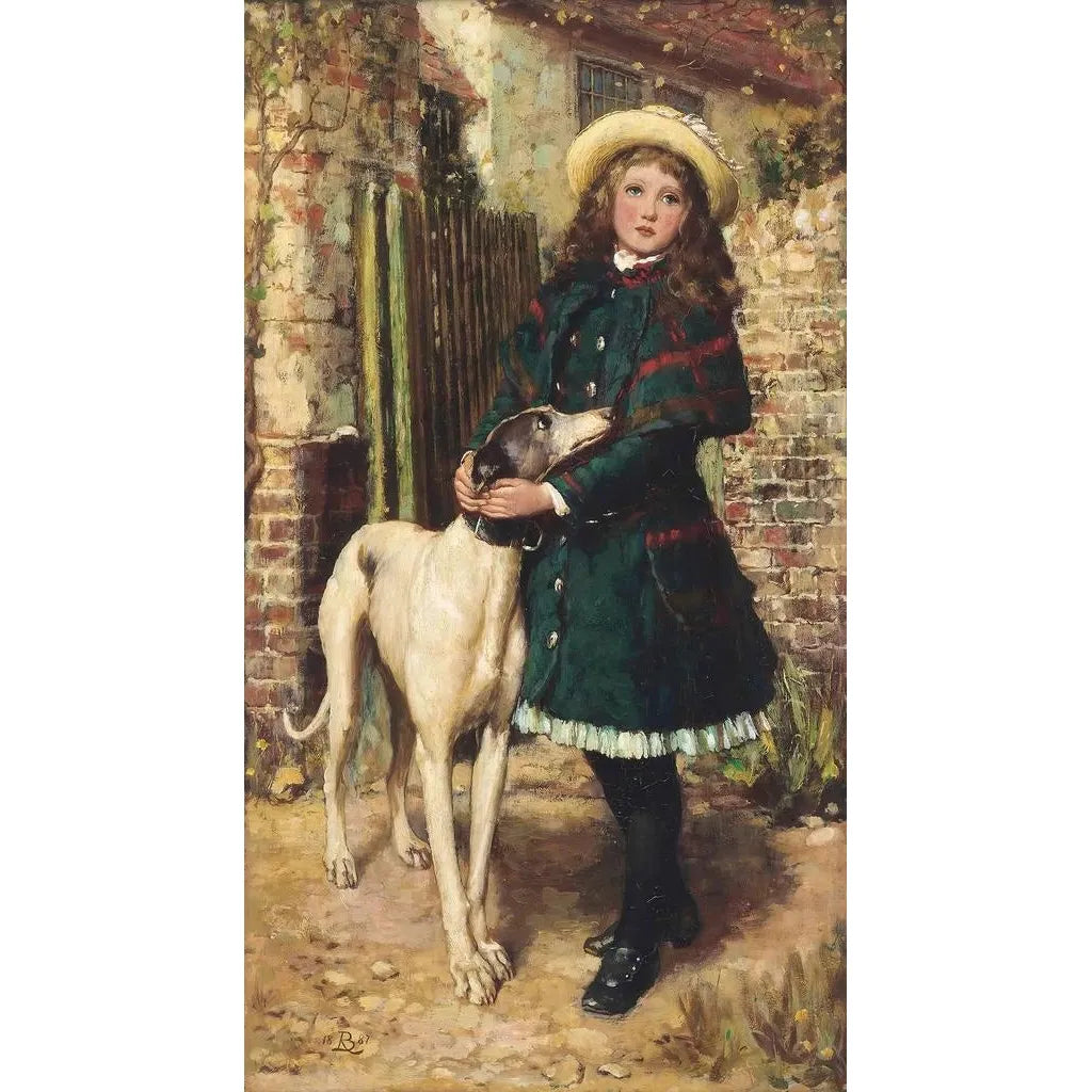Briton Rivière, artista británico del siglo XIX, es reconocido por sus obras que capturan la belleza de la naturaleza y la vida cotidiana. Influenciado por el movimiento prerrafaelita, desarrolla un estilo que combina precisión técnica y sensibilidad poética. Rivière también es conocido por sus representaciones de animales, pero "En la puerta del jardín" ilustra su talento para retratar escenas humanas en armonía con su entorno. Su trabajo se inscribe en una época en la que el arte busca redescubrir la belleza del mundo natural, respondiendo además a las preocupaciones sociales de su tiempo. La obra de Rivière sigue siendo un testimonio valioso de la estética victoriana.