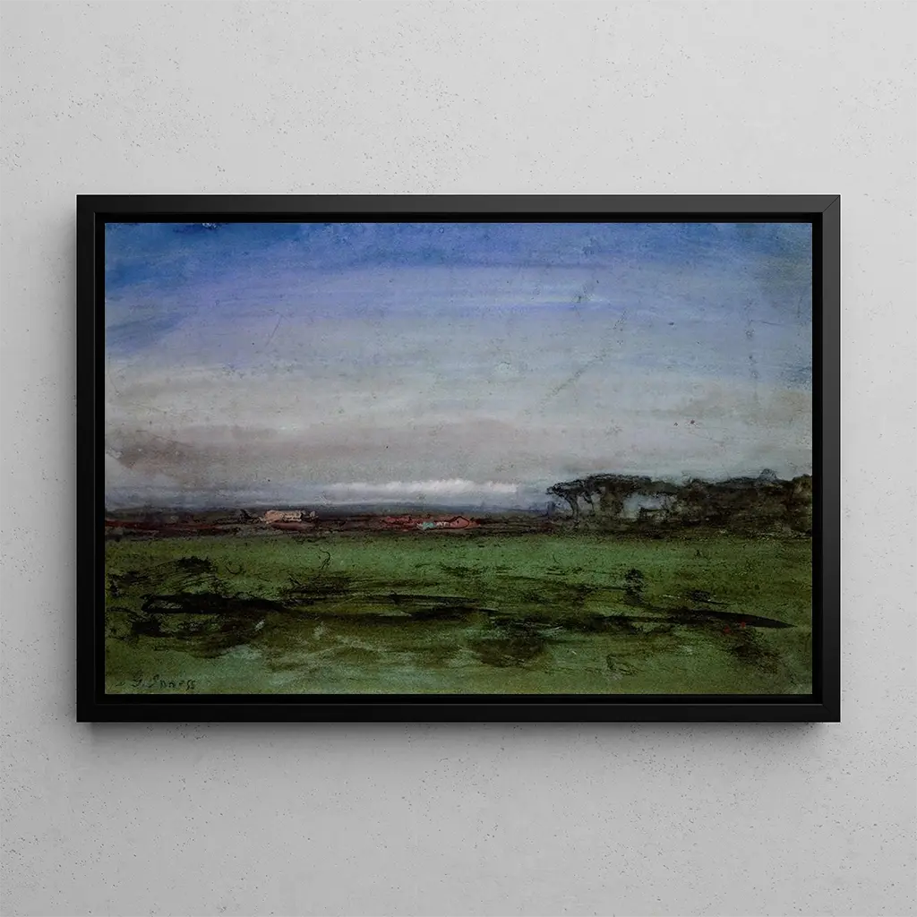 En esta obra, George Inness nos transporta al corazón de un paisaje rural lleno de serenidad. La composición, dominada por tonos suaves de verde y marrón, evoca una atmósfera relajante, casi meditativa. Los toques delicados de pincel y la luz difusa crean un equilibrio armonioso entre el cielo y la tierra. Los majestuosos árboles, los campos ondulantes y el cielo nublado se combinan para formar una escena donde el tiempo parece suspendido. Este lienzo, verdadera invitación a la contemplación, nos recuerda la belleza simple e intemporal de la naturaleza.