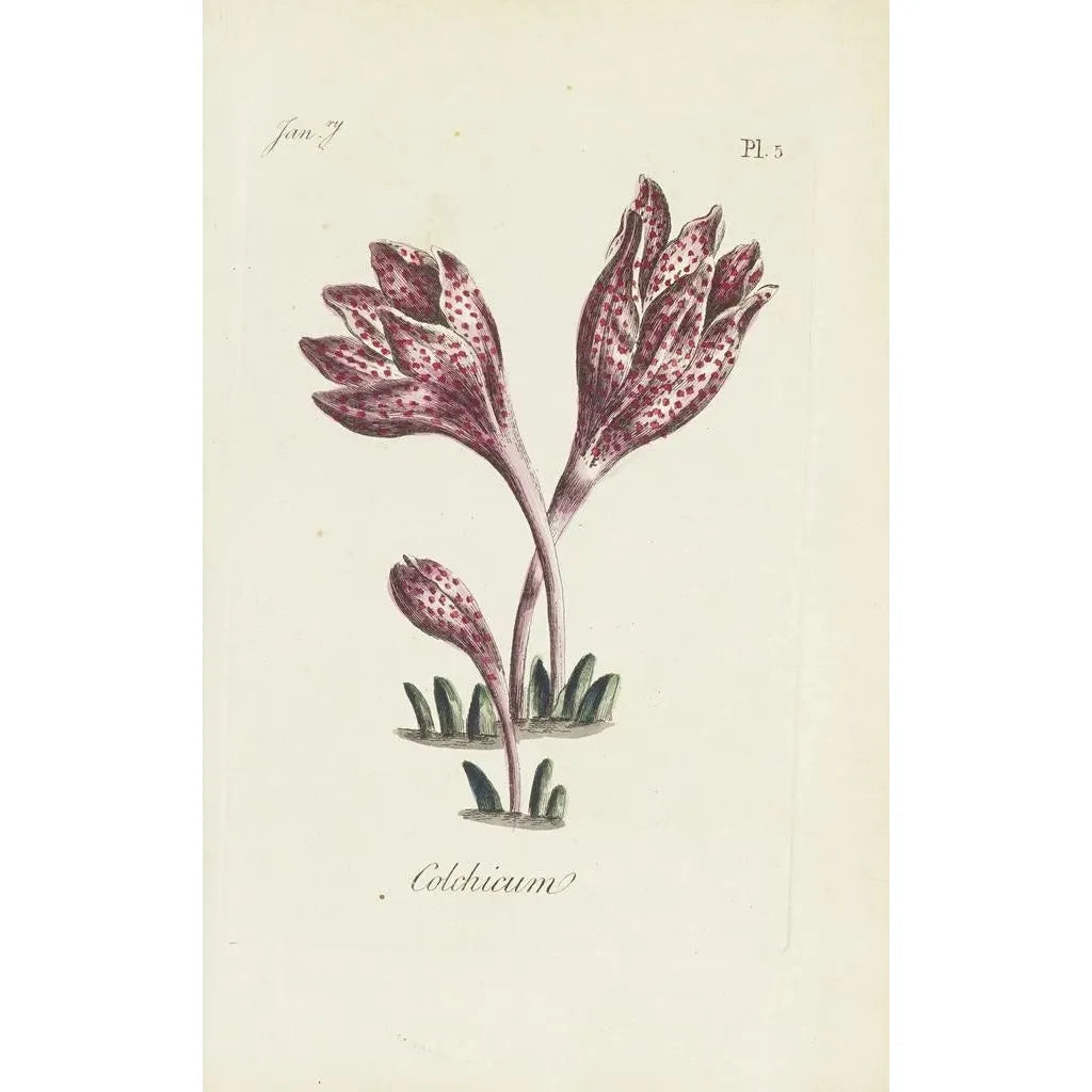 El colchique, con sus flores delicadas y sus tonalidades pastel, evoca una suavidad primaveral. Esta impresión artística destaca la gracia de esta planta, a menudo asociada con el fin del verano y el comienzo del otoño. Las tonalidades de violeta y blanco se combinan con sutileza, creando una atmósfera pacífica y contemplativa. La técnica de grabado de Carington Bowles permite reproducir cada detalle de los pétalos y las hojas con una precisión notable, ofreciendo una visión casi táctil de esta belleza efímera que nos recuerda la fragilidad de la naturaleza.