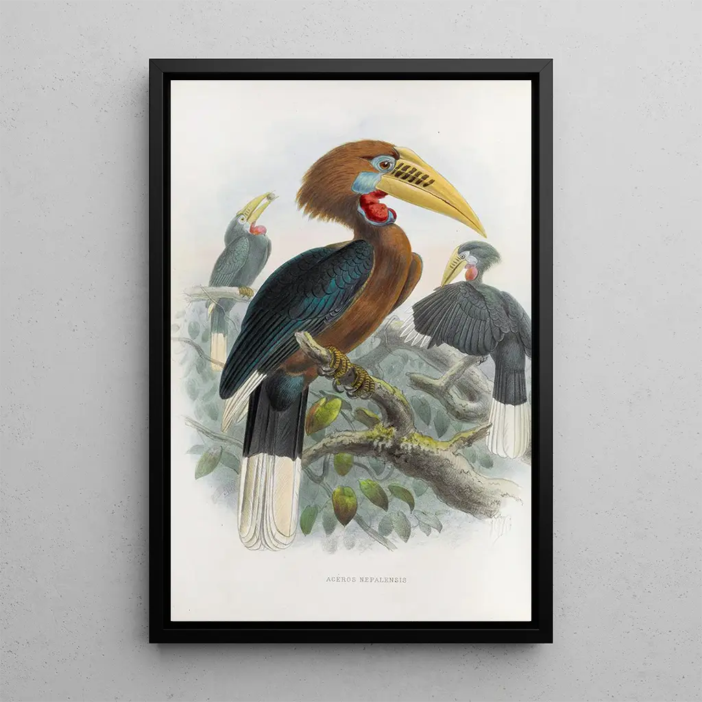 La impresión artística de Aceros nepalensis, obra de Daniel Giraud Elliot, nos sumerge en un universo vibrante donde la naturaleza se expresa con brillo. Este lienzo, rico en colores, destaca el majestuoso pico del ave, cuyas tonalidades de amarillo y negro contrastan armoniosamente con el verde exuberante de su entorno. La técnica del artista, combinando precisión y delicadeza, crea una atmósfera casi palpable, invitando al espectador a admirar la belleza de este espécimen raro. Cada detalle, desde las plumas hasta las hojas, está cuidadosamente representado, ofreciendo una experiencia visual inmersiva.
