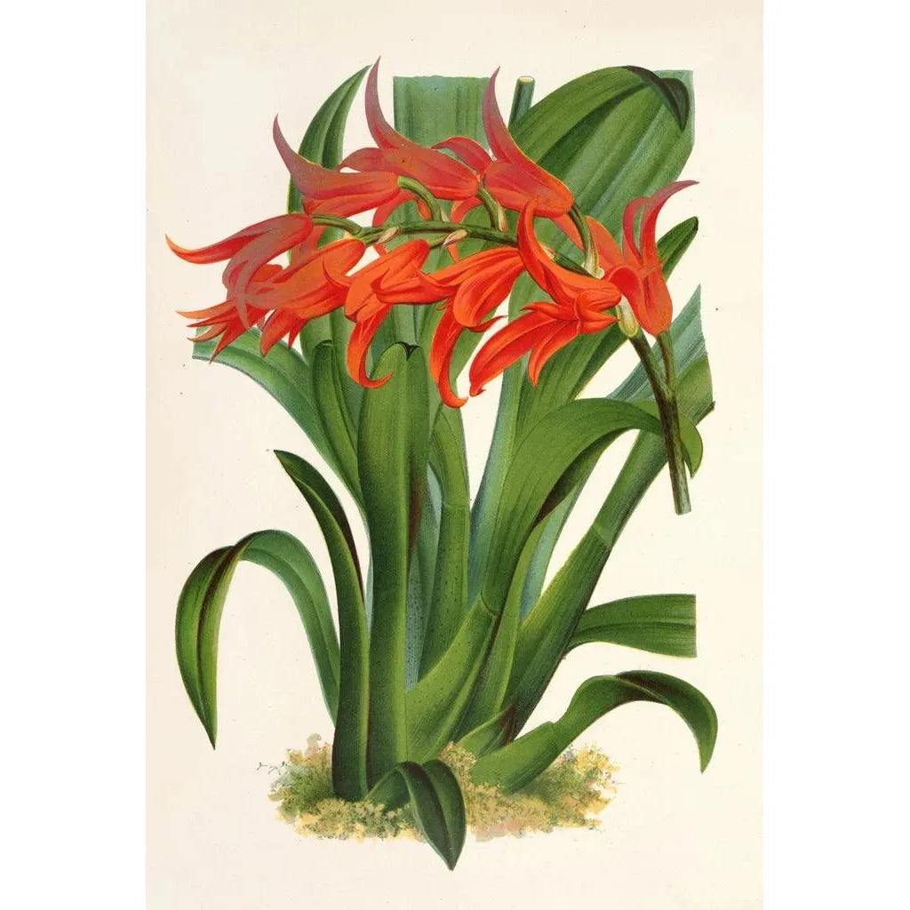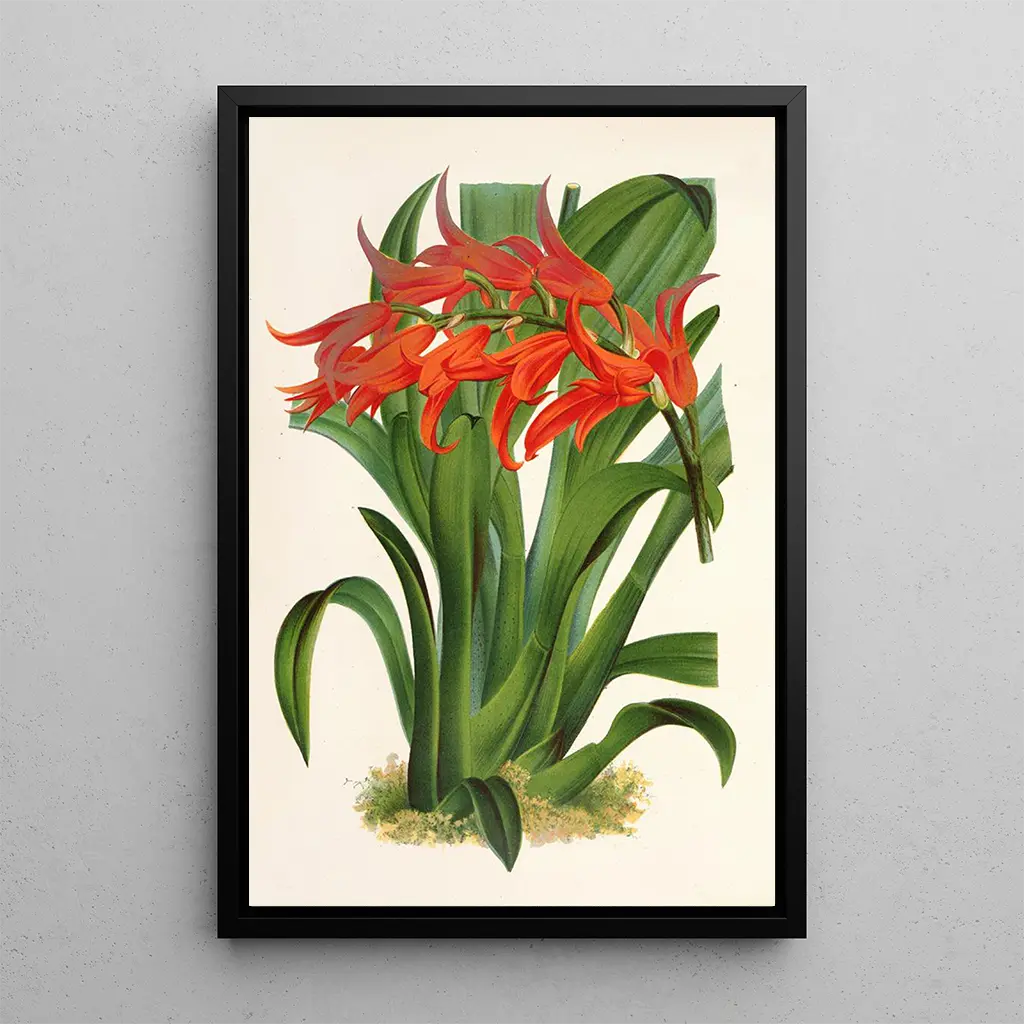 La impresión artística de Ada aurantiaca, obra emblemática de Charles Antoine Lemaire, evoca una verdadera explosión de colores tropicales. Los matices vibrantes del naranja y del rojo se combinan armoniosamente, creando una atmósfera cálida y acogedora. La técnica de Lemaire, que combina precisión botánica y sensibilidad artística, permite capturar la belleza efímera de esta planta. Los detalles minuciosos de los pétalos y las hojas, representados con una delicadeza notable, invitan al espectador a sumergirse en un mundo exuberante, donde cada elemento parece cobrar vida bajo la luz.