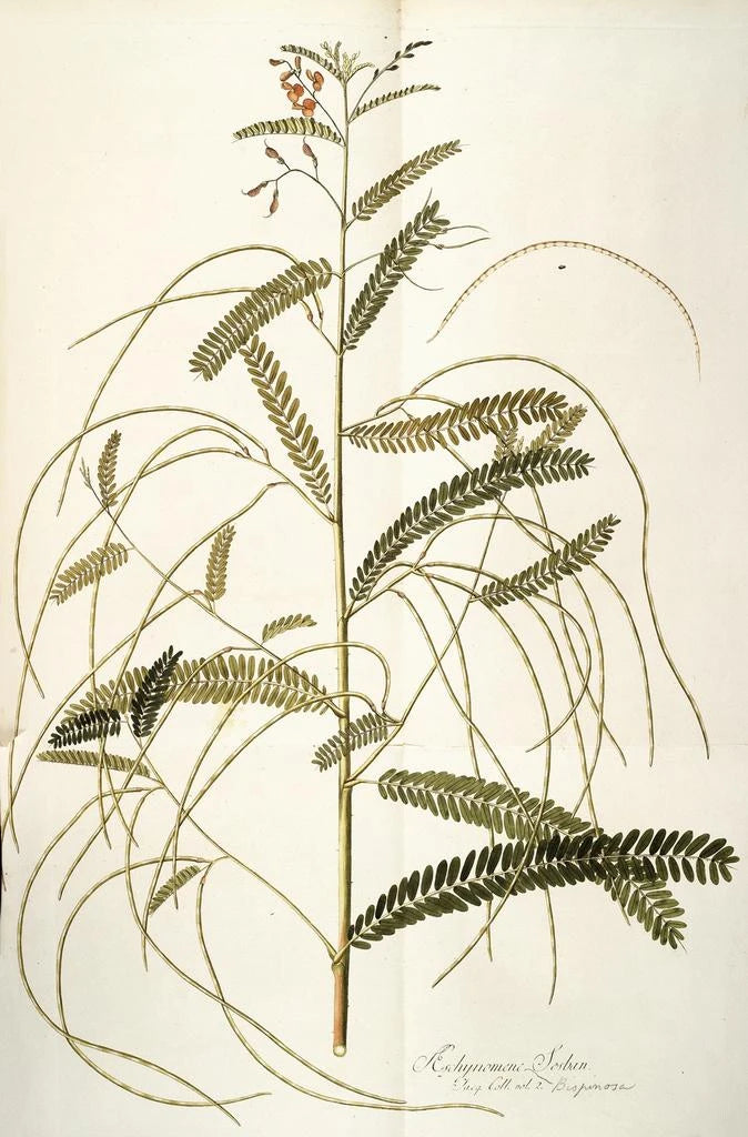 "{{Aeschynomene bispinosa}}", obra de Nikolaus Joseph Freiherr von Jacquin, es una ilustración cautivadora que celebra la riqueza de la biodiversidad. Esta planta acuática, representada con minuciosidad, revela detalles fascinantes de sus hojas y flores. Los tonos suaves de verde y amarillo, combinados con un fondo sutil, crean una atmósfera tranquila y armoniosa. La técnica del artista, que combina realismo y sensibilidad, permite apreciar la belleza intrínseca de esta especie. Cada elemento de la composición parece contar una historia, invitando al espectador a sumergirse en el universo exuberante de la flora tropical.