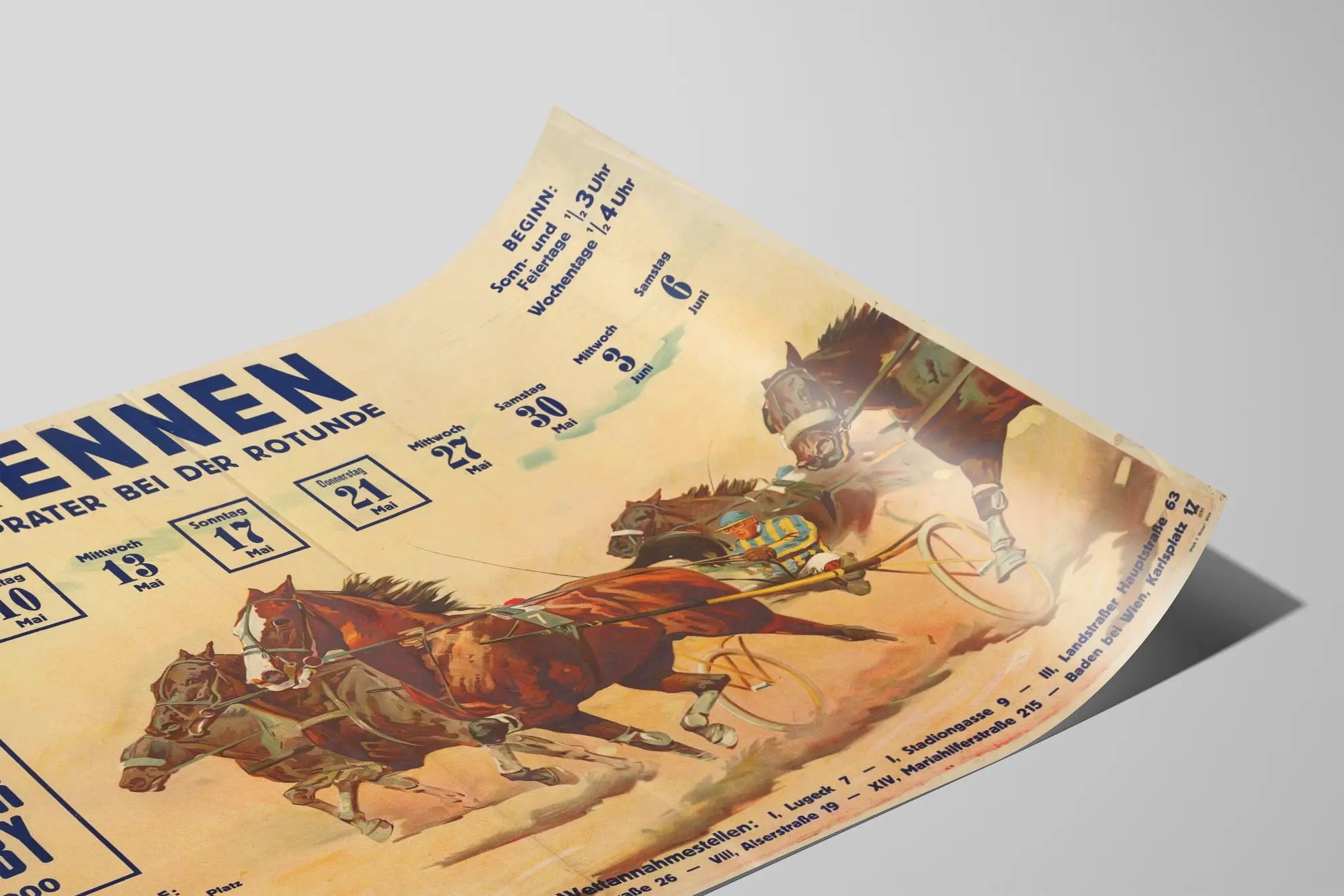 La composition du poster est centrée autour de la course, avec des informations détaillées sur les dates des courses de mai et juin, mettant en avant un événement spécial, le 'Österr. Traber Derby' du dimanche 17 mai, avec une prime indiquée. Les horaires de début varient selon les jours, précisés en haut à droite, ce qui ajoute une touche d'authenticité à cette affiche.