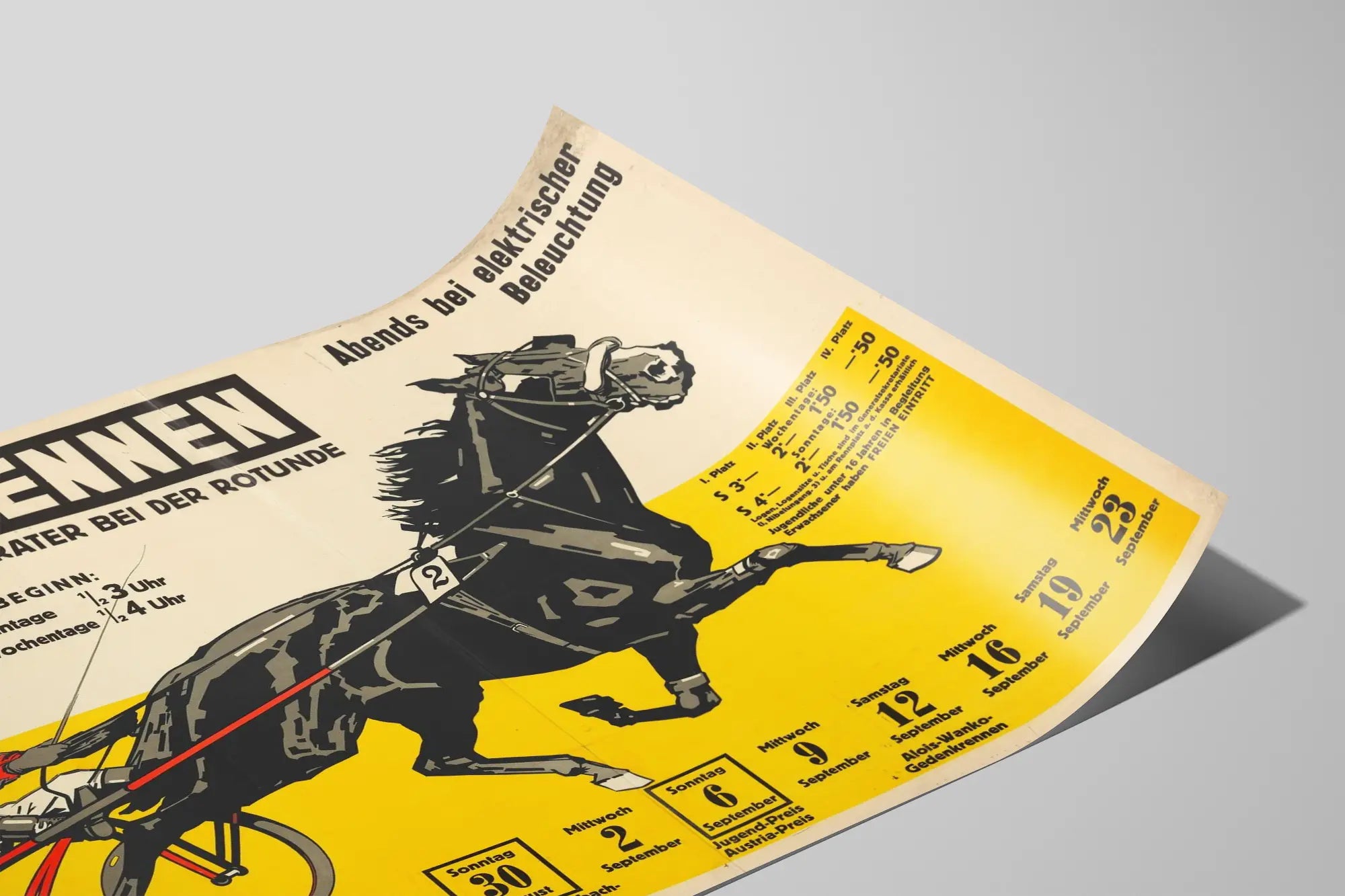Idéal comme poster ou affiche à encadrer, ce visuel authentique est aussi parfait pour un cadre professionnel comme un cabinet lié au sport, un restaurant ou un bar faisant référence aux courses hippiques. Il s'agit d'une pièce unique qui combine aspect artistique et information historique sur les courses au Prater.