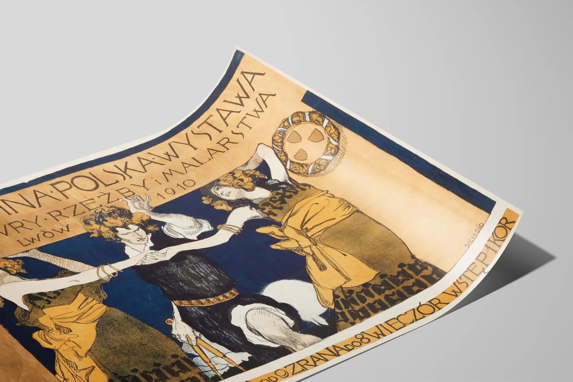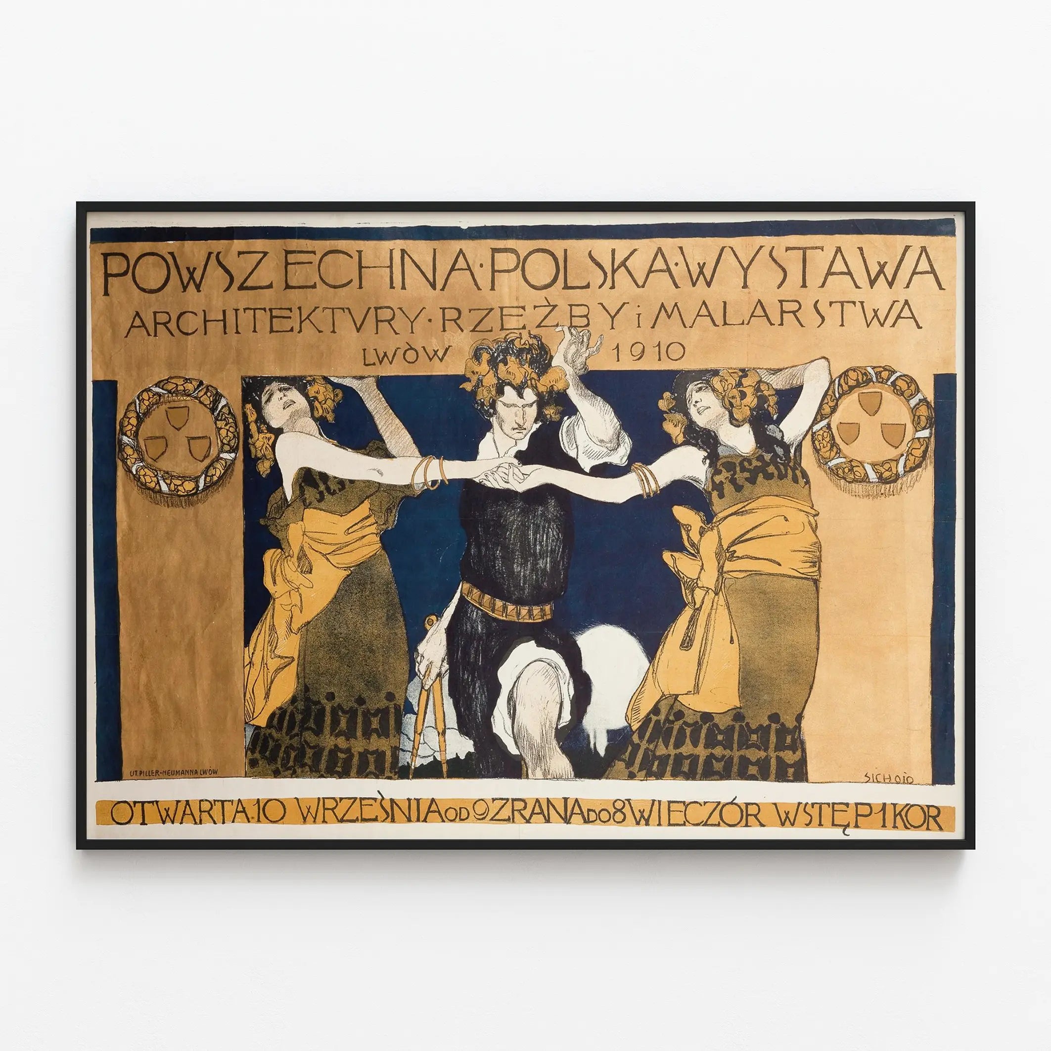 Cette affiche ancienne est une pièce remarquable de décoration murale, illustrant la Powszechna Polska Wystawa Architektury, Rzeźby i Malarstwa tenue à Lwów en 1910. Ce poster artistique présente une scène dynamique où trois personnages en costumes stylisés semblent engager une danse rituelle, dans une composition riche en détails et couleurs chaudes, principalement des tons ocres, bleus et noirs. Le style graphique évoque le design Art Nouveau, avec ses lignes fluides et ses motifs ornementaux. Cette affiche d'exposition est idéale pour les amateurs d'art et d'histoire, apportant une touche rétro et culturelle à tout intérieur. Que vous cherchiez un tableau mural ou une décoration murale originale, ce poster vintage est une invitation à voyager dans le temps et à admirer la richesse de l'architecture, de la sculpture et de la peinture polonaises du début du XXe siècle. L’inscription typographique en haut et en bas souligne l’aspect historique de cette œuvre, en conservant l’authenticité et le charme de l’époque. Cette affiche s’adresse aux passionnés de décoration intérieure désireux d’intégrer une touche artistique unique et historique à leur espace de vie.