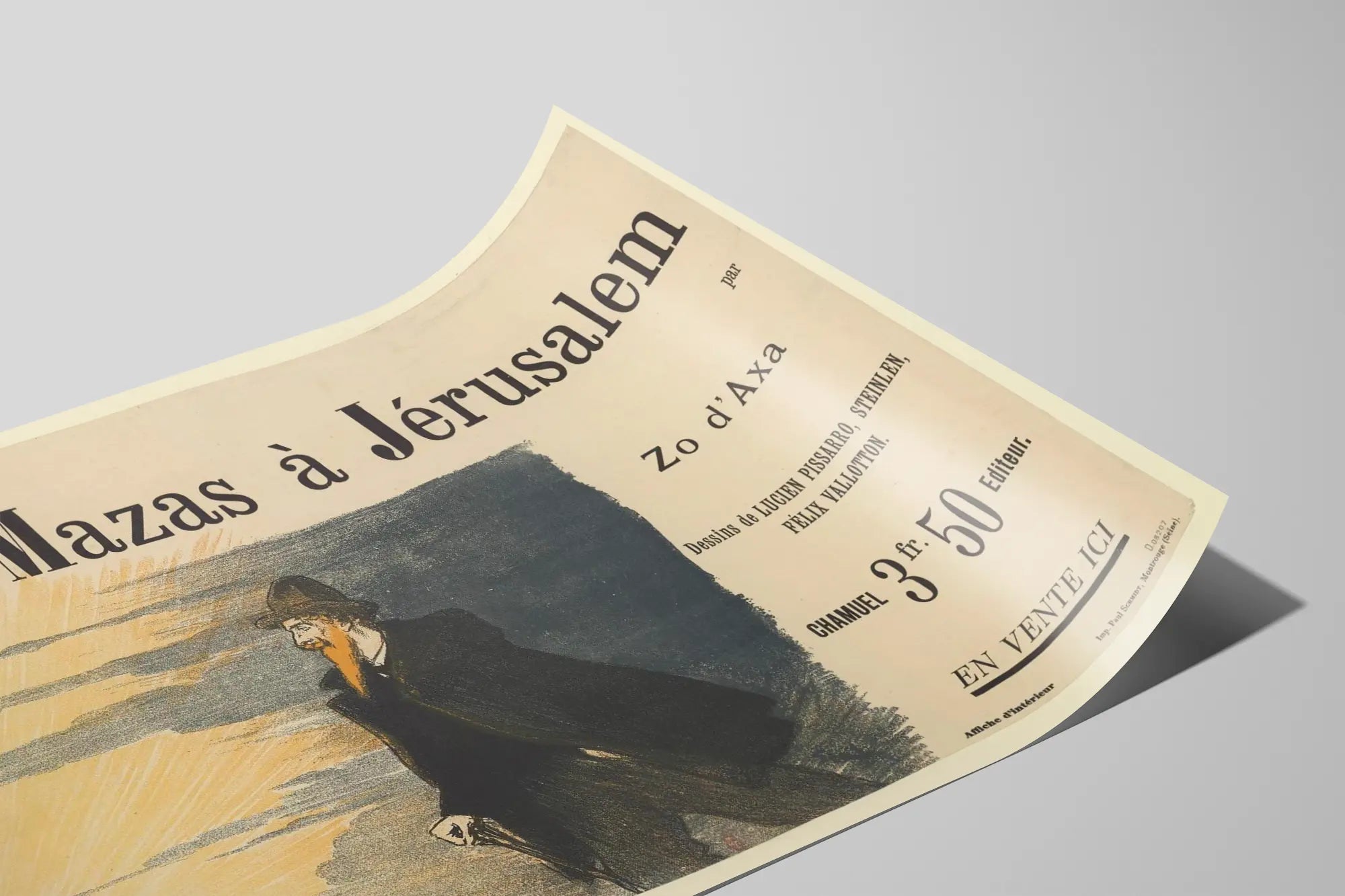Ce visuel met en avant le titre principal en grandes lettres noires soulignant le parcours « de Mazas à Jérusalem », évoquant un voyage ou une transition symbolique, tandis que le bas de l’affiche présente des mentions d’auteurs et artistes tels que Lucien Pissarro, Steinlen et Félix Vallotton, connus pour leurs contributions artistiques importantes. Ces détails enrichissent l’œuvre et la rendent unique pour ceux qui apprécient les créations combinant illustration et typographie.
