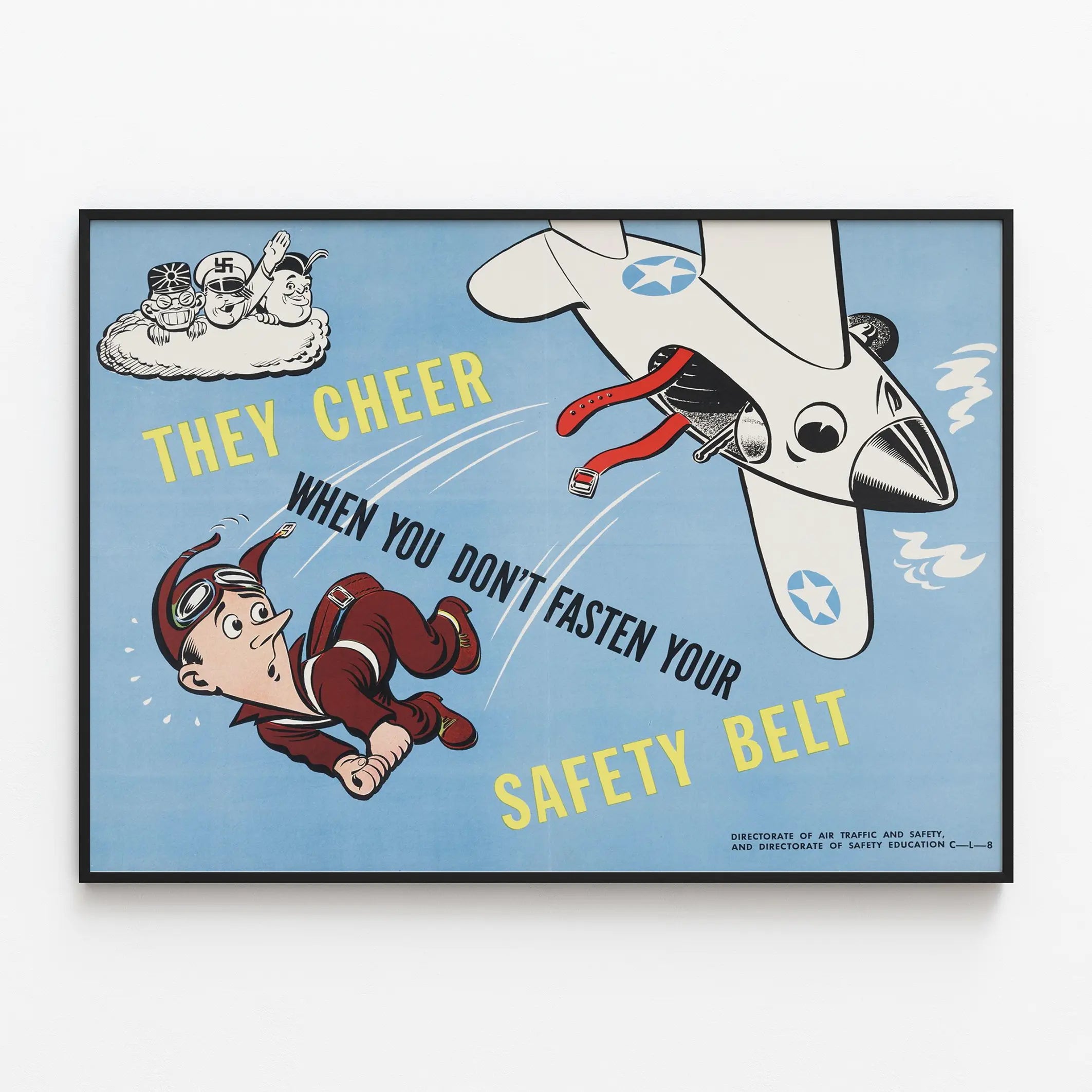 Cette affiche vintage de sécurité aérienne est une pièce de décoration murale unique, idéale pour les amateurs d'histoire de l'aviation ou pour apporter une touche rétro à un intérieur. Représentée dans un style caricatural, elle montre un pilote surpris quitté son siège, projeté hors de son avion en plein vol, faute d'avoir attaché sa ceinture de sécurité. Ce poster utilise des couleurs vives et un design simple mais efficace pour transmettre un message clair : l'importance de boucler sa ceinture pour sa propre sécurité. En haut à gauche, une illustration humoristique de personnages caricaturant des ennemis durant la Seconde Guerre mondiale ajoute un contexte historique marqué, tout en renforçant la tonalité avertissante de l'affiche. L'avion blanc, identifiable par ses marques, est en plein mouvement, accentué par les lignes dynamiques autour du pilote, soulignant le danger auquel on s'expose en négligeant les consignes de sécurité. Cette décoration murale est parfaite pour les espaces dédiés à la thématique de l'aéronautique, des musées, ou même un bureau moderne désireux d'inviter à la réflexion de manière créative. Ce tableau affiche un style graphique très caractéristique des années de guerre, mêlant humour et pédagogie au travers d’un visuel simple et percutant. En intégrant cette affiche chez vous, vous apportez une décoration murale originale qui interpelle et évoque des enjeux essentiels de sécurité, tout en décorant avec une touche vintage qui ne laisse pas indifférent. Ce poster est aussi un cadeau parfait pour les collectionneurs d'affiches historiques ou les passionnés d'aviation. Quel que soit l'endroit où vous choisirez de l'exposer, il saura capter l'attention grâce à son message clair et son esthétique typique du milieu du XXe siècle.