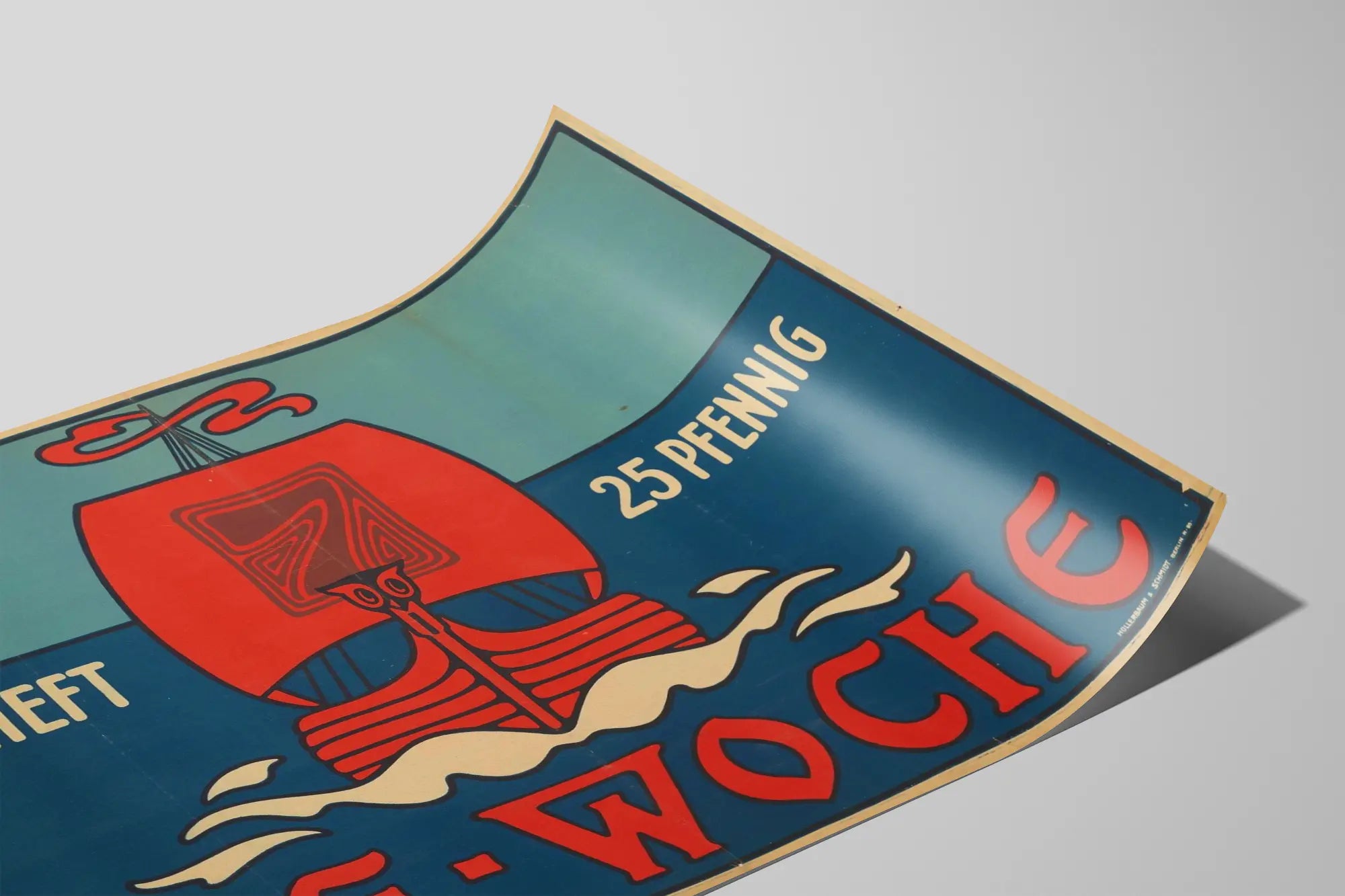 Apportez une touche rétro et colorée à votre décoration murale avec cette affiche vintage intitulée "Die Woche". Dominée par un voilier stylisé rouge sur un fond bleu, cette affiche capte instantanément le regard grâce à son graphisme simple et puissant. Le bateau stylisé navigue sur des vagues blanches esquissées avec dynamisme, évoquant un esprit d'aventure et de liberté maritime. L'inscription "DIE WOCHE" est placée en bas en grandes lettres rouges au design typographique unique, renforçant l'aspect artistique et authentique de cette pièce. Deux petites mentions "PRO HEFT" et "25 PFENNIG" encadrent le voilier, rappelant l'origine de cette affiche liée à une publication ou une édition à prix modique. Le style graphique utilise des aplats de couleurs vives et des formes épurées, typiques de l'art déco ou des affiches publicitaires du début du XXe siècle, ce qui en fait un choix idéal pour les amateurs de déco vintage ou industrielle. Cette affiche peut être un excellent poster décoratif pour un salon, un bureau, ou un espace de vie cherchant à associer modernité et touche historique. Son design graphique fort saura s’intégrer parfaitement dans une ambiance urbaine, loft ou scandinave. Facile à encadrer, elle s'impose comme un élément de décoration murale original qui apportera caractère et couleur à vos murs. Optez pour cette création graphique unique et redonnez vie à vos intérieurs avec une affiche au style rétro fort et une esthétique maritime captivante.