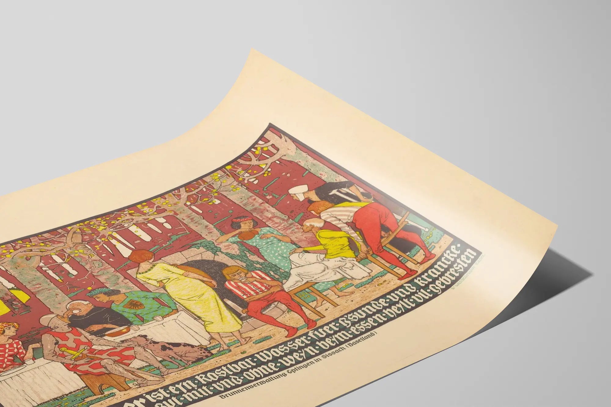 Cette affiche vintage illustre une scène extérieure chaleureuse réunissant plusieurs personnages d'époque médiévale autour d'un repas. On y voit un chevalier en armure assis près d'un chien, des personnages vêtus de costumes colorés, et une femme versant un liquide, vraisemblablement de l'eau, dans un verre. Le décor est planté dans une forêt aux arbres dépouillés mais parsemés de fruits jaunes lumineux, ajoutant une touche vibrante à cette composition. L'œuvre repose sur un style graphique typique des affiches anciennes, avec un cadre noir encadrant le dessin et une inscription en lettres gothiques en bas "Eptinger ist ein kostbar Wasser für Gesunde und Kranke gut mit und ohne Wein beim Essen heÿlt viel Gebresten", ce qui signifie que l'eau d'Eptingen est une eau précieuse bonne pour les sains et les malades, consommée avec ou sans vin au repas, et aidant à guérir de nombreux maux. Cette affiche peut devenir une décoration murale originale et élégante, convenant particulièrement aux intérieurs de style rétro ou vintage, mais aussi à ceux qui apprécient l'art graphique et la publicité ancienne. Elle apportera une touche d'authenticité et un point focal intéressant sur un mur, qu'elle soit encadrée sous verre ou en poster. Parfaite pour les passionnés de décoration murale, d'affiches anciennes ou pour donner du caractère à un espace de vie, ce tableau imprimé reflète un héritage culturel et une esthétique soignée. Ce poster vintage saura séduire les amateurs de styles médiévaux et d'illustrations historiques, apportant chaleur et style à votre décoration.