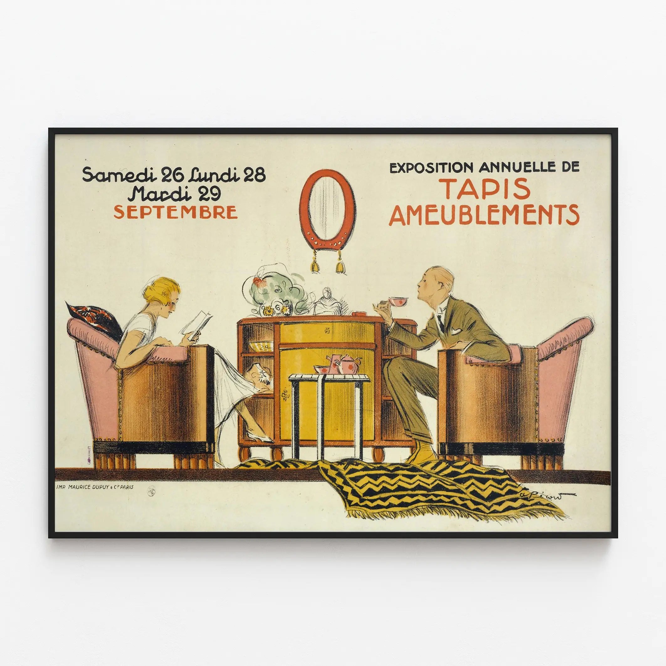 Découvrez cette affiche vintage exceptionnelle consacrée à l'exposition annuelle de tapis et ameublements, mettant en scène un intérieur élégant et raffiné. Ce poster de décoration murale illustre une scène intime et stylisée : un homme et une femme confortablement installés dans des fauteuils, entourés de mobilier d'époque, dont une commode centrale surmontée d'un miroir décoratif et une table basse portant un service à thé. L'art graphique met en avant l'élégance des designs de meubles et tapis, avec notamment un tapis aux motifs géométriques posé au sol, renforçant le cachet de ce tableau publicitaire ancien. Ce poster est une invitation à redécouvrir l'art du mobilier d'intérieur et la sophistication des aménagements classiques. Parfait pour personnaliser votre intérieur, ce tableau mural apportera une touche de charme rétro et d'authenticité à votre décoration. Il évoque aussi l'ambiance chaleureuse d'une pièce où le mobilier est mis en valeur non seulement par ses formes mais aussi par son intégration dans un cadre de vie soigné. Idéal pour les amateurs de décoration murale vintage, ce poster sera une pièce maîtresse dans tout espace dédié à l'art et au design d'ameublement traditionnel.