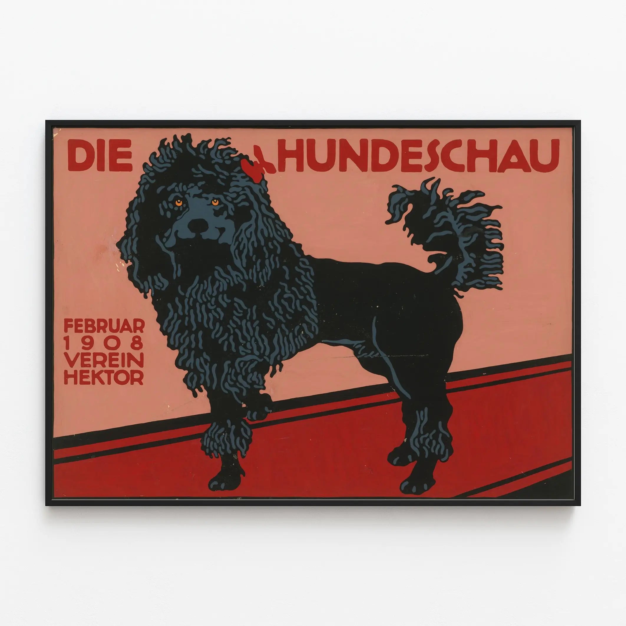 Cette affiche vintage de style art nouveau illustre une exposition canine intitulée "Die Hundeschau" qui s'est tenue en février 1908 par le Verein Hektor. Elle présente en son centre un chien noir, vraisemblablement un caniche, aux poils bouclés dessinés avec soin, sur fond rouge et rose. Le contraste fort entre les couleurs rouges dynamiques et le ton sombre du chien crée une décoration murale frappante et élégante, idéale pour les amateurs d'art et de chiens. Ce poster historique, au graphisme simple mais puissant, apporte une touche rétro et artistique à tout intérieur. Grâce à son style graphique fort et son ambiance nostalgique, cette affiche fera un excellent élément décoratif pour une pièce dédiée à la passion canine ou au design ancien. Ce tableau mural rehausse la décoration par ses couleurs vives et son sujet animalier, parfait pour insuffler une atmosphère unique et vintage dans un salon, un bureau ou une salle d’exposition. Affichez une pièce murale qui combine l'élégance du graphisme d'époque et la passion pour les chiens avec ce poster d'exposition canine Die Hundeschau 1908.
