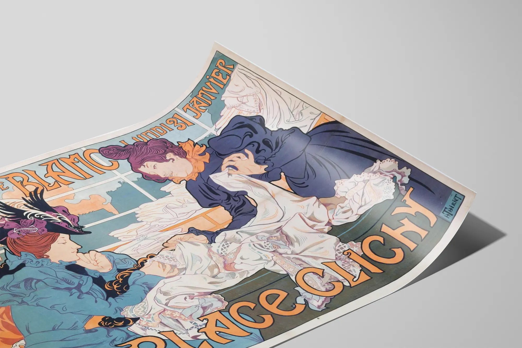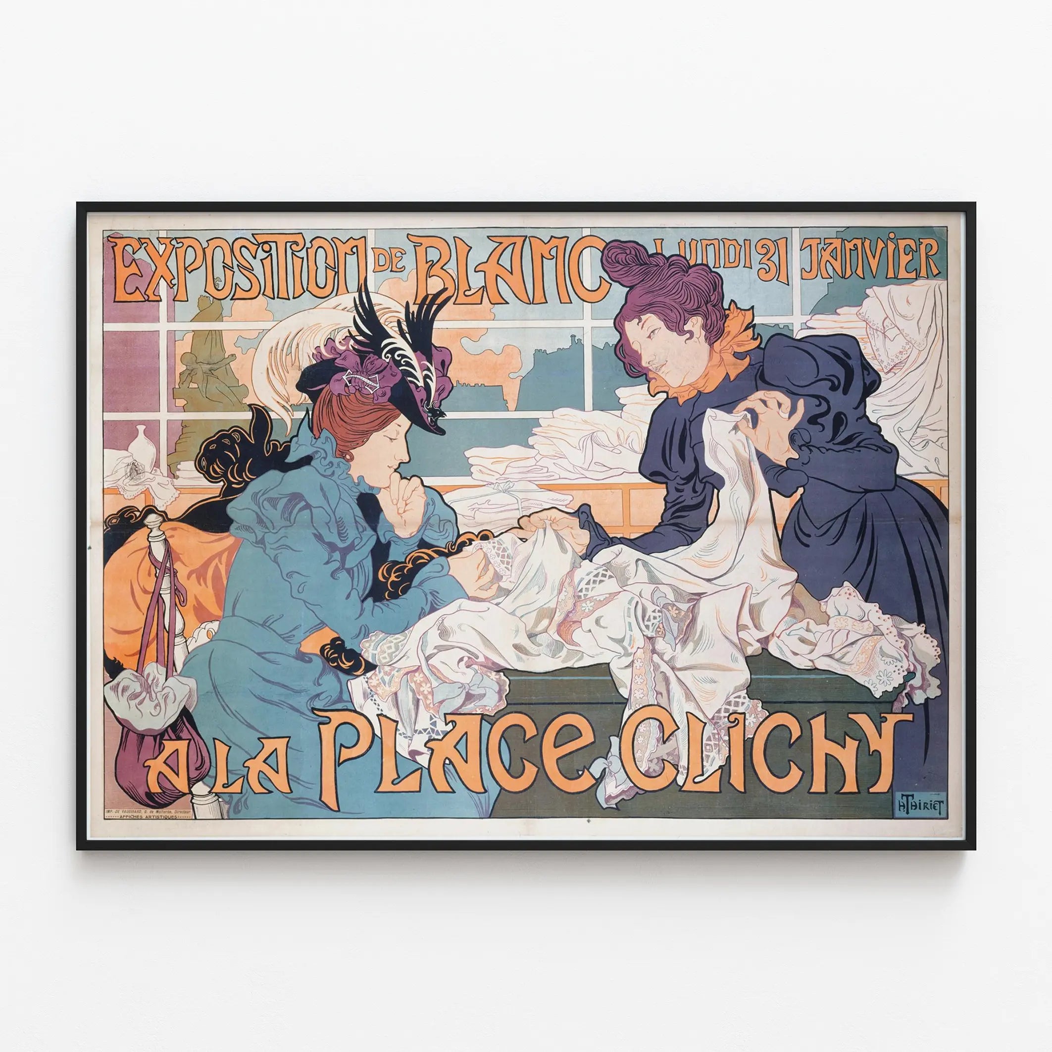Cette affiche ancienne et décorative annonce une exposition de blanc, tenue le lundi 31 janvier à la Place Clichy. Elle illustre avec finesse deux femmes élégamment habillées, absorbées dans l'examen de pièces de linge blanc, soulignant le thème central de l'exposition. Le style graphique rappelle les affiches artistiques et publicitaires du tournant du XXe siècle, avec des contours nets, des couleurs pastel et un traitement stylisé des formes. Cette affiche se distingue par son esthétique rétro, mêlant art et publicité, et constitue un bel élément de décoration murale pour les amateurs de vintage et d'art graphique ancien. Son format large et horizontal permet de l'intégrer aisément sur un mur, servant à la fois de poster décoratif et d'œuvre d'art murale. Parfaite pour apporter une touche d'élégance nostalgique à un intérieur, cette affiche évoque une ambiance parisienne classique et raffinée. Son originalité réside également dans la typographie audacieuse et ornementale utilisée pour le texte, renforçant l'aspect artistique et authentique de cette pièce. Que ce soit pour une collection privée, un salon, un bureau ou un espace d'accueil, cette décoration murale vintage invite à un voyage dans le temps et la culture graphique, sublimant tout espace grâce à son charme d'époque et ses détails soignés.