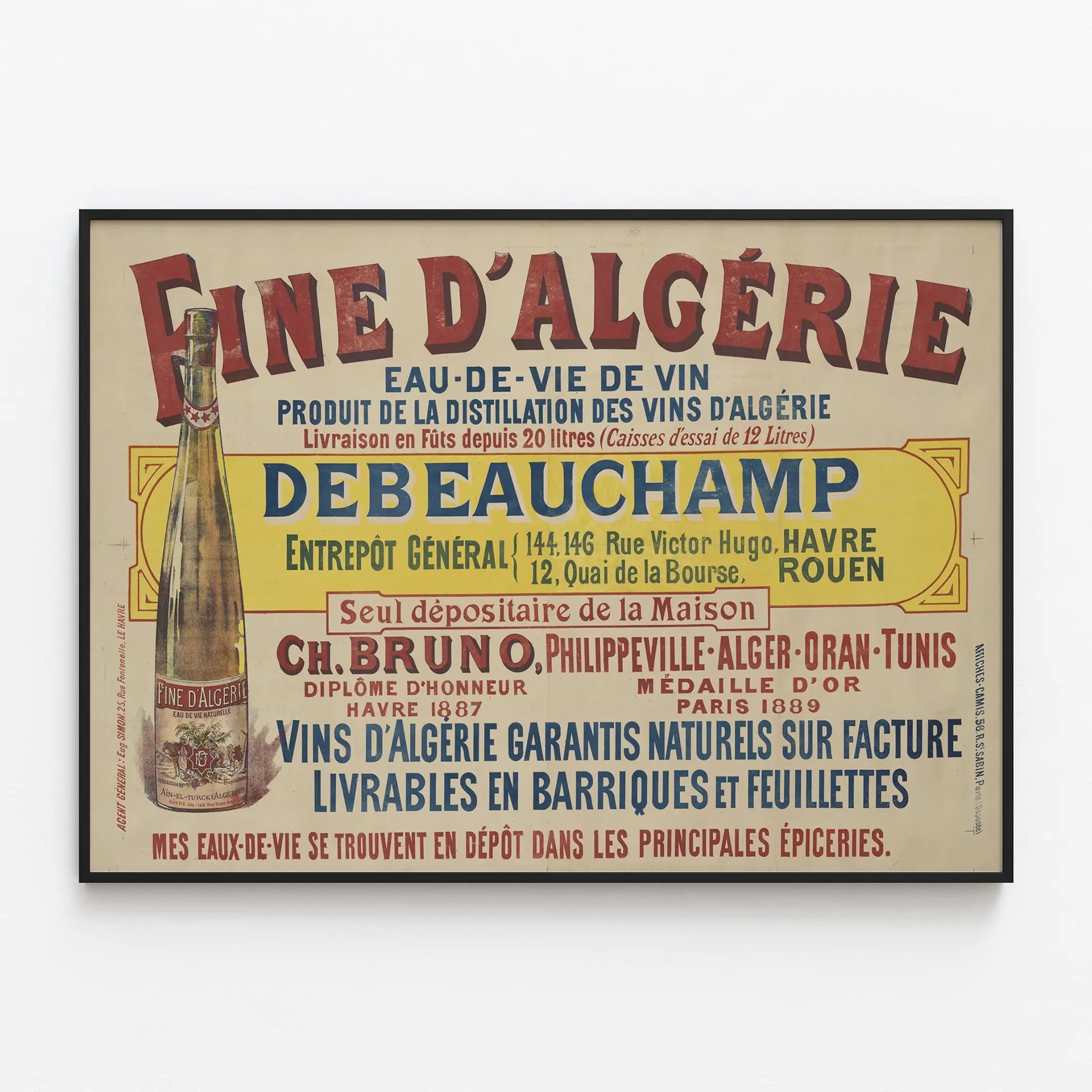 Découvrez cette affiche vintage Fine d'Algérie, une véritable pièce d'histoire et de décoration murale. Ce poster publicitaire met en avant l'eau-de-vie de vin produite par la distillation des vins d'Algérie, avec des détails précis sur les lieux de vente et la qualité garantie du produit. Parfait pour les amateurs de déco vintage et les passionnés d'affiches publicitaires anciennes, ce tableau publicitaire capture l'essence d'une époque où la publicité murale jouait un rôle central dans la promotion des produits artisanaux et locaux. L'affiche présente une bouteille illustrée à gauche, avec le texte principal qui occupe le centre et la droite. La typographie utilisée est variée et souligne différents aspects du message : du nom du produit en grand « Fine d'Algérie », aux mentions légales telles que « eau-de-vie de vin » et « produit de la distillation des vins d’Algérie ». Les noms des entrepôts au Havre et à Rouen, ainsi que les adresses, sont également soulignés, ajoutant une dimension historique et contextuelle à cette décoration murale. Cette affiche de style rétro avec ses couleurs rouges, bleues et jaunes apporte une touche d'authenticité et de charme à tout espace, que ce soit dans une cuisine, un salon ou un bar. C’est un choix idéal pour enrichir une décoration murale vintage, conjuguant à la fois esthétique et nostalgie. Les amateurs de posters publicitaires trouveront ici une pièce authentique qui évoque le patrimoine gastronomique et commercial français et algérien, mettant en avant l'élégance des anciens produits d'alcool distillés. Que vous soyez collectionneur ou simplement à la recherche d’une décoration murale unique, cette affiche « Fine d'Algérie » s’intègre parfaitement à un intérieur au style classique ou rétro. Elle invite à un voyage visuel dans une époque où la publicité sur papier servait aussi d’art décoratif, embellissant les murs tout en valorisant les produits proposés. Offrez à votre espace une ambiance chaleureuse pleine de caractère en installant ce poster vintage, symbole de la tradition et de la qualité dans la production d’eaux-de-vie de vin. Intégrez ce tableau mural à votre collection d’affiches anciennes pour un décor original et historique.