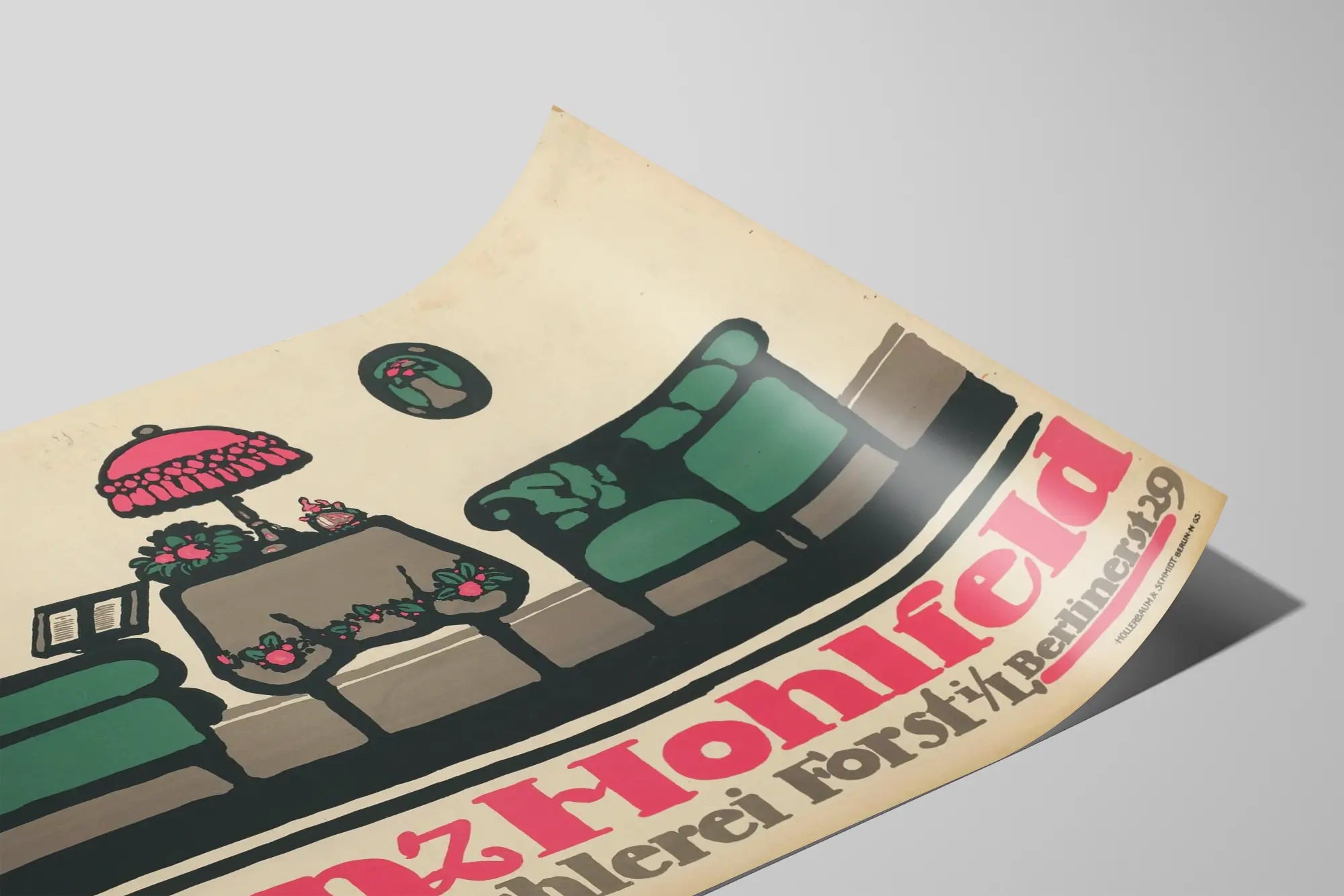 Découvrez cette affiche vintage exceptionnelle mettant en valeur l'art de la fabrication de meubles et l'ébénisterie, signée par le designer Scheurich. Ce poster publicitaire illustre une scène intérieure stylisée, où s'entrelacent harmonieusement meubles et accessoires décoratifs. Au centre, une table recouverte d'une nappe ornée de motifs floraux est surmontée d'une lampe à abat-jour rose vif, habillant l'espace d'une touche rétro élégante. De part et d'autre, deux fauteuils verts contrastent avec le fond beige, apportant confort et sérénité à la scène. Deux tableaux ovales ornés de fleurs rouges complètent la composition en symétrie, renforçant l'effet décoratif de cette illustration graphique. Ce poster est une pièce idéale pour embellir un intérieur avec une décoration murale au style vintage et artisanal. Que ce soit dans un salon, un bureau ou une boutique, ce tableau graphique attire le regard par son esthétique audacieuse et ses couleurs harmonieuses, parfait pour les amateurs de décoration intérieure recherchée et d’art publicitaire historique. Apportez une note de charme et de caractère à vos murs avec cette affiche Franz Hohlfeld, témoignage artistique et promotionnel de l'ébénisterie traditionnelle.