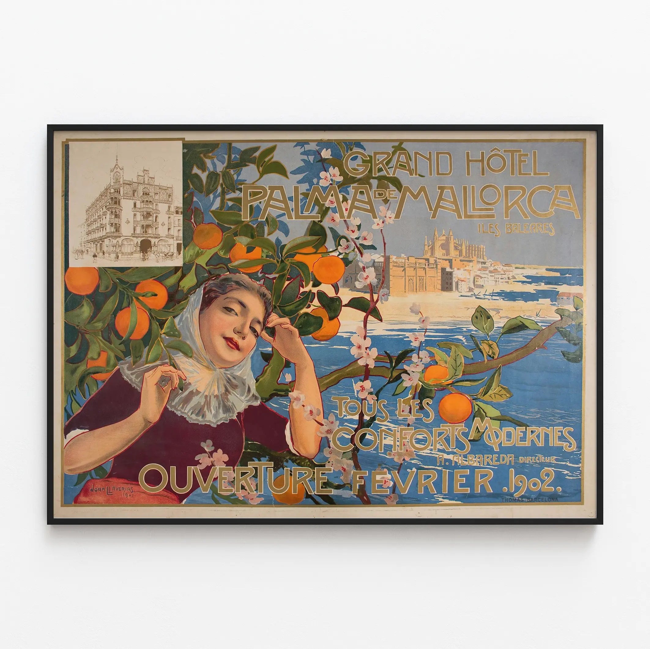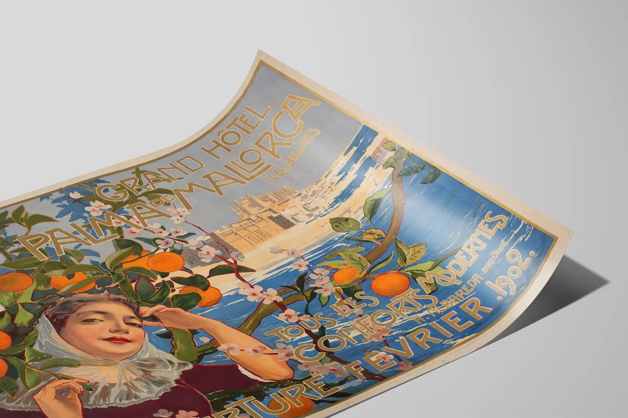 Découvrez cette superbe affiche vintage représentant le Grand Hôtel de Palma de Mallorca, une œuvre artistique datant de 1901 signée par Joan Llaverias. Cette décoration murale évoque avec élégance l'ambiance et le charme de l'hôtel à son ouverture en février 1902. L'affiche met en scène un paysage méditerranéen enchanteur, illustré par une figure féminine au style romantique entourée de branches florales et de fruits d'oranger, symboles typiques des îles Baléares. Cette affiche est une véritable invitation au voyage vers Palma de Mallorca, île espagnole célèbre pour ses panoramas maritimes et son riche patrimoine architectural. En haut à gauche, une esquisse détaillée du bâtiment principal de l'hôtel complète cette composition, ajoutant une dimension historique et architecturale à l'image. Les tons chauds et naturels, mêlés aux nuances bleues de la mer et du ciel, apportent à ce poster un aspect authentique et apaisant, idéal pour habiller un mur avec style. Parfait pour une décoration murale d'intérieur sous forme d'affiche ou de poster encadré, ce visuel s'intègre avec harmonie dans un salon, une chambre ou un bureau, apportant une touche vintage et élégante. Ce type de tableau mural peut également séduire les amateurs de décoration rétro, les passionnés de voyage ou les collectionneurs d'affiches anciennes. Grâce à son esthétique soignée et son ambiance douce, ce poster crée une atmosphère chaleureuse et accueillante. Le texte en typographie ancienne souligne les « conforts modernes » de l'hôtel à l'époque, participant aussi à l'authenticité de cette pièce décorative qui allie art et histoire. Si vous cherchez une œuvre murale originale qui combine élégance graphique et mémoire historique, cette affiche du Grand Hôtel Palma de Mallorca est un choix parfait. Elle apporte un souffle de nostalgie méditerranéenne et invite à la rêverie au cœur des Baléares.