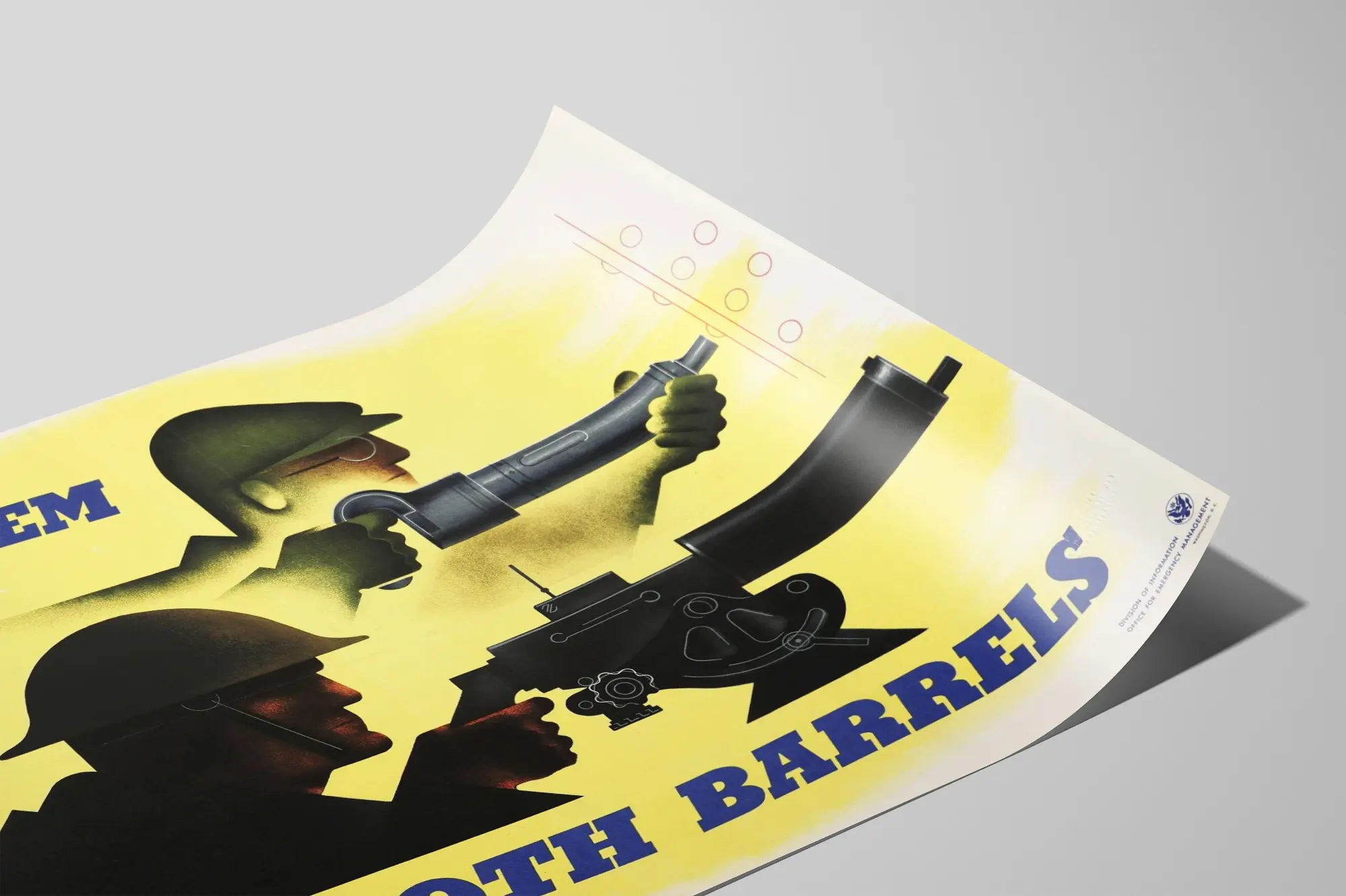 Cette affiche vintage de style illustratif met en scène deux soldats en action, armés de mitrailleuses, avec le texte accrocheur "Give 'Em Both Barrels". Sur un fond jaune lumineux, les silhouettes des combattants, aux teintes sombres et contrastées, créent un effet saisissant et impactant. Ce poster de propagande évoque une ambiance martiale typique des affiches de guerre, avec une esthétique graphique forte et minimaliste. Idéale comme décoration murale, cette affiche vintage apporte une touche rétro et militante à votre intérieur, salon ou bureau. Elle peut aussi convenir à une collection d'affiches historiques ou à un style décoratif industriel. Le choix des couleurs et le dessin stylisé en font une pièce remarquable qui attire l'œil et stimule l'imagination. Cette décoration murale est parfaite pour ceux qui apprécient l'art graphique du XXe siècle, avec son message direct et percutant, combiné à un style visuel épuré et puissant. Accrochez ce poster sur un mur clair pour mettre en valeur ses contrastes ou associez-le à d'autres affiches vintage pour un effet rétro complet. Ce tableau d'affichage apporte ainsi une touche d'authenticité et d'histoire, tout en sublimant l'ambiance d'une pièce par son dynamisme visuel et son graphisme emblématique.