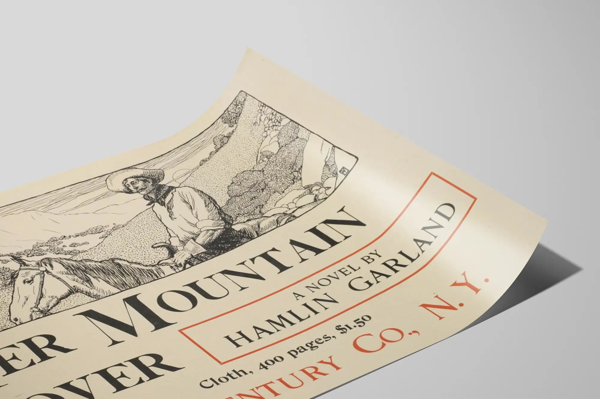 Cette décoration murale est idéale pour les amateurs de littérature classique et des atmosphères montagnardes. L'affiche met en avant le titre "Her Mountain Lover" en grandes lettres majuscules, complété par le nom de l'auteur Hamlin Garland. Le cadre contient également des détails typographiques soignés, ajoutant une touche d'authenticité et d'élégance à l'ensemble du visuel.