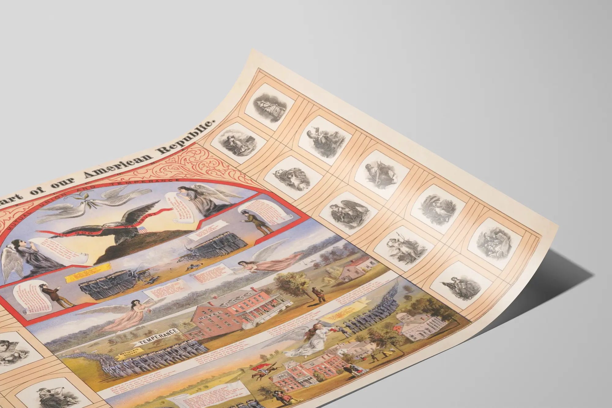 Cette affiche vintage titrée « Illustrated Chart of our American Republic » est une décoration murale riche en illustrations et symboles historiques. Elle se présente comme un poster éducatif et artistique, parfait pour les passionnés d'histoire américaine et les amateurs de décoration murale au style rétro. Le tableau central est encadré par des gravures en noir et blanc représentant des personnages et scènes diverses, encadrées de voûtes architecturales qui donnent une structure visuelle équilibrée et harmonieuse à l'ensemble. Au centre de cette affiche, on découvre plusieurs scènes symboliques : une représentation de la paix avec une colombe stylisée portant un ruban « In God We Trust », des figures angéliques tenant des parchemins manuscrits, ainsi qu’une illustration de soldats en rangs sur un champ de bataille, suggérant un thème patriotique et la lutte pour la protection de la nation. La composition inclut également des illustrations de scènes rurales et urbaines, avec un hôtel et une école, mettant en valeur les valeurs sociales et éducatives. Chaque section est riche en détails et présente des inscriptions en anglais, qui participent au récit visuel de cette représentation historique. Cette affiche vintage pour décoration murale allie à la fois un esthétisme classique et un contenu historique. Elle conviendra particulièrement aux intérieurs qui souhaitent ajouter une touche d'authenticité et de culture avec une pièce murale au style ancien. Que ce soit pour un bureau, une bibliothèque, un salon ou une salle d'étude, cet objet décoratif donne du caractère à vos murs et suscite la curiosité grâce à sa richesse iconographique. En terme de style, cette affiche adopte des couleurs douces et légèrement sépia, typiques des documents anciens, qui s'intègrent facilement dans des décors contemporains ou vintage. Cette décoration murale peut aussi s'accorder avec d'autres posters ou tableaux à thème historique ou patriotique, renforçant une ambiance élégante et studieuse dans votre espace. En résumé, cette affiche est un choix parfait pour les amateurs de décoration nostalgique et culturelle, offrant un mélange réussi entre art graphique et évocation de l'histoire américaine. Elle se présente comme un tableau et poster mural particulièrement complet, narratif et visuellement captivant, idéal pour enrichir tout intérieur avec une touche d’authenticité et de mémoire visuelle.
