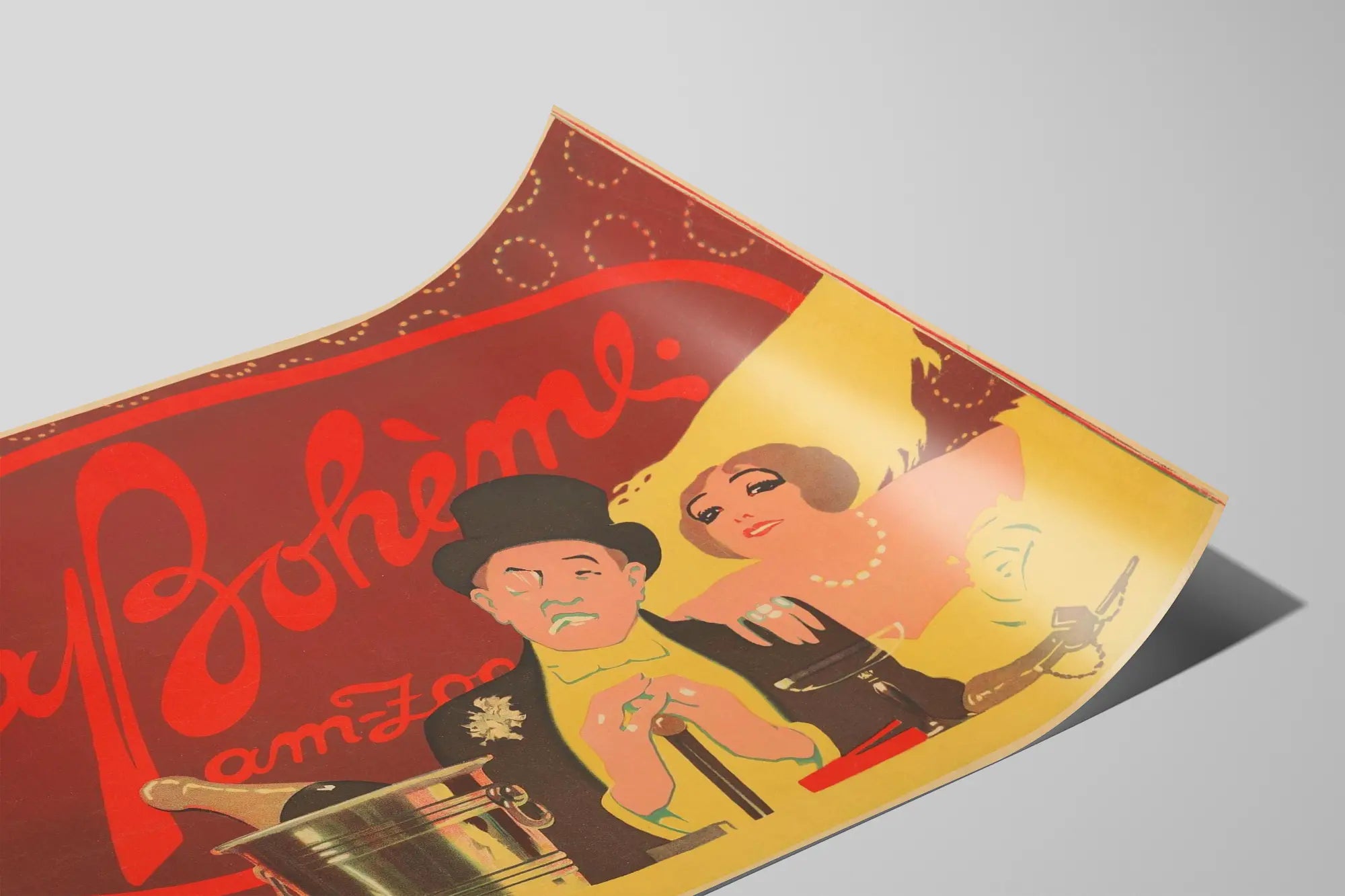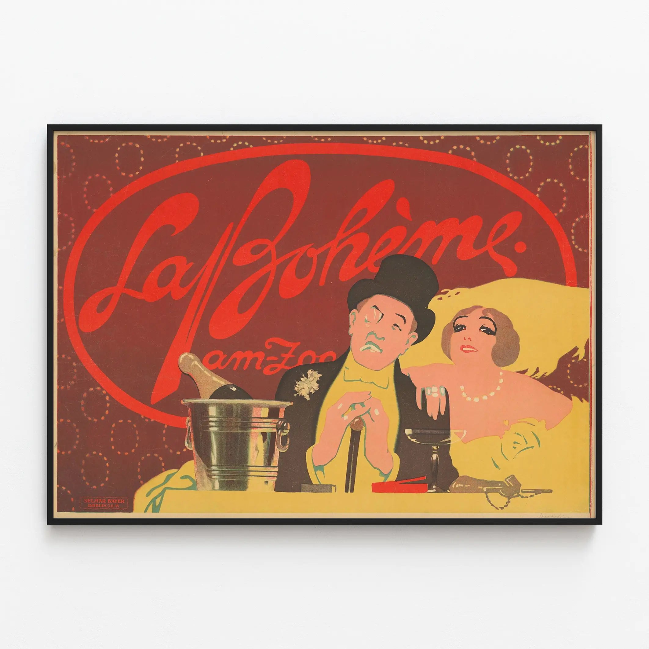 Cette affiche vintage "La Bohème am Zoo" est une décoration murale idéale pour les amateurs d'art rétro et de design graphique des années 1900. Proposant une scène élégante où un homme en haut-de-forme et une femme en robe de soirée se tiennent côte à côte, cette affiche capture l'esprit d'une époque chic avec ses couleurs chaudes et son style illustratif typique des affiches de spectacle. Le fond rouge encadre le titre très lisible "La Bohème am Zoo" inscrit en lettres cursives, enveloppé d'un cercle rouge qui attire immédiatement le regard. Cette œuvre graphique met en avant des éléments comme une bouteille de champagne dans un seau, un verre de vin, et la mise en valeur d'accessoires de mode comme le collier de perles et les bagues, qui ajoutent à l’ambiance festive et sophistiquée. Parfaite pour une décoration murale vintage, elle apporte une touche d'élégance et un charme ancien à tout intérieur. Ce poster décoratif s'intègre facilement dans un salon, un bureau ou un espace dédié à la culture et aux beaux-arts, tout en évoquant une atmosphère rétro sur le thème du spectacle et de la fête urbaine. Que ce soit en décoration d'appartement ou pour embellir un espace culturel, cette affiche est un choix parfait pour les passionnés de graphiques d'époque et de visuels artistiques singuliers.
