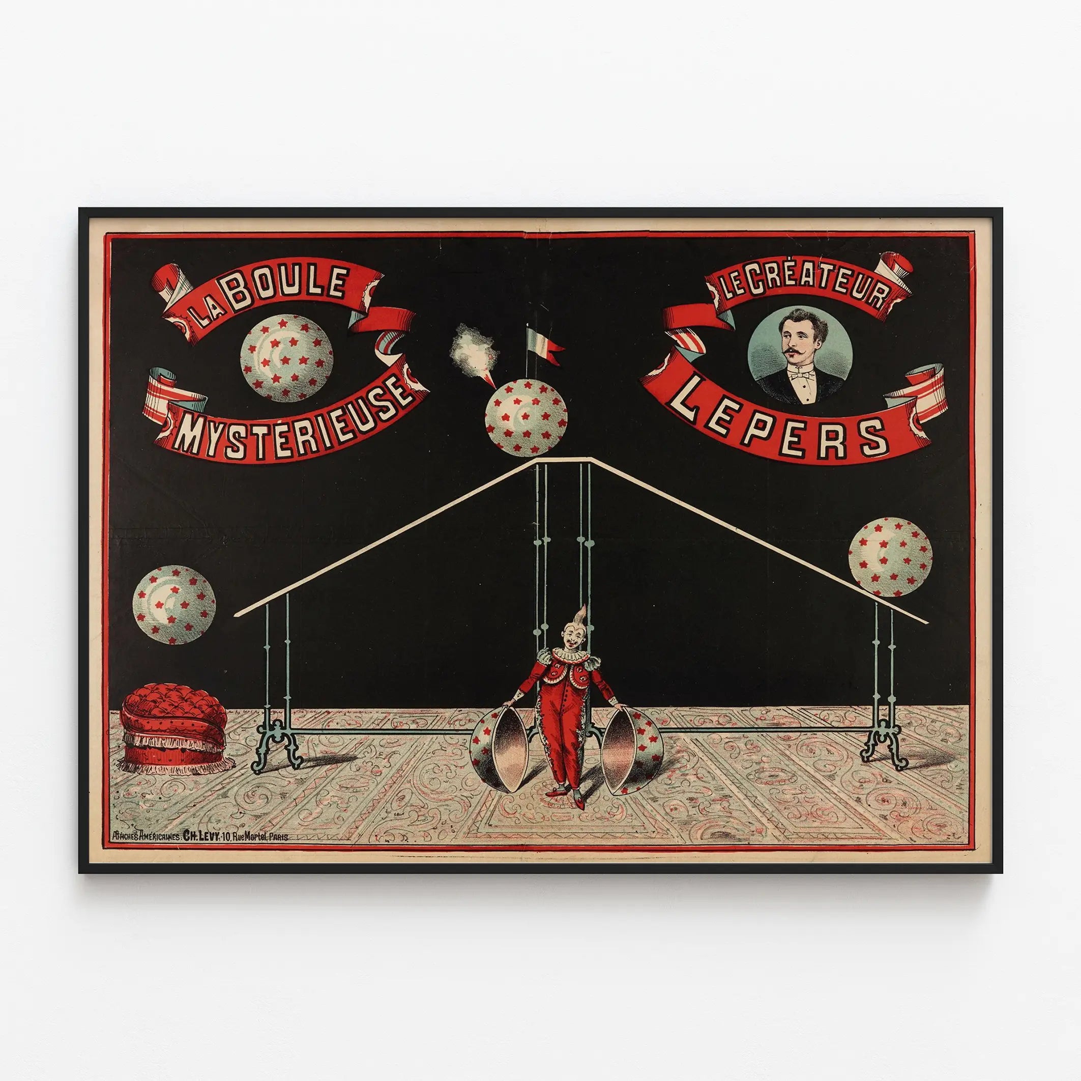 Découvrez cette affiche vintage de décoration murale intitulée « La Boule Mystérieuse », signée par Le Créateur Lepers. Ce poster ancien présente un univers mystérieux et fascinant, évoquant l'atmosphère d'un spectacle de cirque ou de magie. Sur un fond noir profond, plusieurs boules argentées ornées d'étoiles rouges sont représentées en suspension, renforçant le côté énigmatique de la composition. Le personnage central, un clown en costume rouge avec un col en dentelle blanche, tient deux moitiés de boule ouvertes, suggérant un tour intrigant ou une illusion. L'affiche est bordée d'un cadre rouge qui accentue les couleurs vives et le graphisme saisissant. Un tapis richement décoré orne le sol, ajoutant une touche de raffinement et d'élégance à cette illustration. Deux banderoles rouges enroulées portent les inscriptions « La Boule Mystérieuse » et « Le Créateur Lepers », accompagnées d'un portrait masculin en médaillon suggérant la figure de l'artiste ou du maître du spectacle. Cette affiche vintage est une pièce originale qui s'adresse aux amateurs de décoration murale au style rétro, aux passionnés de spectacles anciens ou aux collectionneurs d'art graphique. Elle apportera une touche unique et intrigante à votre intérieur, que ce soit dans un salon, un bureau ou une salle dédiée à la création artistique. Disponible en format poster, ce tableau mural peut être facilement encadré pour sublimer votre décoration intérieure avec une ambiance énigmatique et pleine de charme. Apportez à vos murs cette invitation au mystère et à l'imagination grâce à ce chef-d'œuvre graphique évoquant la magie et l'art du spectacle ancien.