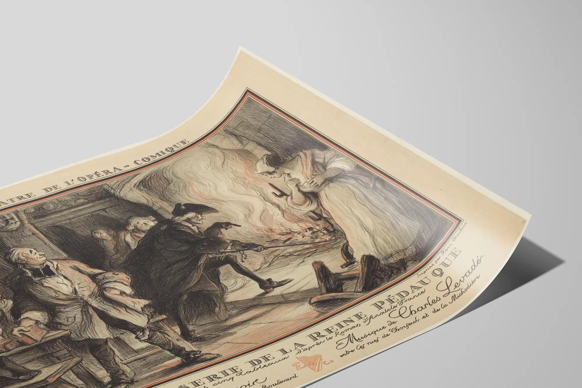 Cette affiche vintage intitulée « La Rôtisserie de la Reine Pédauque » illustre une scène emblématique du Théâtre National de l'Opéra-Comique, un lieu incontournable de la culture théâtrale et musicale française. Cette pièce, représentée ici en quatre actes et cinq tableaux, est adaptée du roman d'Anatole France. La scène représentée met en lumière plusieurs personnages dans un intérieur chaleureux, autour d'un grand feu à la cheminée, évocateur d'une ambiance du passé. On distingue des costumes d'époque, rendant hommage au style historique et au contexte théâtral d'antan. Cette décoration murale au charme ancien s'adresse aux amateurs d'art classique et de théâtre, ajoutant une touche d'authenticité et de culture dans leur espace de vie. Avec son style graphique unique mêlant crayons de couleur et traits de crayon, cette affiche s'impose comme une pièce décorative raffinée, parfaite pour un salon, une bibliothèque ou même une salle dédiée à la musique et au spectacle. Le texte manuscrit en bas de l'affiche mentionne les intervenants, y compris le poème de Georges Docquois et la musique de Charles Levadé, soulignant l'importance de la collaboration artistique dans cette œuvre. Grâce à cette affiche, la décoration murale gagne en caractère, avec une atmosphère nostalgique et théâtrale à la fois, idéale pour les passionnés d'opéra comique et d'illustrations historiques. Ce poster vintage est une pièce maîtresse qui saura capter l'attention tout en racontant une histoire culturelle riche, parfaite pour enrichir une collection d'art ou décorer une pièce avec élégance et authenticité.