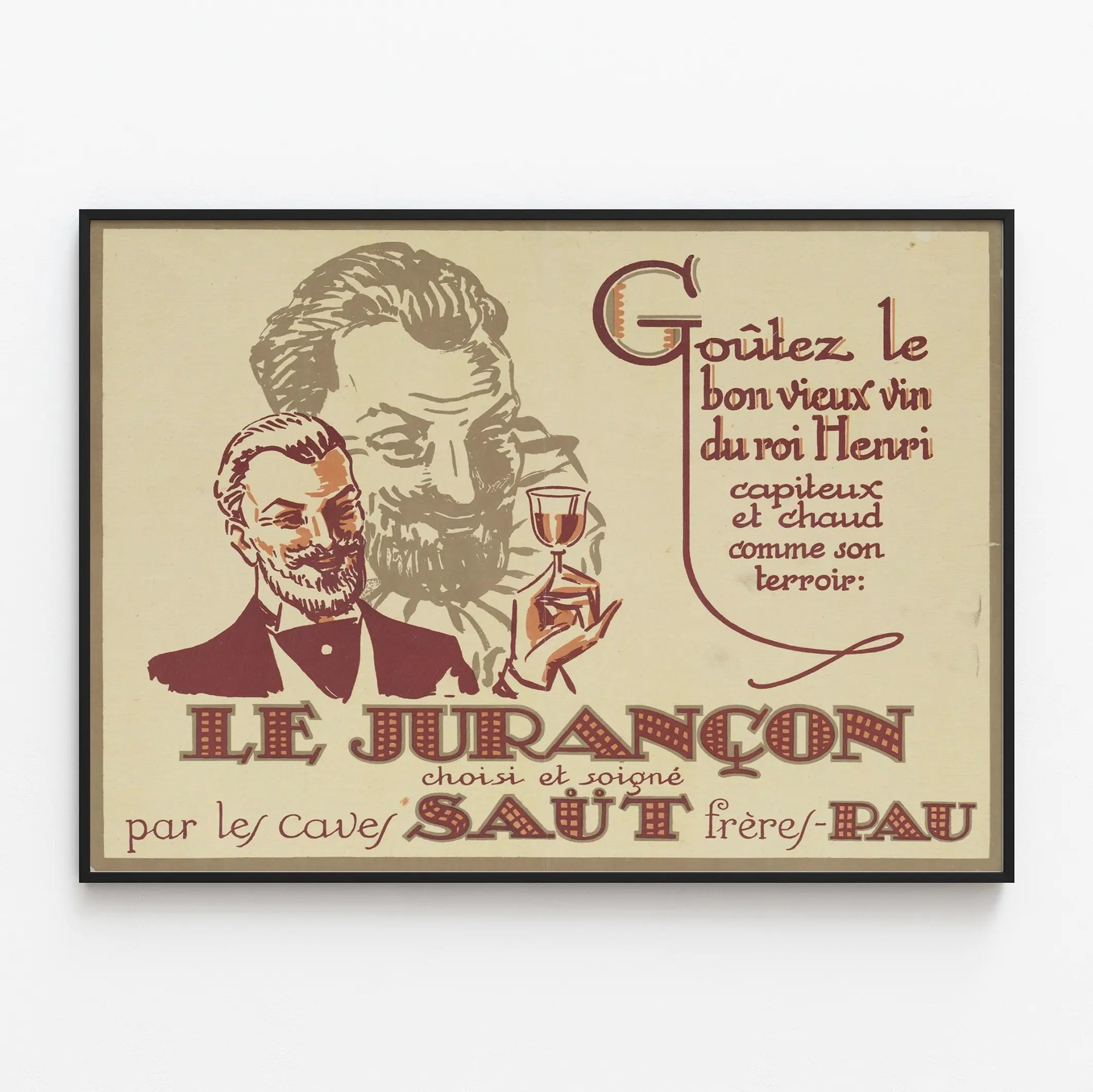 Cette affiche vintage Le Jurançon choisi et soigné par les Caves Saut Frères est une pièce de décoration murale parfaite pour les amateurs d'art rétro et de traditions viticoles françaises. Ce poster publicitaire met en valeur le vin de Jurançon, réputé pour sa richesse et sa chaleur, comparé ici au bon vieux vin du roi Henri. L'illustration présente un homme élégant tenant un verre de vin, soulignant l'aspect capiteux et chaleureux de ce terroir exceptionnel. Les couleurs chaudes et le style graphique typique des affiches anciennes apportent une touche d'authenticité et de charme à cet élément décoratif. Idéal pour habiller un intérieur à la recherche d'une ambiance vintage ou pour enrichir une collection dédiée au patrimoine œnologique et culturel. Cette décoration murale s'intégrera parfaitement dans une cuisine, une salle à manger ou un espace bar, où elle attirera le regard et éveillera la curiosité des visiteurs. Le texte manuscrit et la typographie soignée renforcent l'atmosphère d'époque et le message publicitaire d'antan, rendant ce tableau une véritable invitation à la dégustation et à la découverte des vins du sud-ouest de la France. Pour les passionnés de décor rétro et les amoureux du vin, cette affiche Le Jurançon est un choix singulier et élégant qui valorise à la fois l'art graphique et le patrimoine viticole français.