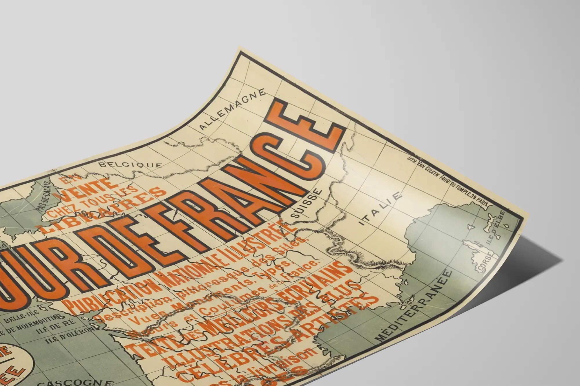 L’affiche montre une carte géographique avec des inscriptions en lettres capitales orange et noires qui soulignent le titre "LE TOUR DE FRANCE" en grand, attirant immédiatement le regard. Plusieurs informations textuelles sont également présentes en orange, indiquant qu’il s’agit d’une publication nationale illustrée, décrivant des sites, monuments, types, moeurs et coutumes de France, enrichie par des textes d’écrivains renommés et des illustrations d’artistes célèbres. Ce poster donne un aspect culturel fort qui plaira aux amateurs d’histoire et de patrimoine français.