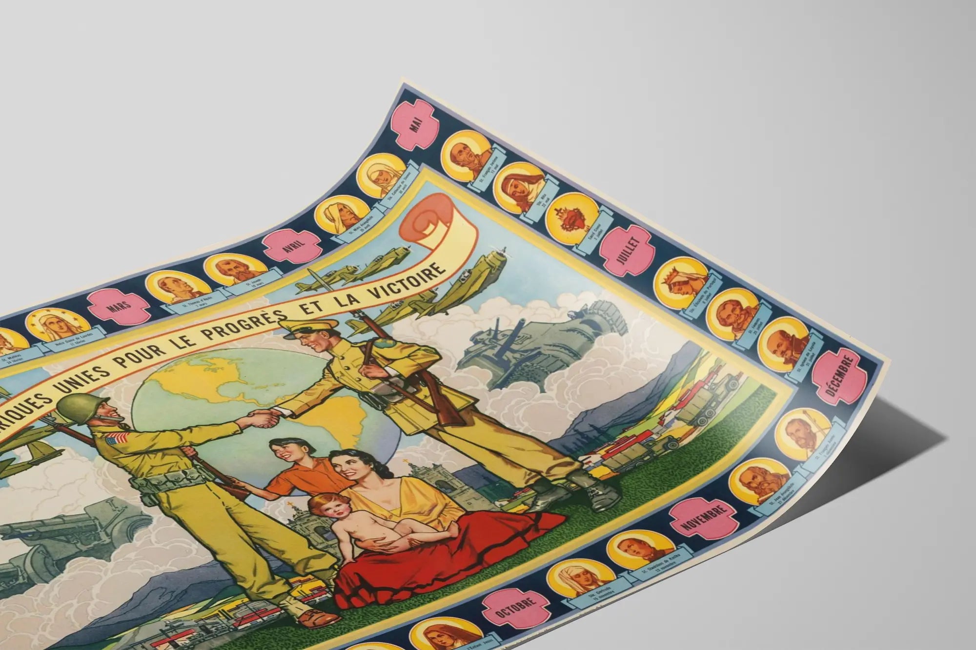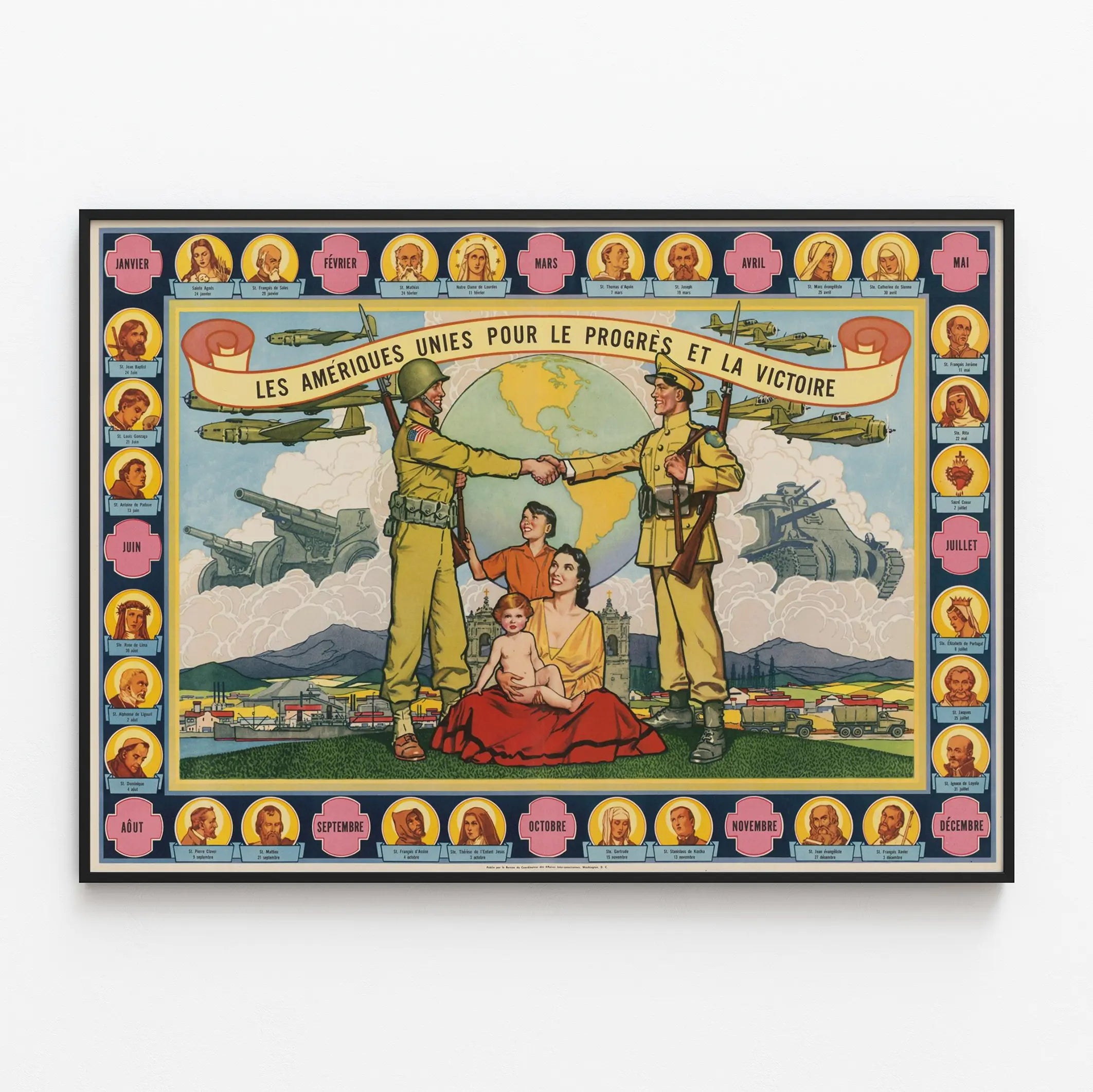 Découvrez cette affiche vintage intitulée "Les Amériques Unies pour le Progrès et la Victoire", une pièce de décoration murale riche en symboles et en histoire. Ce poster met en scène deux soldats sains et souriants, l’un américain et l’autre latino-américain, qui se serrent la main devant un globe terrestre mettant en valeur le continent américain. Cette image emblématique véhicule un message d’unité et de solidarité entre les Amériques, notamment dans un contexte de conflit ou de mobilisation. Au centre, une femme et deux enfants symbolisent la paix et l'espoir pour l'avenir, contrastant avec le décor militaire qui encadre la scène. Armes, chars, avions de combat et avions bombardiers forment une toile de fond évoquant le progrès technologique et la défense. Ces éléments représentent la puissance et la collaboration militaire des pays américains pour atteindre la victoire et le progrès social. La présence d’un paysage rural et industriel en bas de l’affiche suggère également le développement économique et le travail collectif. Le cadre de cette affiche est orné de portraits de saints et de personnalités historiques associées à chaque mois de l’année, apportant une dimension spirituelle et culturelle à l’ensemble. Ces éléments soulignent l’ancrage religieux et la tradition dans la société américaine à cette époque. Cet encadrement autour de la scène principale ajoute un aspect calendrier, rappelant la continuité et la persévérance tout au long de l’année. Cette affiche est idéale pour une décoration murale authentique, parfaite pour les amateurs d’histoire, de mémoires de conflits et de symboliques patriotiques. Son style graphique et ses couleurs vives en font un poster attrayant qui s’adapte aussi bien dans un salon, un bureau ou une bibliothèque. Ce tableau mural vintage s’inscrit dans une thématique de propagande positive affichant la fraternité internationale et la lutte commune pour un avenir meilleur. Apportez une touche décorative unique à votre intérieur avec cette affiche murale qui représente l’union des Amériques dans un élan de progrès et de victoire. Un choix parfait pour enrichir un mur avec une image forte, pleine de signification historique et culturelle, tout en valorisant une approche décorative classique et vintage.
