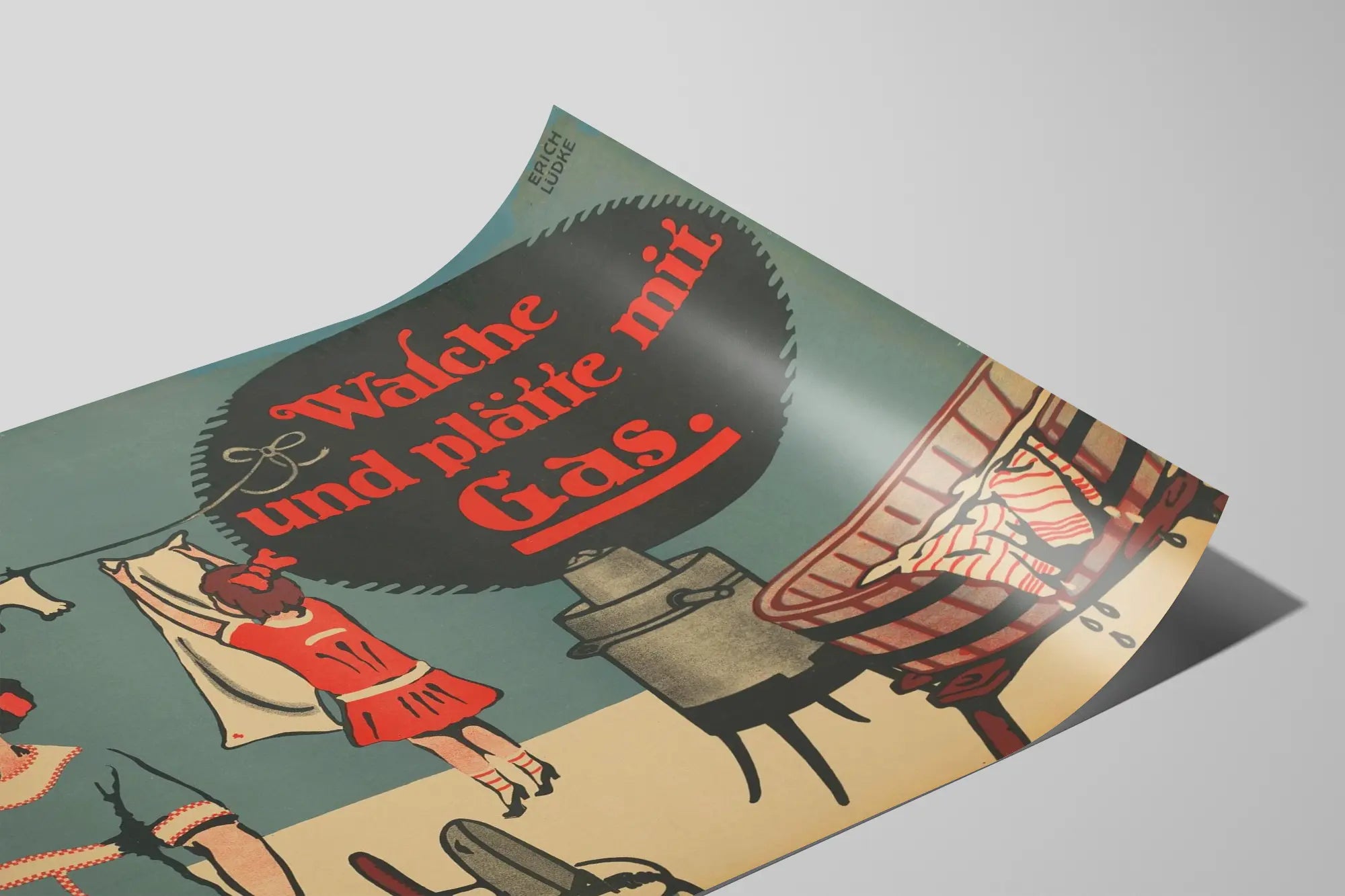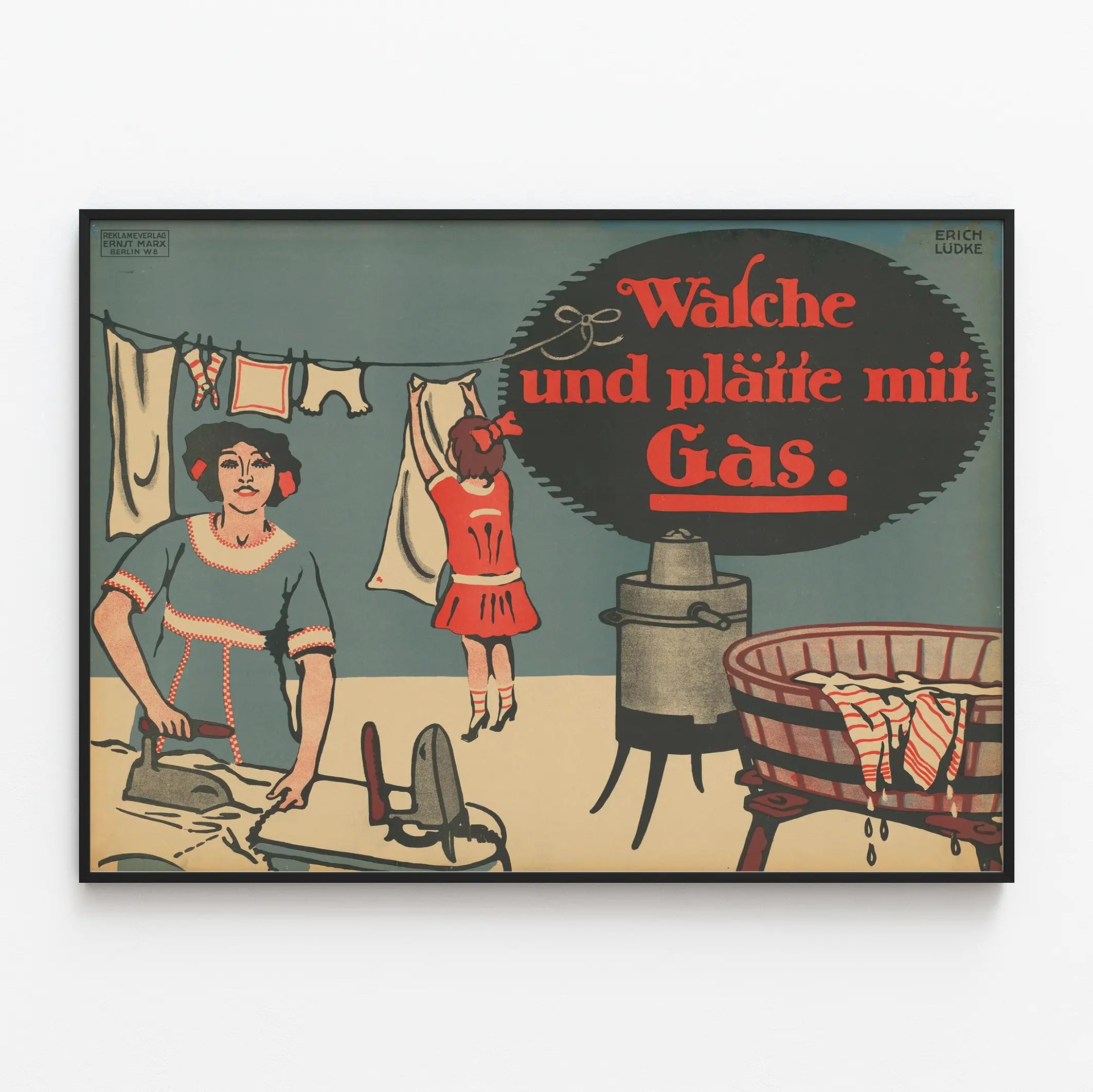 Cette affiche vintage représente une scène de vie quotidienne centrée sur le lavage et le repassage du linge à l’aide du gaz. On y voit une femme s’affairant à repasser des vêtements avec un fer à repasser ancien, tandis qu’une petite fille accroche du linge sur un fil à linge. À droite, un équipement de lavage au gaz, vraisemblablement chauffant une cuve ou bassin, complète la scène. Le texte "Wasche und plätte mit Gas" est inscrit en lettres rouges dans une bulle noire, soulignant l’usage du gaz pour ces tâches ménagères. Cette affiche murale offre un style décoratif rétro, caractérisé par un dessin simple utilisant une palette de couleurs limitée : tons de beige, rouge, gris et bleu-gris. La composition est équilibrée, avec les personnages placés à gauche et au centre, et le texte principal occupant un espace important à droite, assurant une bonne lisibilité et un impact visuel fort. Ce type d'affiche peut être utilisé en décoration murale pour apporter une touche d’authenticité et de charme rétro à un intérieur. Elle est idéale pour une décoration murale dans un espace de vie, une cuisine ou un coin dédié au linge, offrant une ambiance vintage et nostalgique. L’affiche combine ainsi esthétisme et storytelling, évoquant le quotidien des années passées avec des éléments iconiques comme le fer à repasser, les vêtements suspendus et la cuve de lavage chauffée au gaz. En tant que poster ou élément décoratif, cette affiche vintage s’intègre facilement dans des styles variés, notamment le style industriel, rétro ou encore le style scandinave industriel. Son design épuré, ses couleurs sobres et son thème familier contribuent à en faire un objet décoratif attractif pour les amateurs de décoration murale thématique et historique.