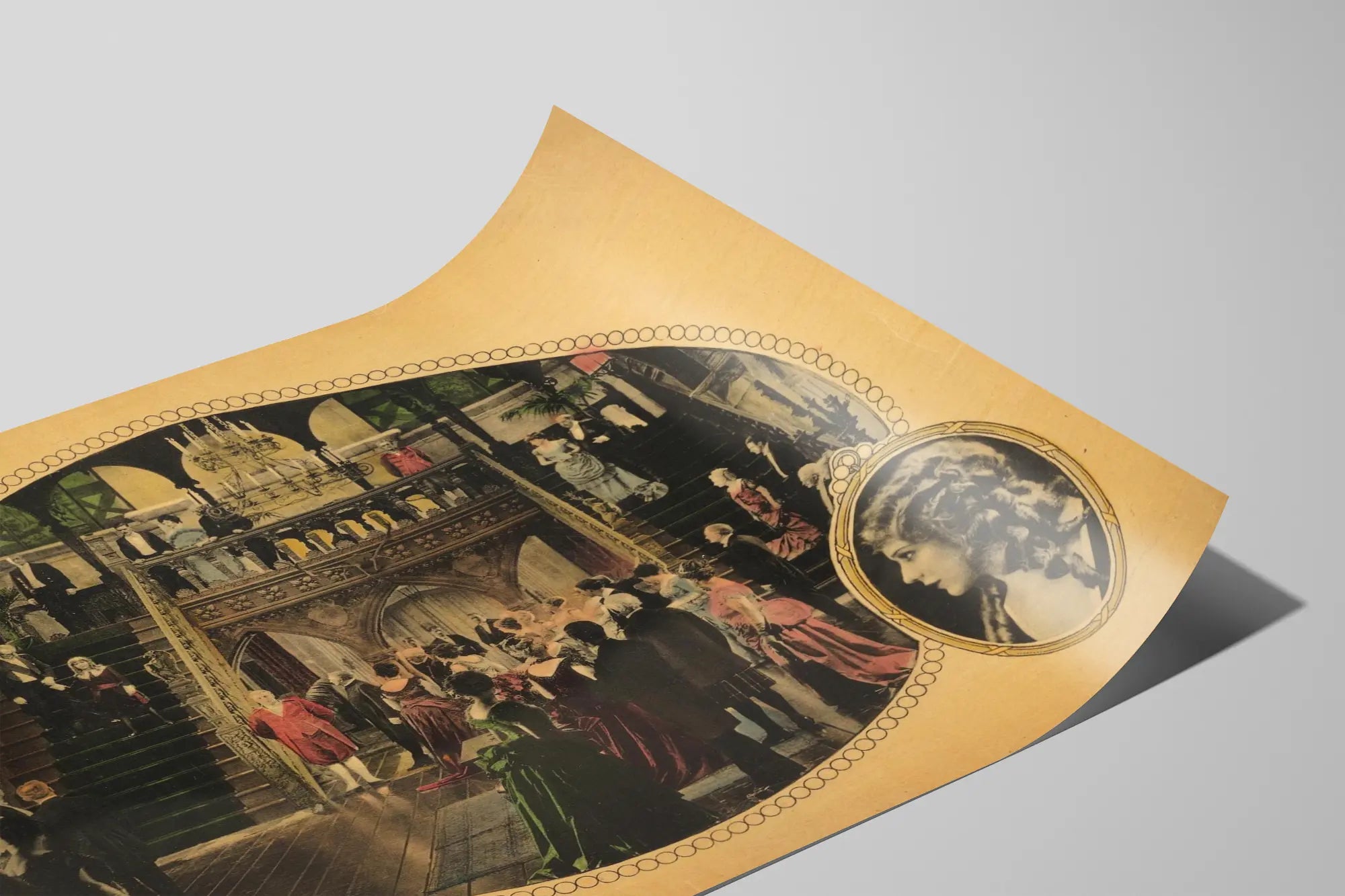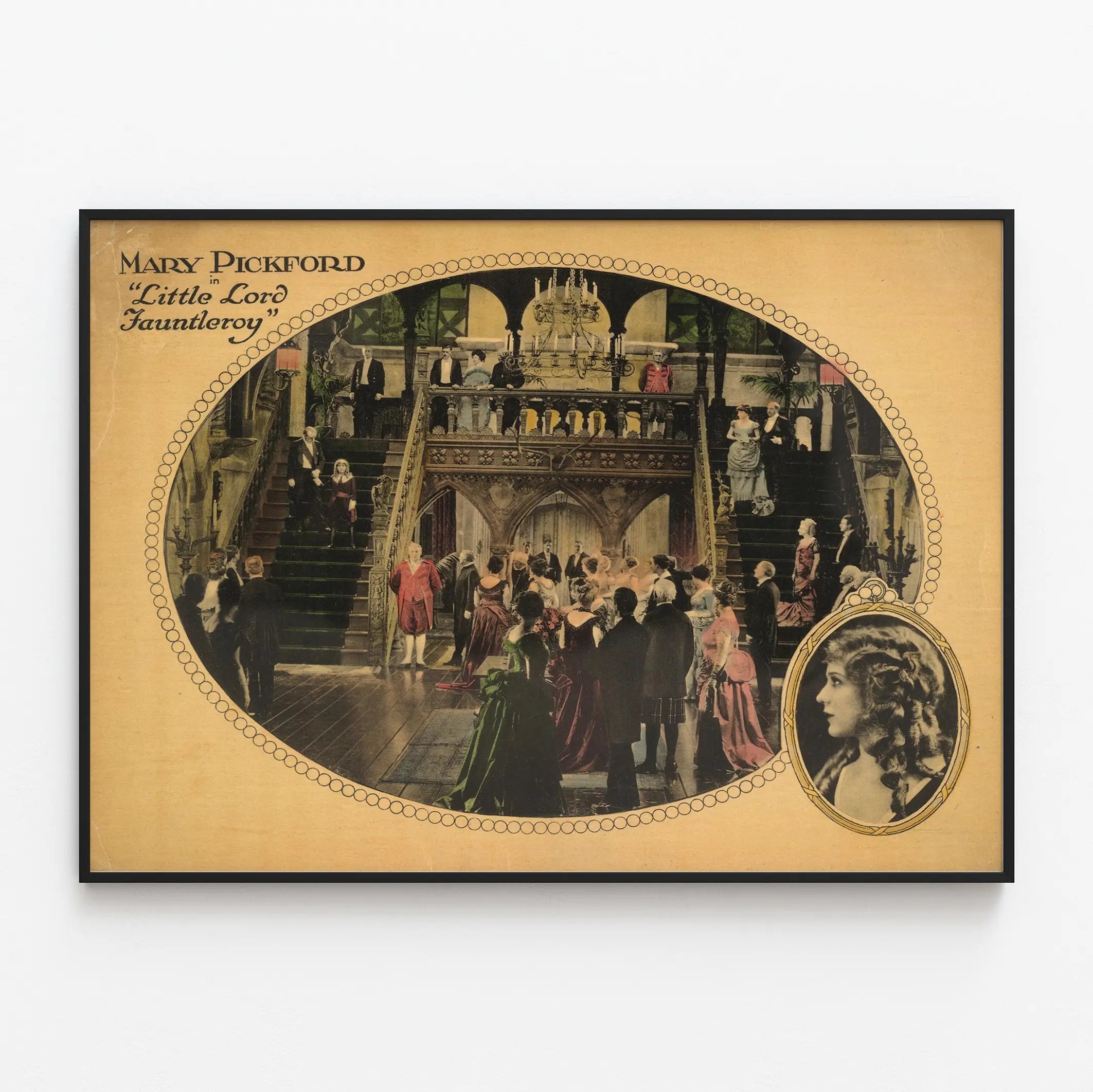 Découvrez cette affiche vintage de décoration murale représentant une scène du film "Little Lord Fauntleroy" avec Mary Pickford, une icône du cinéma muet. Cette affiche artistique offre une plongée dans l'ambiance élégante et sophistiquée d'une réception dans un grand manoir, illustrée par des personnages vêtus de costumes d'époque et une somptueuse architecture intérieure. La composition ovale met en valeur un escalier central richement décoré où se tiennent des invités en tenue de gala, tandis qu'un portrait ovale de Mary Pickford encadre la scène en bas à droite, renforçant l'aspect rétro et emblématique de cette affiche. Parfaite pour les amateurs de décoration murale classique et d'affiches de films anciens, cette pièce apporte une touche d'authenticité et de charme historique à tout espace. Ce poster est idéal pour habiller un mur avec une esthétique nostalgique tout en évoquant le glamour et le raffinement du début du XXe siècle. Que ce soit dans un salon, un bureau ou une salle dédiée au cinéma, cette affiche originale s'impose comme un élément décoratif intense qui captive le regard et enrichit l'espace. Pour les passionnés de décoration murale, ce poster vintage de "Little Lord Fauntleroy" avec Mary Pickford conjugue histoire, esthétique et art cinématographique pour une décoration intérieure remarquable.