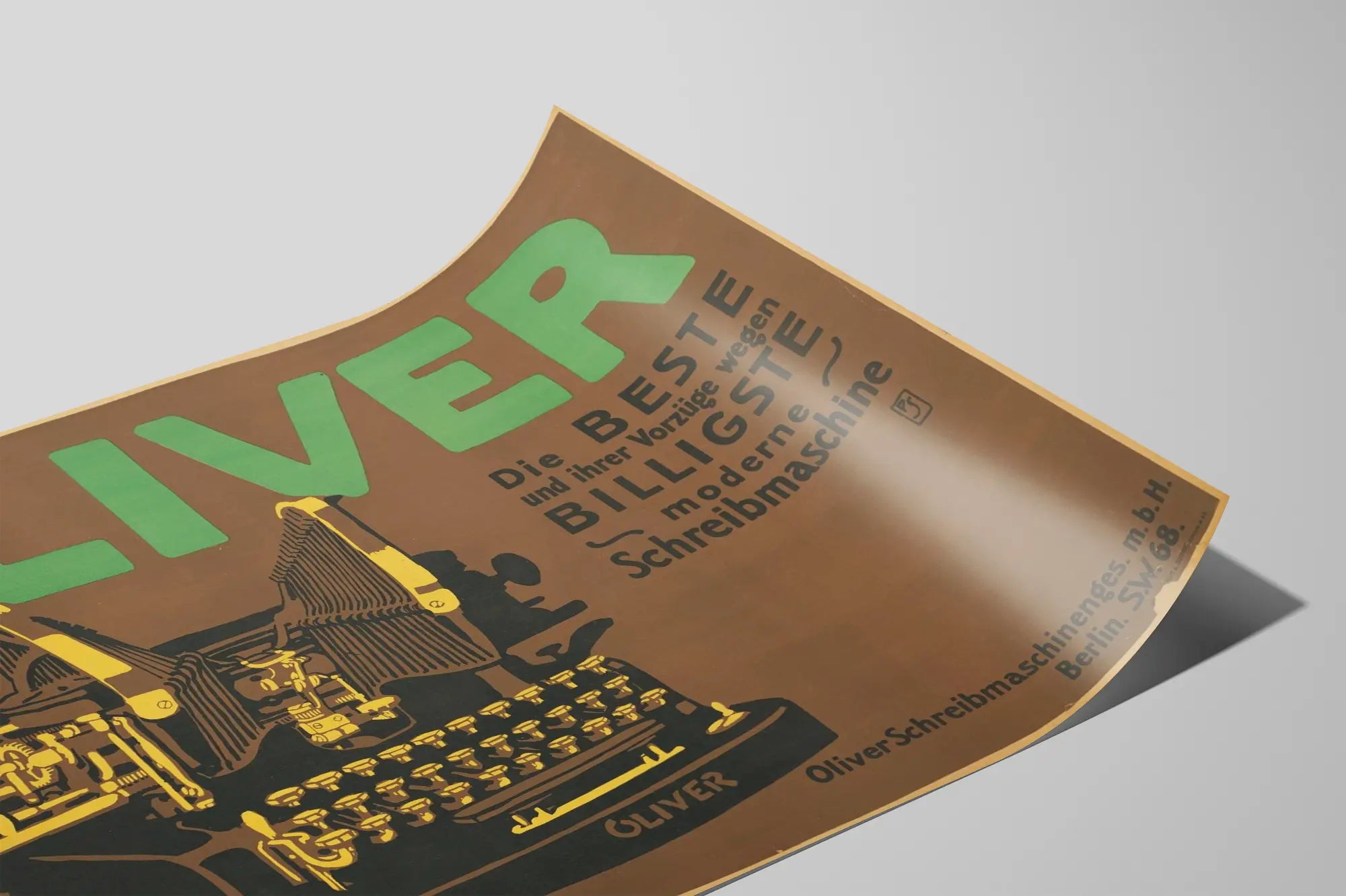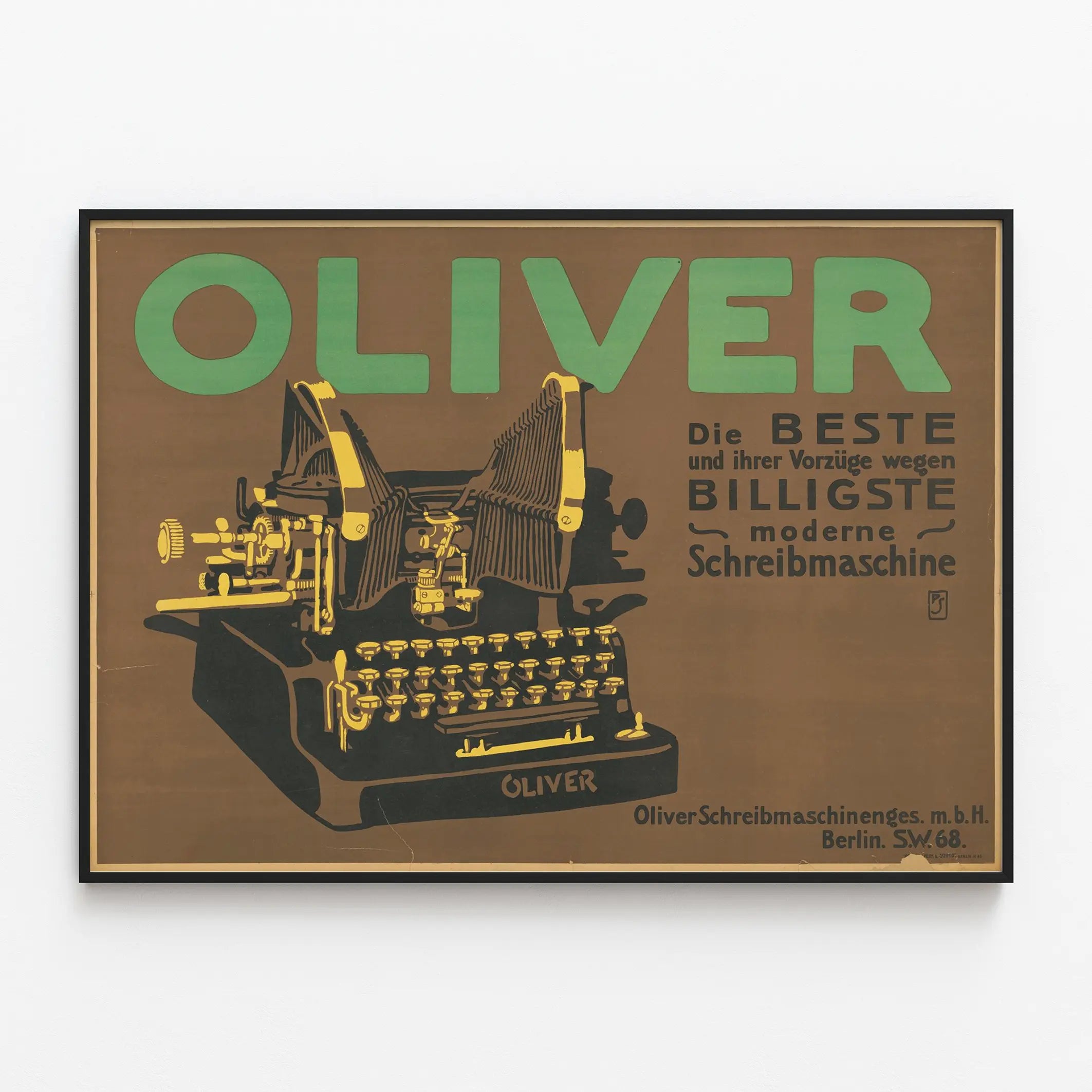Cette affiche vintage présente une machine à écrire OLIVER, mise en lumière avec des teintes contrastées de noir, jaune et vert sur un fond marron. Le design graphique met en avant le produit avec un style rétro, caractéristique des affiches publicitaires anciennes. Le grand mot "OLIVER" en vert attire immédiatement le regard, symbolisant la marque emblématique de machines à écrire. La typographie allemande classique accompagne une illustration détaillée de la machine, soulignant ses caractéristiques techniques et son allure mécanique. L'inscription en allemand indique que l'OLIVER est "la meilleure et la moins chère" machine à écrire moderne, valorisant ainsi ses qualités et son accessibilité. Ce poster est un excellent choix pour une décoration murale qui souhaite évoquer l'univers des bureaux anciens ou l'évolution technologique avant l'ère digitale. Son style graphique sobre et ses couleurs vintage en font un élément décoratif idéal pour une ambiance industrielle ou rétro, à placer dans un bureau, une bibliothèque ou un espace de travail. Ce tableau mural, classique et authentique, peut aussi séduire les passionnés de typographie et d'objets anciens, apportant une touche historique à votre intérieur. En somme, cette affiche OLIVER est une pièce décorative d'exception, alliant esthétique et mémoire industrielle pour embellir vos murs avec style.