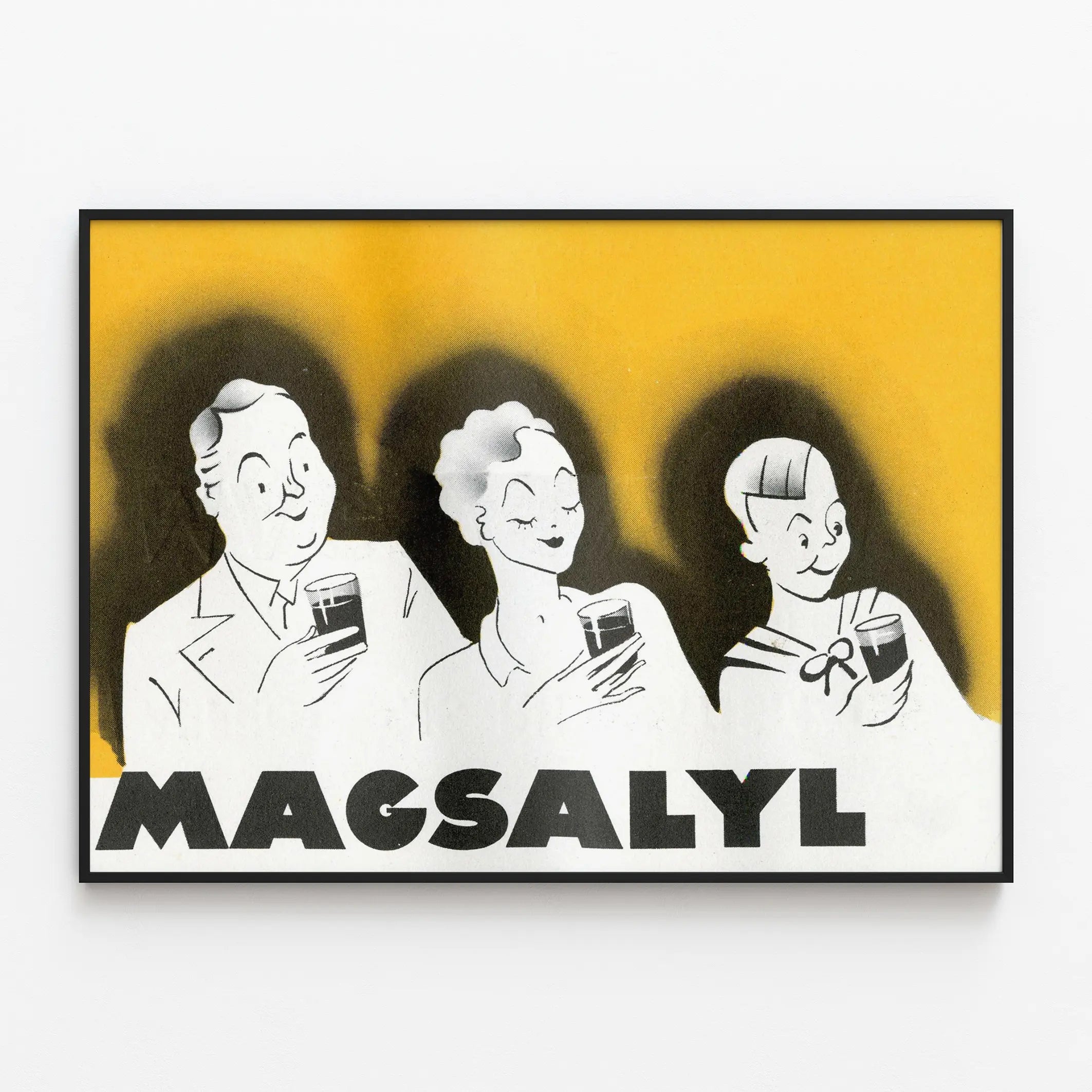 Cette affiche vintage MAGSALYL est un exemple parfait de décoration murale rétro, apportant une touche nostalgique et chaleureuse à votre intérieur. Représentant trois personnages souriants tenant chacun un verre, cette illustration en noir et blanc se détache sur un fond jaune lumineux, créant un contraste visuel saisissant qui attire naturellement l'œil. Le style graphique évoque les affiches publicitaires des années mid-20e siècle, avec un dessin simple mais expressif et une composition efficace, caractéristique des campagnes promotionnelles de cette époque. L'affiche MAGSALYL s'inscrit idéalement dans un cadre de déco vintage ou rétro, mais sa palette de couleurs limitée et son graphisme épuré permettent également de l'intégrer dans des espaces modernes avec une touche d'originalité. Que ce soit pour embellir un salon, une cuisine ou même un espace bar, ce poster mural apporte une ambiance conviviale et joyeuse, mettant en avant un moment de partage. Le mot "MAGSALYL" placé sous les personnages renforce l'aspect promotionnel et identitaire de l'affiche, faisant de cet objet une pièce forte et captivante à accrocher. Polyvalente, cette affiche peut être utilisée comme décoration murale dans diverses pièces pour donner un effet vintage sans surcharger l'espace. Elle se marie bien avec d'autres éléments décoratifs en noir, blanc ou jaune, et son graphisme simple est particulièrement adapté pour des intérieurs design ou industriels où les touches de couleur et les motifs iconiques prennent toute leur valeur. Si vous recherchez une décoration murale originale qui rappelle l'art publicitaire d'autrefois, cette affiche MAGSALYL est une option idéale. Elle suscite la curiosité et invite à la contemplation, tout en créant une atmosphère conviviale. Ce poster est parfait pour les amateurs d'art rétro, les collectionneurs ou simplement les passionnés de décoration vintage souhaitant ajouter une pièce unique à leur mur.