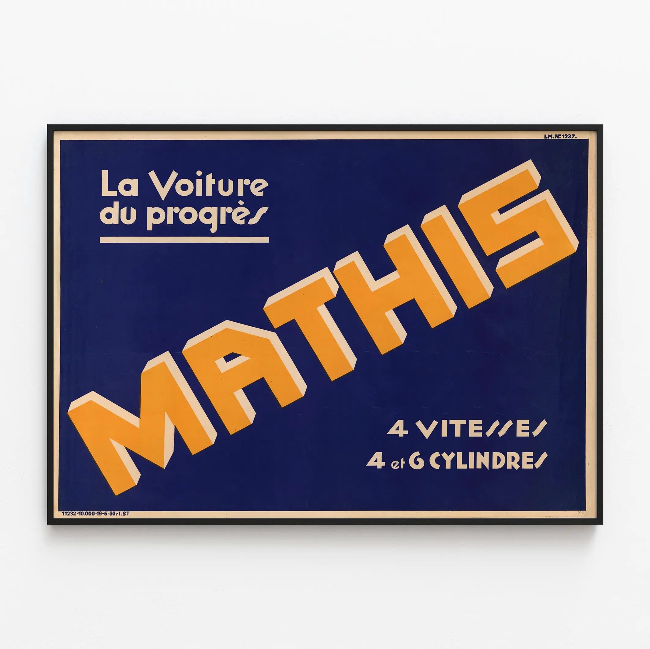 Cette affiche vintage met à l'honneur la marque Mathis avec le slogan « La Voiture du progrès ». Son design graphique simple et percutant utilise une dominante de bleu foncé en arrière-plan, mettant en lumière le nom 'MATHIS' en lettres volumineuses et orange avec un effet d'ombre blanche, créant un fort contraste visuel. L'inscription mentionne également "4 vitesses, 4 et 6 cylindres", soulignant la performance technique des voitures Mathis de l'époque. Cette affiche se distingue par son style typographique art déco, offrant une touche rétro et élégante qui séduira les passionnés d'automobile et de décoration murale vintage. Idéale pour une décoration murale industrielle ou un intérieur qui mise sur l'aspect historique de l'automobile, ce poster apporte couleur et authenticité. Elle s'intègre aussi bien dans un salon, un bureau ou un atelier pour les amateurs d'affiches anciennes. Ce tableau mural est une invitation au voyage dans le temps, reflétant l'évolution technologique automobile et le progrès mécanique. Une pièce unique qui combine art graphique et patrimoine industriel, parfaite pour une collection d'affiches ou un espace décoratif original.