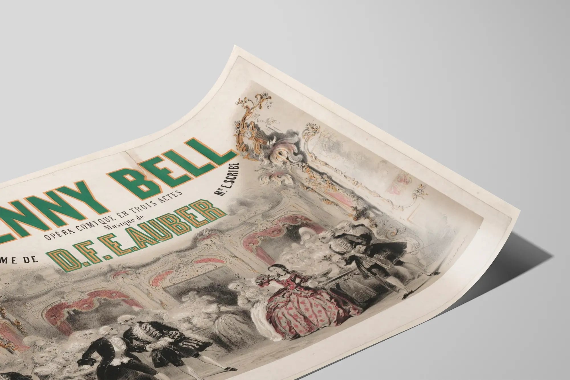 Cette affiche vintage met en avant l'opéra comique en trois actes intitulé « Jenny Bell », avec une composition musicale de D.F.E. Auber et un poème de M. E. Scribe. Ce poster de décoration murale illustre une scène élégante et animée d'un bal ou d'un salon appartenant à une époque ancienne, où des personnages en costume d'apparat se trouvent dans un décor richement ornementé. Les tons dominants sont le noir et blanc rehaussés de touches de rouge sombre sur la robe d'une femme au centre et des ornements dorés sur les bords, apportant un équilibre entre sobriété et éclat visuel. La typographie du titre occupe une place majeure, avec un lettrage en vert encadré d'orange, qui attire immédiatement l'œil et souligne l'importance du spectacle présenté. Cette affiche fait office de témoignage graphique du théâtre et de la musique classiques, idéale pour une décoration murale vintage ou un intérieur inspiré par l'histoire de l'art dramatique et lyrique. En tant qu'objet de décoration, elle apporte une touche artistique et culturelle, s'intégrant parfaitement dans un salon, un bureau ou une bibliothèque, où une ambiance raffinée et historique est souhaitée. Ce poster est parfait pour les amateurs d'opéra, les passionnés d'histoire du spectacle, ainsi que pour ceux qui recherchent une affiche originale au style rétro et authentique. Son visuel détaillé et ses couleurs vieillies témoignent d'un travail lithographique de qualité, soulignant le charme des affiches anciennes tout en conservant une lecture claire des informations textuelles et graphiques. Cette œuvre décorative murale trouve sa place dans une collection d'affiches théâtrales ou musicales, pour sublimer tout espace dédié à la culture et aux arts.