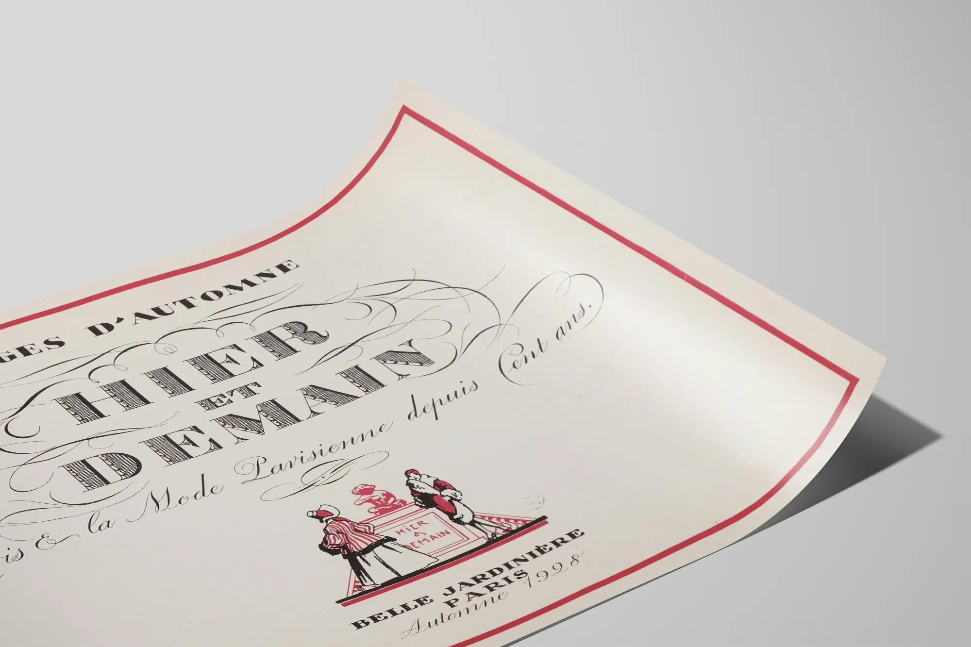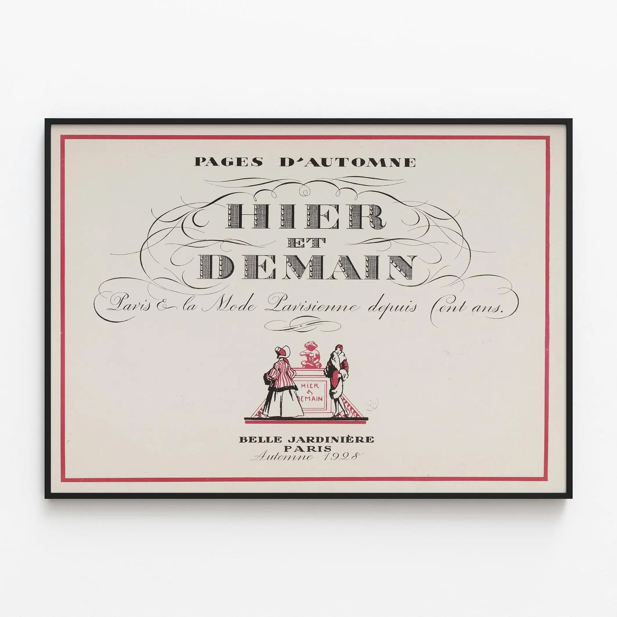 Apportez une touche d'élégance rétro à votre décoration murale avec cette affiche vintage intitulée « Pages d'Automne ». Représentant l'esprit et la mode parisienne depuis cent ans, ce poster évoque un charme classique et intemporel, idéal pour les amateurs d'histoire de la mode et de design d'intérieur. Le texte calligraphié avec soin, les motifs ornementaux délicats et le contraste subtil de couleurs rouge et noir soulignent un style vintage très raffiné. Cette décoration murale, qui s'inspire de la mode parisienne à l'automne 1928, s'intégrera parfaitement dans un intérieur au style classique, bohème ou industriel, ajoutant une atmosphère authentique et culturelle. Le cadre rouge simple encadre joliment le visuel, accentuant le caractère ancien et le style artistique de cette affiche. Le dessin central montre deux personnages en costumes d'époque devant une sculpture, symbolisant le lien entre « Hier et Demain ». Ce poster est une belle idée pour rehausser vos murs dans un salon, un bureau ou une chambre, apportant une touche de nostalgie parisienne à votre décoration. Pour les passionnés de décoration murale, ce tableau au style graphique et typographique vintage sera une pièce maitresse qui enrichira votre collection d'affiches. Grâce à ses dimensions et sa composition soignée, cette affiche se distingue par son élégance et son allure artistique, parfaite pour affirmer une ambiance historique et culturelle dans vos espaces à vivre. Ce produit est également un cadeau idéal pour les amateurs de mode, d’histoire et d’art graphique, en quête d’une décoration murale au style authentique et chargé de sens.