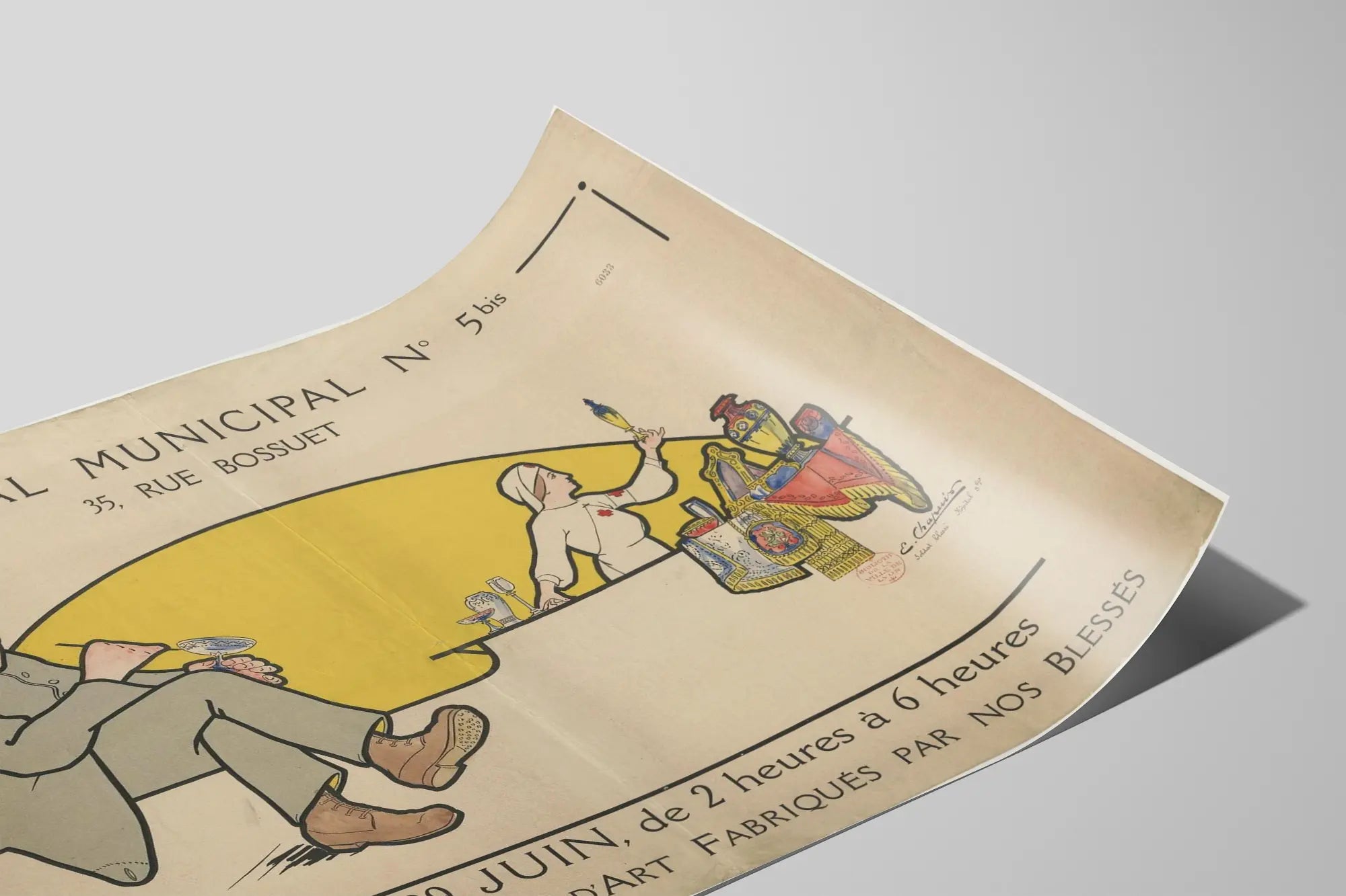 Cette affiche ancienne, conçue pour promouvoir la vente d'objets d'art fabriqués par des blessés de guerre, est un exemple saisissant de décoration murale historique. Avec un style graphique épuré et des couleurs sobres, elle illustre un soldat en uniforme en train de peindre un objet décoratif, tandis qu'une infirmière présente un vase dans un décor de table richement orné. Ce poster est idéal pour les amateurs de décoration murale vintage et ceux qui apprécient les affiches historiques à fort caractère visuel et humain. L'inscription en haut indique que l'événement a lieu à l'Hôpital Municipal n° 5bis au 35, rue Bossuet, soulignant le lieu précis de cette opération artistique et sociale. En bas de l'affiche, la date et l'heure de la vente sont affichées : « Jeudi 29 juin, de 2 heures à 6 heures », apportant un contexte temporel précis à cette scène. Cette œuvre combine à la fois un message de bienveillance à travers la solidarité envers les blessés, et une invitation à découvrir des objets d'art uniques, confectionnés à la main, dans un cadre hospitalier. Parfait pour être encadrée comme tableau décoratif, cette affiche diffuse un message puissant tout en enrichissant votre espace intérieur d'une touche d'authenticité et d'histoire. En tant que décoration murale, elle s'adresse aux collectionneurs d'affiches anciennes, aux passionnés d'art et à tous ceux qui cherchent à intégrer une ambiance rétro avec une signification profonde, liée à la résilience et à la créativité en période de guerre.